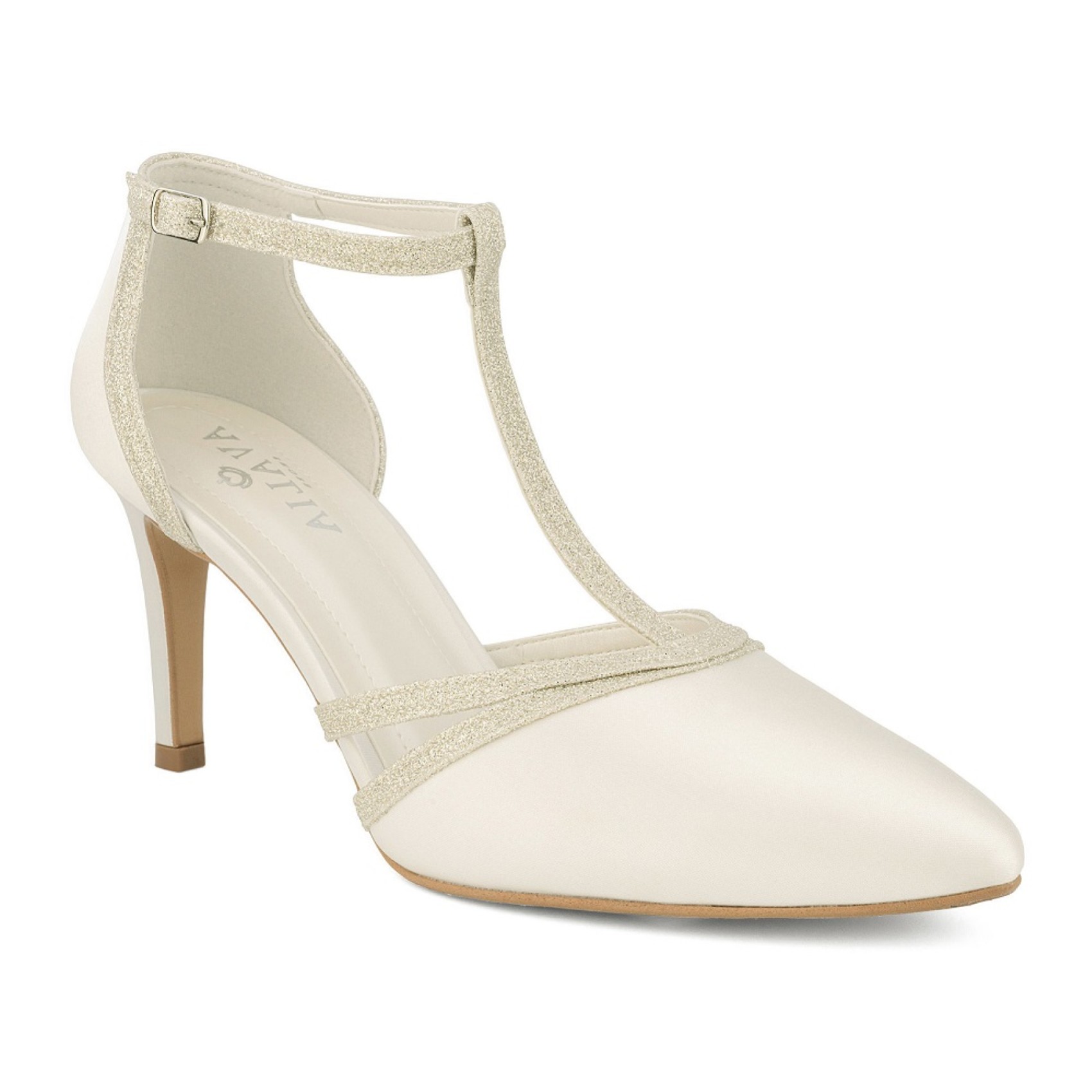 Tout nouveau pour 2020, nous pensons que cette élégante bride en T d'Avalia va faire fureur ! Cette magnifique chaussure de mariée fabriquée à la main en satin ivoire est dotée d'un élégant bout pointu et d'une bride en T scintillante et argentée. Ces superbes chaussures à talons sont tout aussi étonnantes avec un jean pour une soirée entre filles !