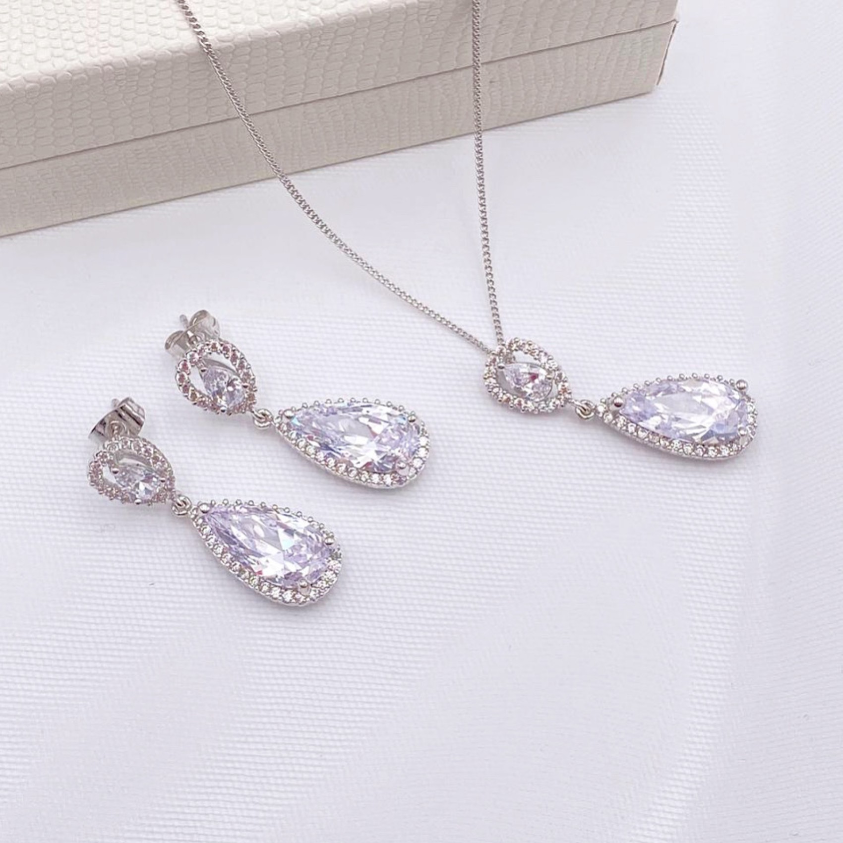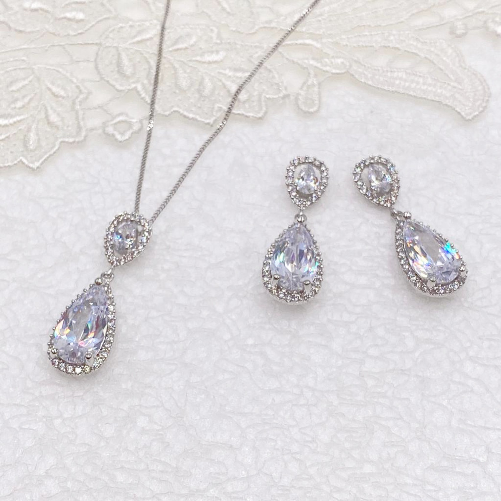 Une parure de mariage élégante et intemporelle. Des pierres en forme de gouttes rayonnantes, entourées de cristaux, sont suspendues à un cristal en forme de goutte à facettes plus large, orné de minuscules cristaux sertis en pavé. Étincelante comme un diamant, cette magnifique parure en zircon cubique ne manquera pas de faire parler d'elle.