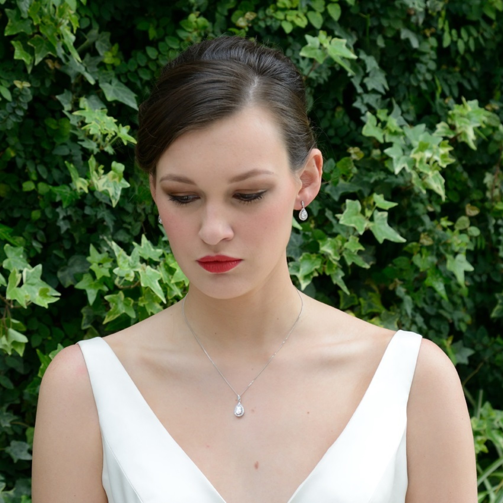 Cette magnifique parure de mariage en argent est un choix classique et sophistiqué. Les pierres en forme de goutte d'eau à facettes scintillantes sont entourées de minuscules cristaux sertis en pavé pour un éclat des plus séduisants. La parure Belmont constitue le plus beau des cadeaux de mariage.