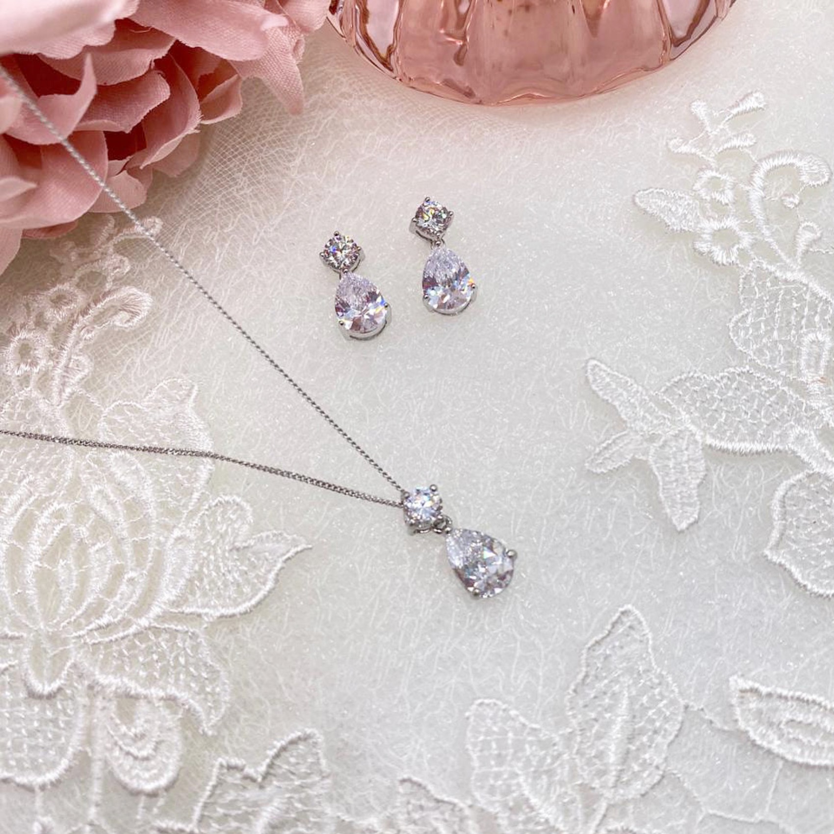 Cette parure simple en zircon cubique est un classique intemporel. Elle est composée de pierres en zircon cubique de type solitaire et en forme de perle scintillantes dans un design élégant en forme de goutte d'eau. Élégante et polyvalente, cette parure de mariage en cristal est un choix populaire pour les mariées et les demoiselles d'honneur.
