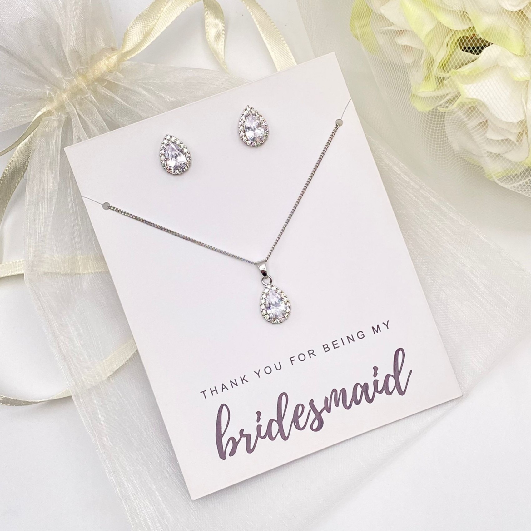 Cette magnifique parure en zircon cubique est le moyen idéal de remercier vos filles préférées. Une délicate parure de bijoux en cristal poire en argent composée de boucles d'oreilles chic et d'un pendentif assorti sur une carte de présentation portant la mention "merci d'avoir été ma demoiselle d'honneur".