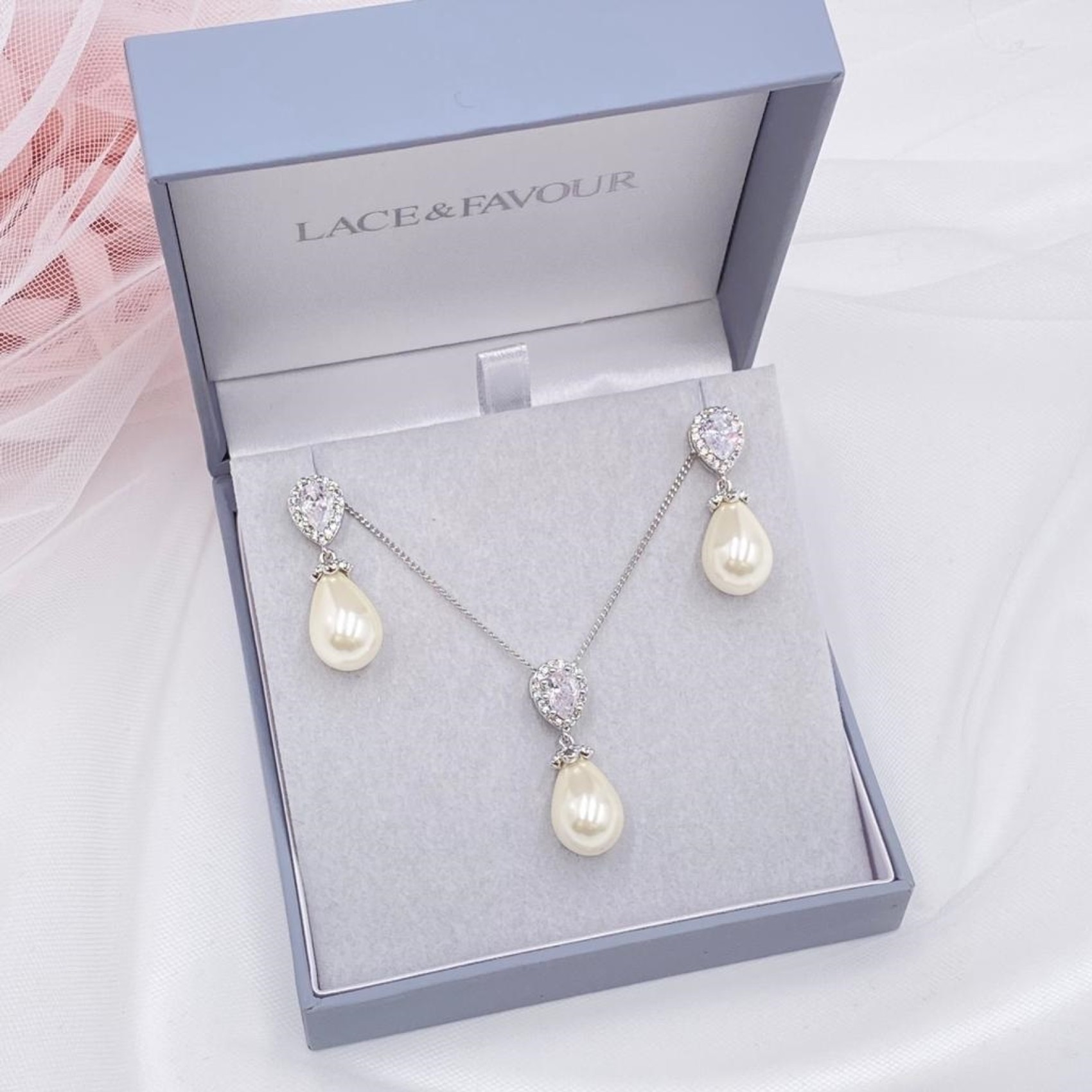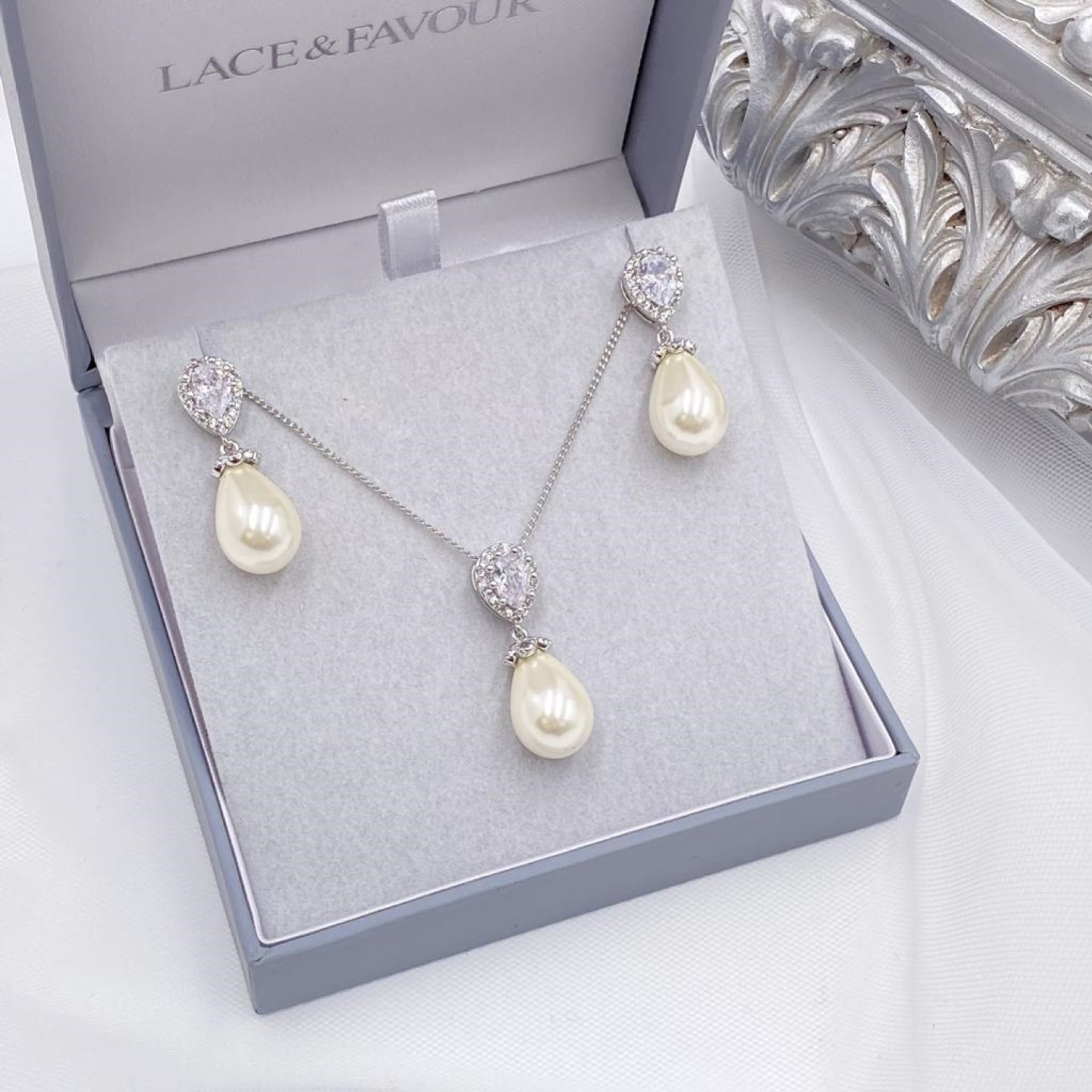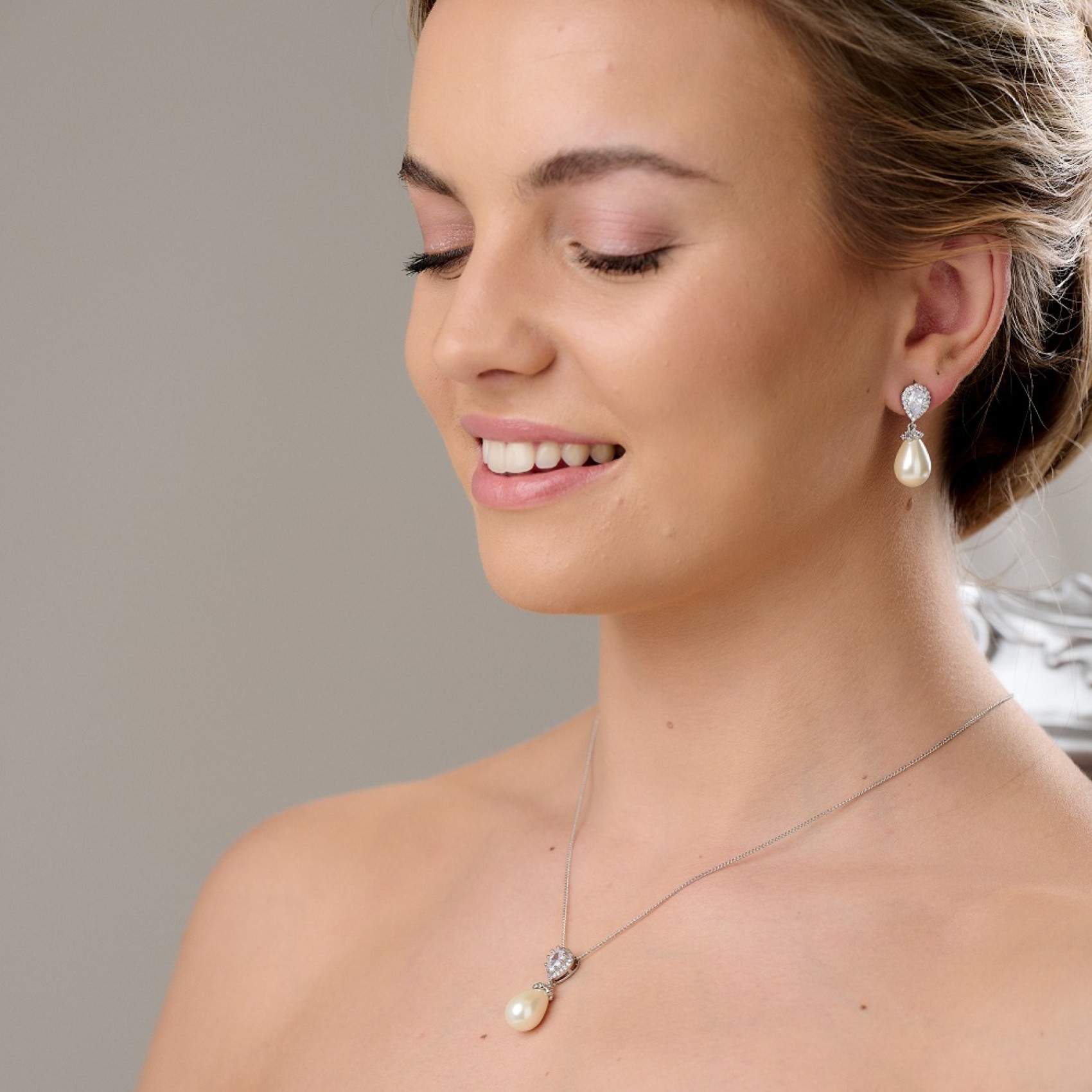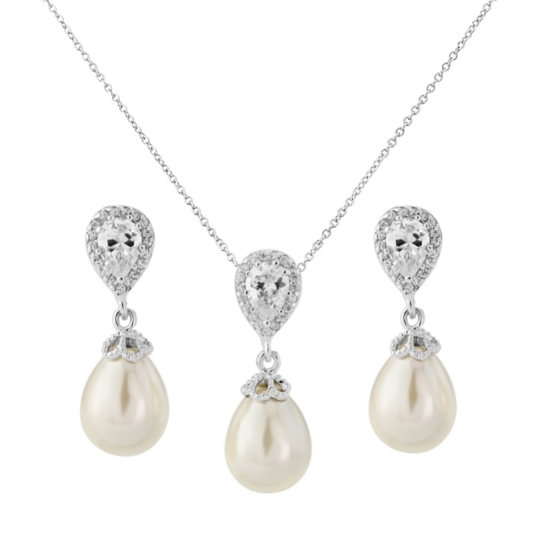 Toutes les mariées aiment Paloma ! Cette parure de mariage intemporelle et élégante est composée de cristaux de zirconium cubique clairs et d'une perle en forme de goutte d'eau de couleur ivoire. Cette magnifique parure de mariage est parfaite pour tout look de mariée.