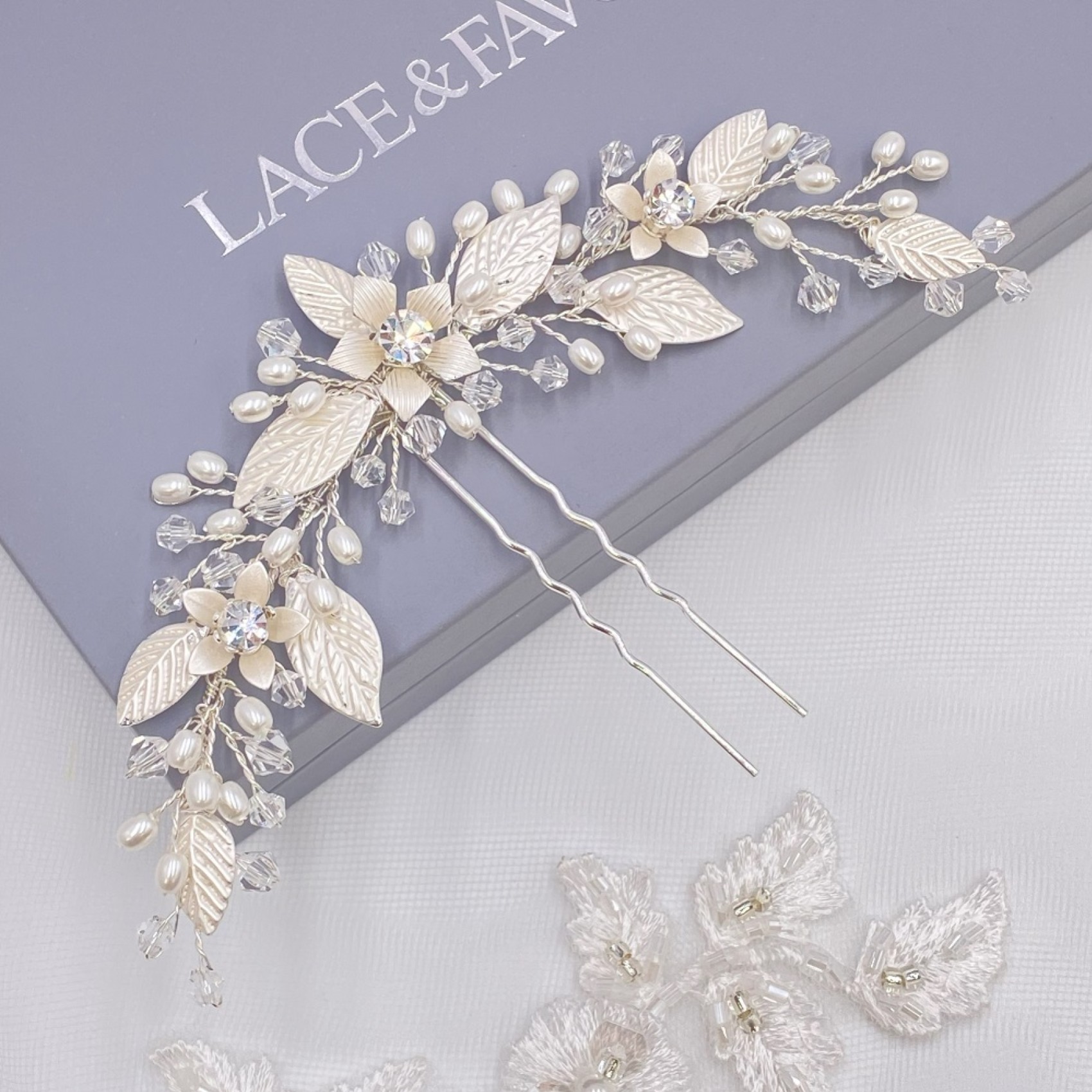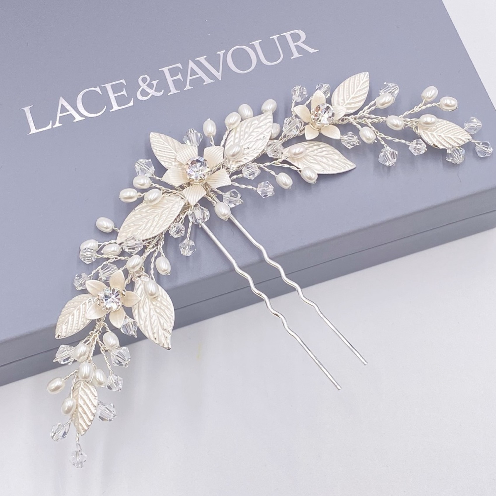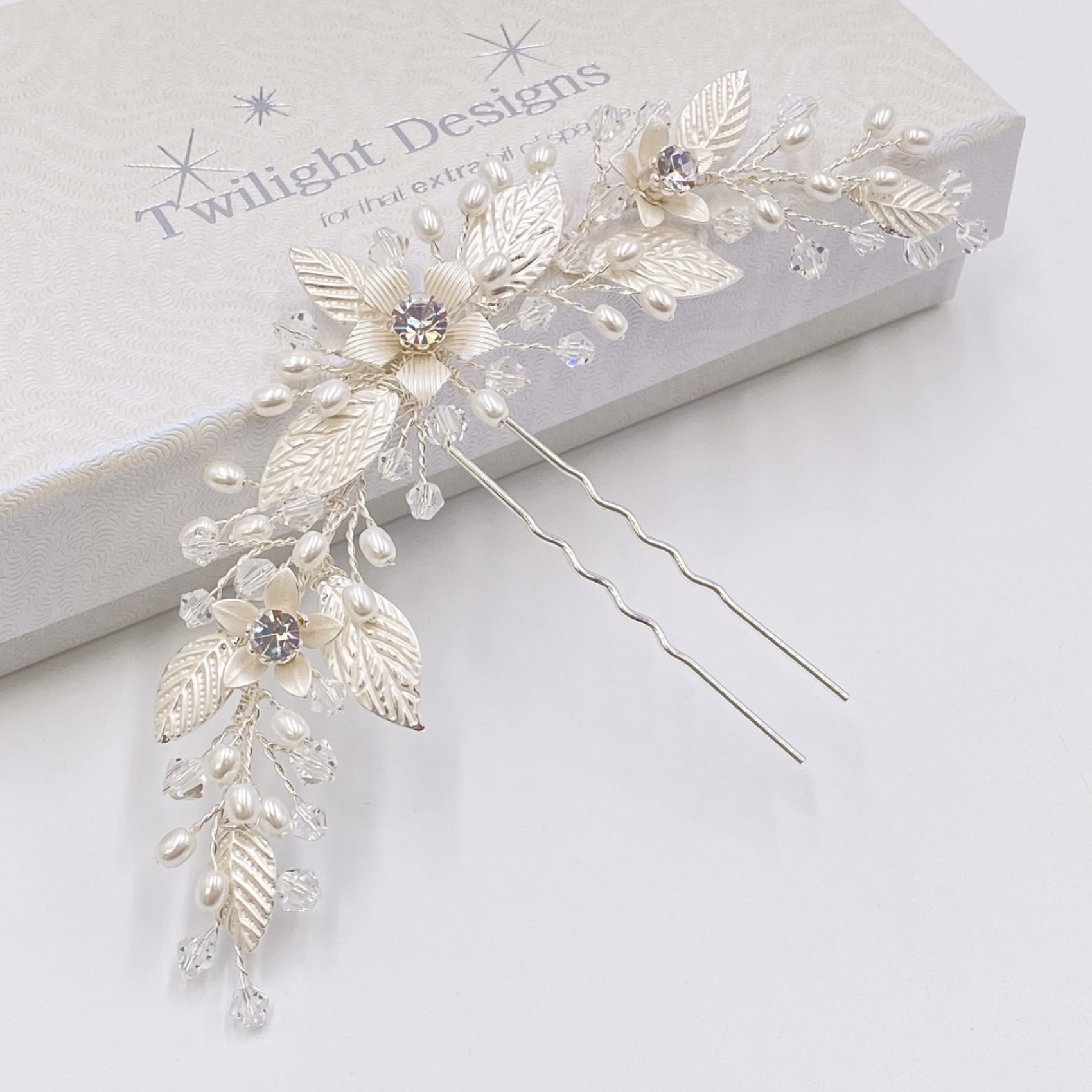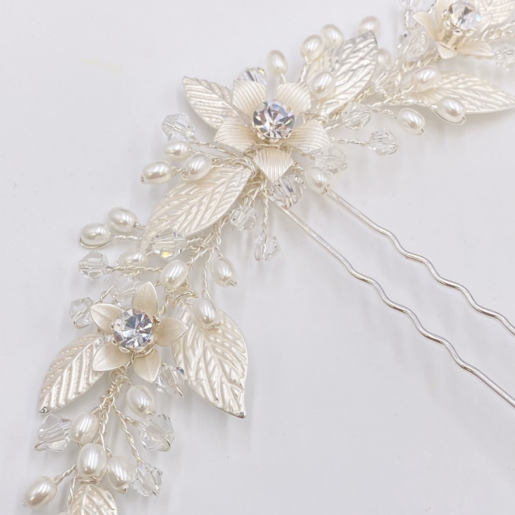 Notre épingle Carlene est le plus joli petit ajout aux cheveux des mariées ou des demoiselles d'honneur. Elle est ornée de délicates feuilles et fleurs en argent pâle disposées de manière symétrique et finies par de minuscules perles d'eau douce ivoire et des perles bicônes transparentes. Chaque fleur est ornée d'un cristal solitaire scintillant pour une touche d'éclat subtil.