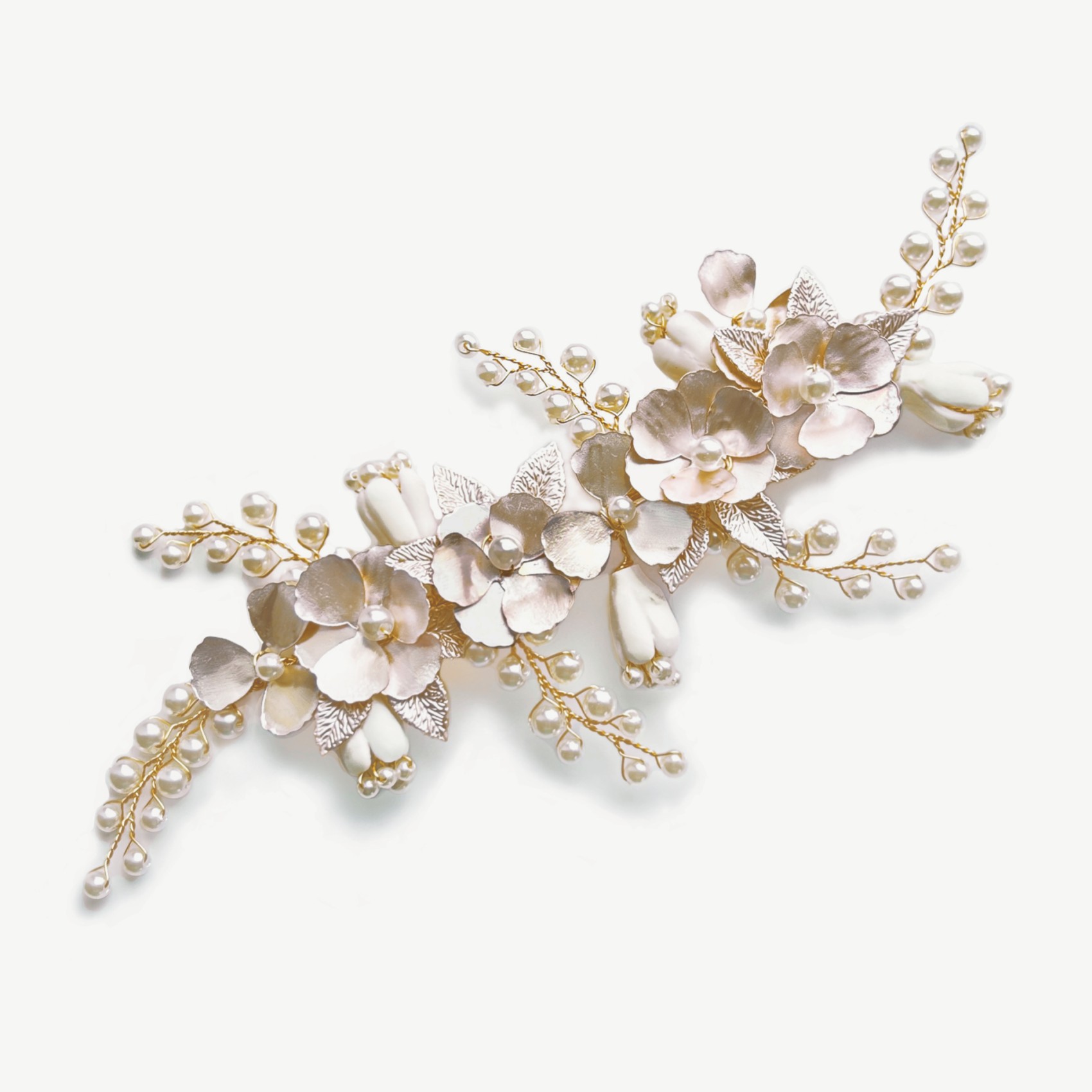 Une magnifique pince à cheveux florale unique, composée de fleurs et de feuilles délicates émaillées à la main et finies par des brins de fausses perles ivoire. Fraîche et informelle, cette coiffe est parfaite pour les mariages romantiques ou bohèmes.