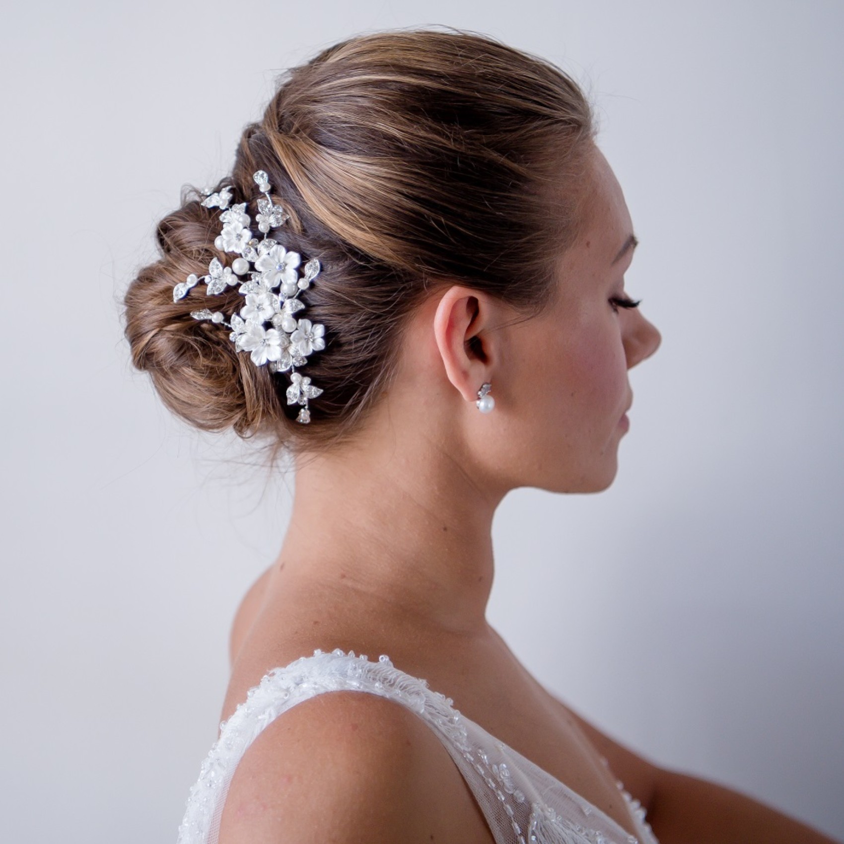 Pince à cheveux de mariage Magnolia en porcelaine avec fleurs et feuilles de cristal | TLH3051