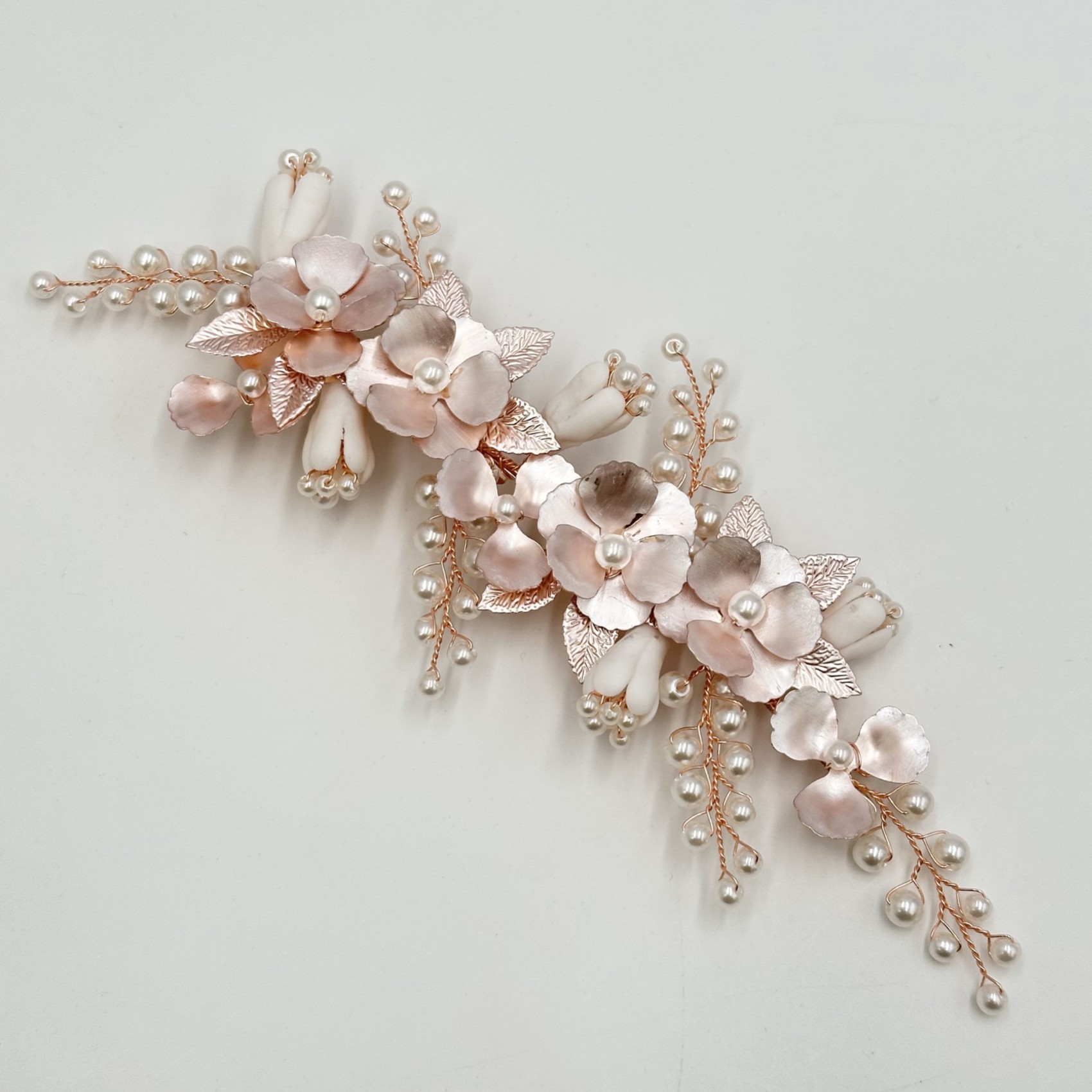 Cette magnifique pince à cheveux florale est composée de fleurs et de feuilles délicates émaillées à la main en or rose et finies par des brins de fausses perles ivoire. Fraîche et informelle, cette coiffe est parfaite pour les mariages romantiques ou bohèmes.