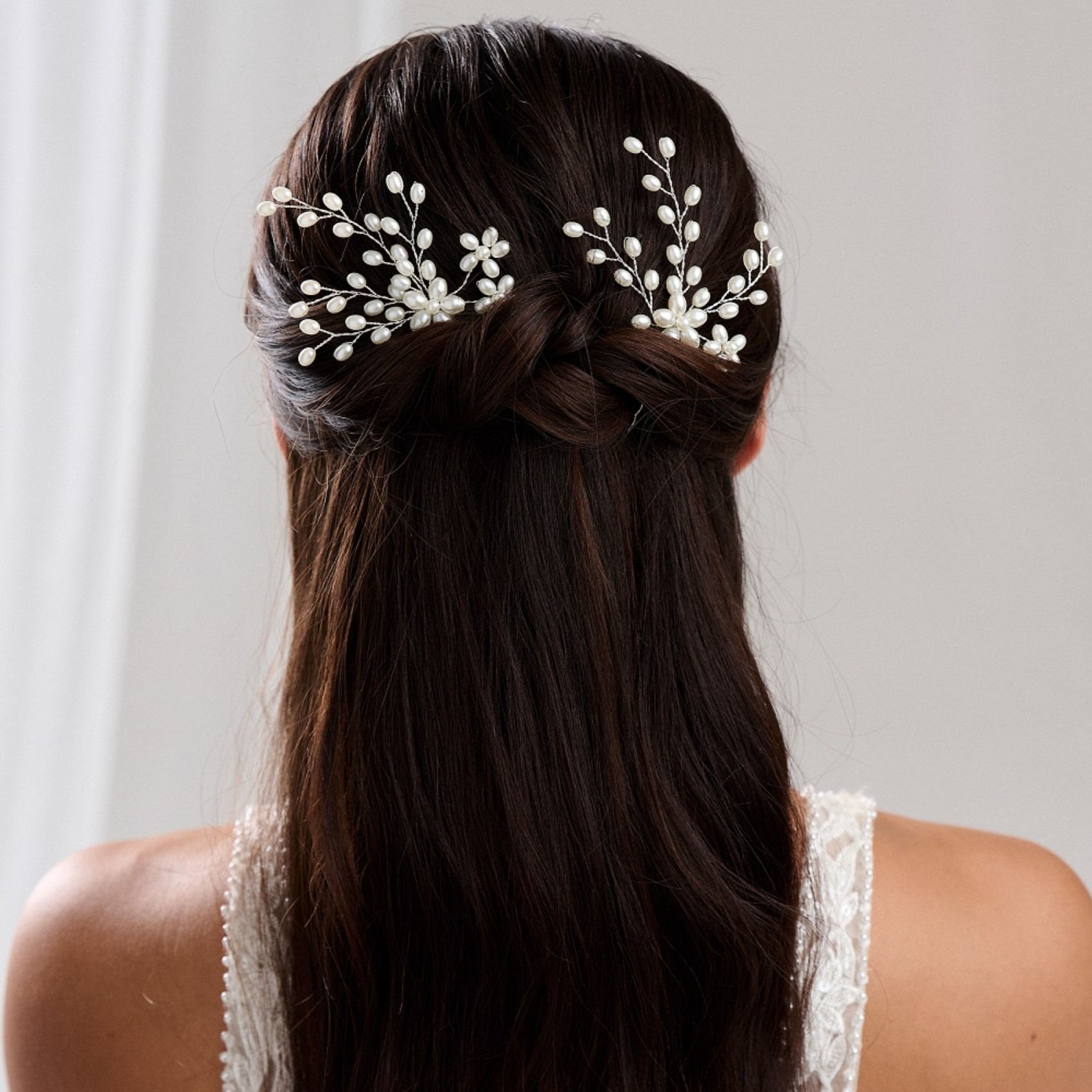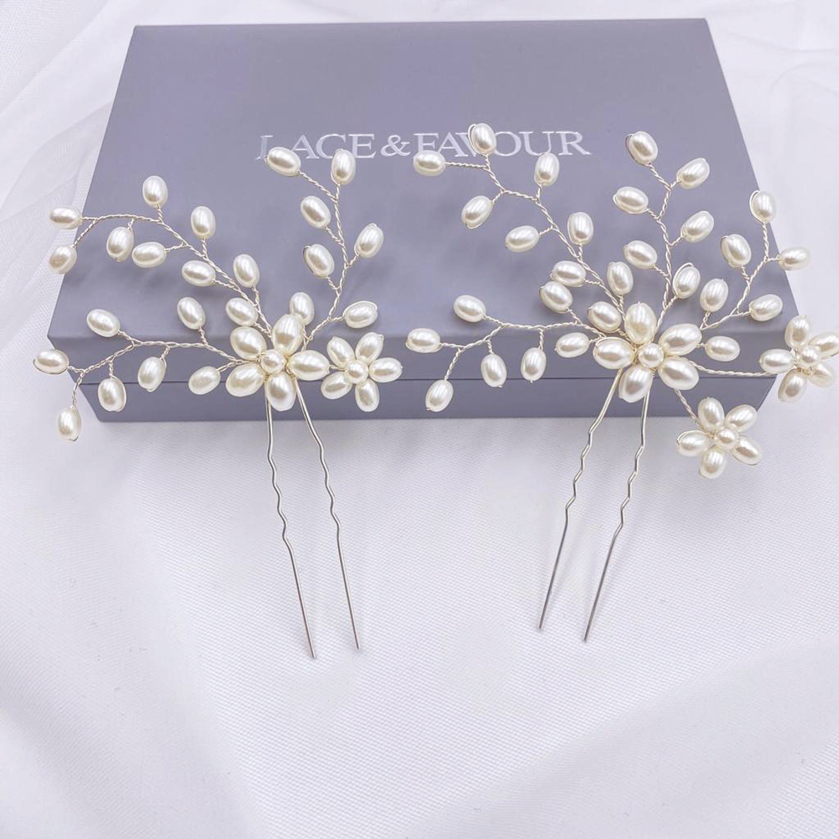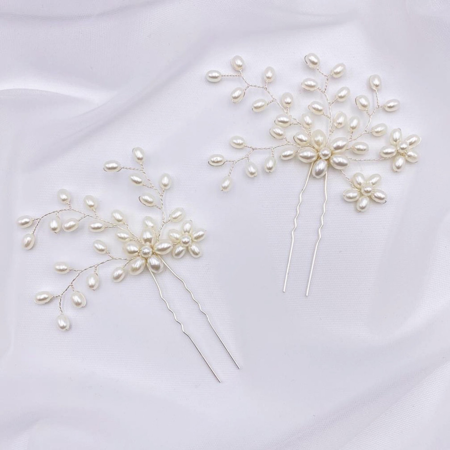 Un magnifique ensemble de deux épingles à cheveux de mariage en spray de perles. Chaque épingle est légèrement différente pour ajouter de l'intérêt à la coiffure, en les regroupant ou en les plaçant de chaque côté de la tête. Associez-les au peigne à cheveux Cascade assorti pour plus d'impact.