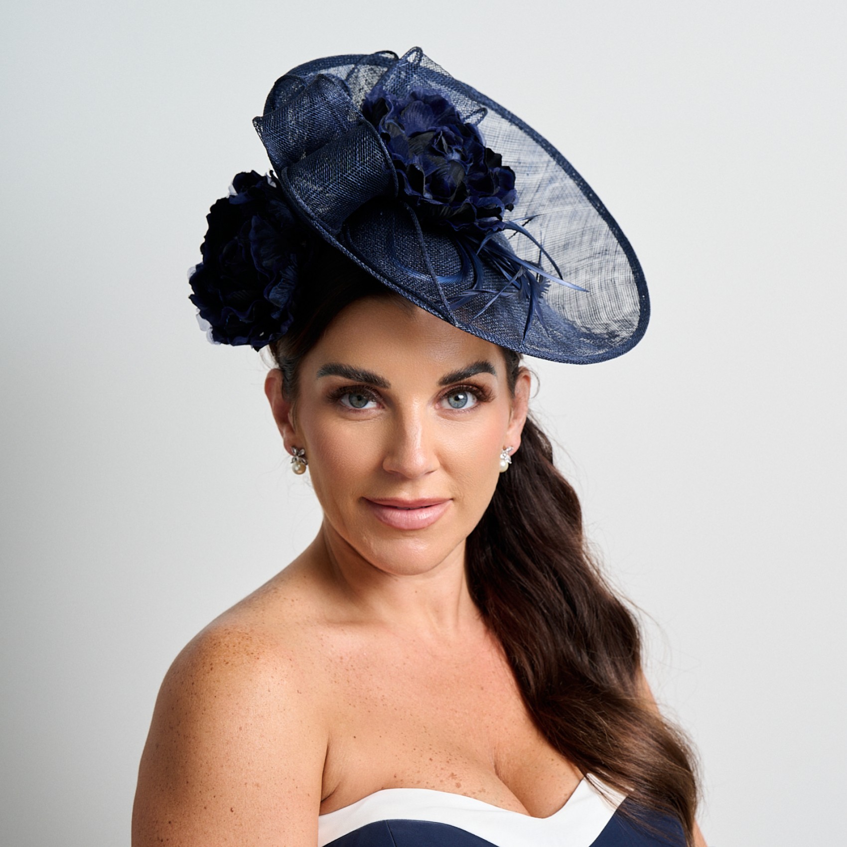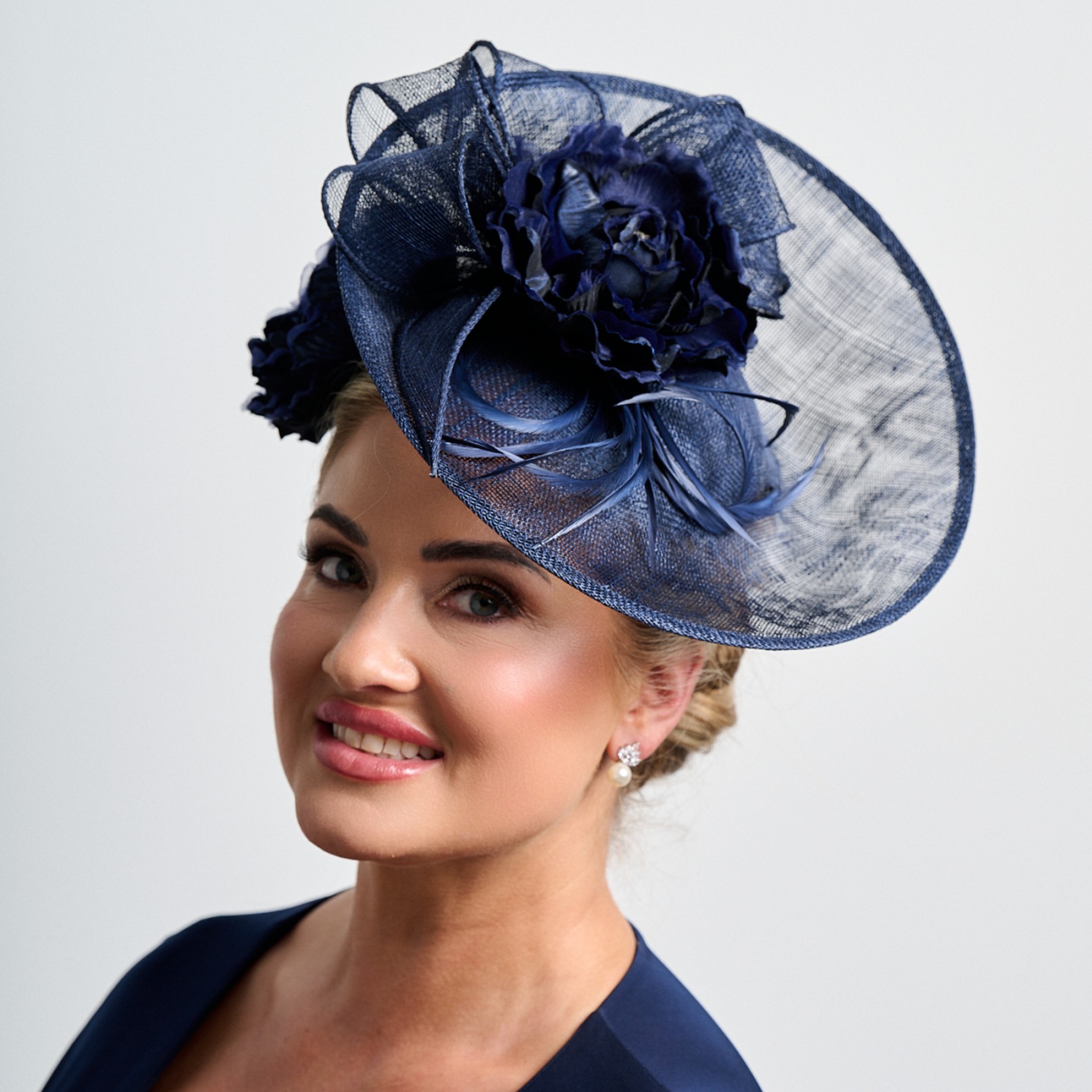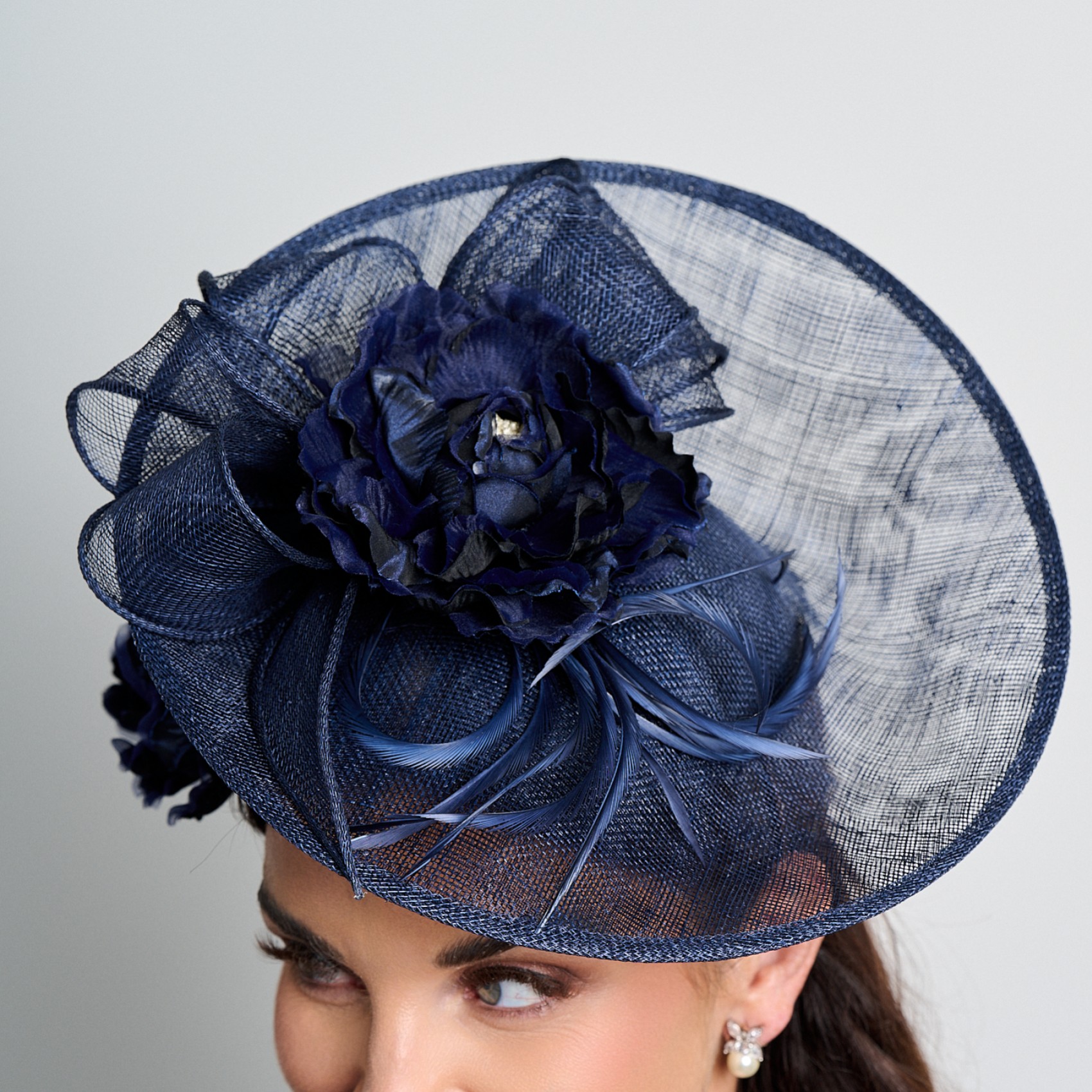 Fascinateur de mariage à large disque en sinamay et à motif floral bleu marine | 15-12036-37