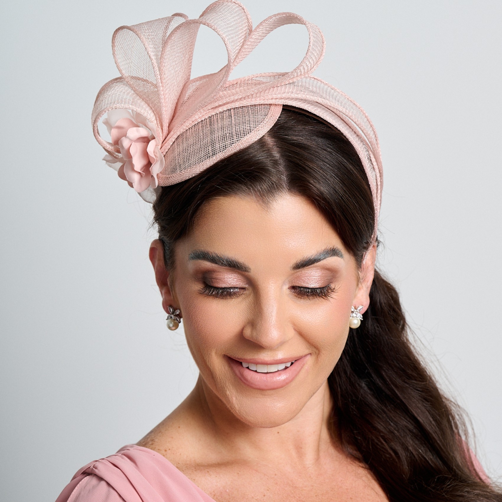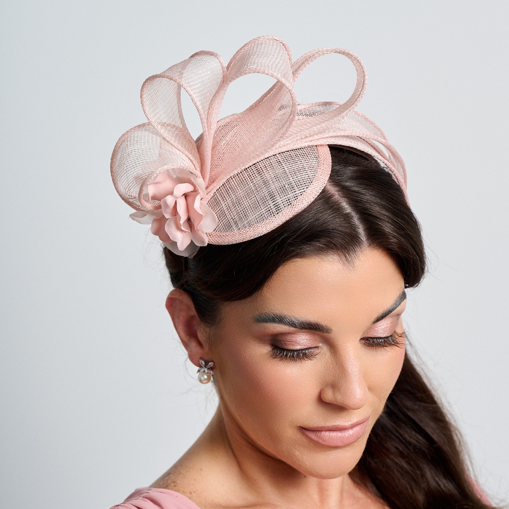 Un fascinateur de mariage simple, de couleur rose chair, fabriqué à partir d'une petite base légère en sinamay et décoré de plis doux en sinamay et d'une petite fleur en guise de finition. Ce fascinateur en sinamay joliment structuré est attaché à un bandeau discret et confortable pour faciliter son port. Des mariages aux courses, cet élégant fascinateur rose chair est parfait pour toutes les occasions spéciales. Un choix élégant pour la mère de la mariée, le marié ou l'invité du mariage, ce fascinateur ajoutera la touche finale parfaite à votre tenue.