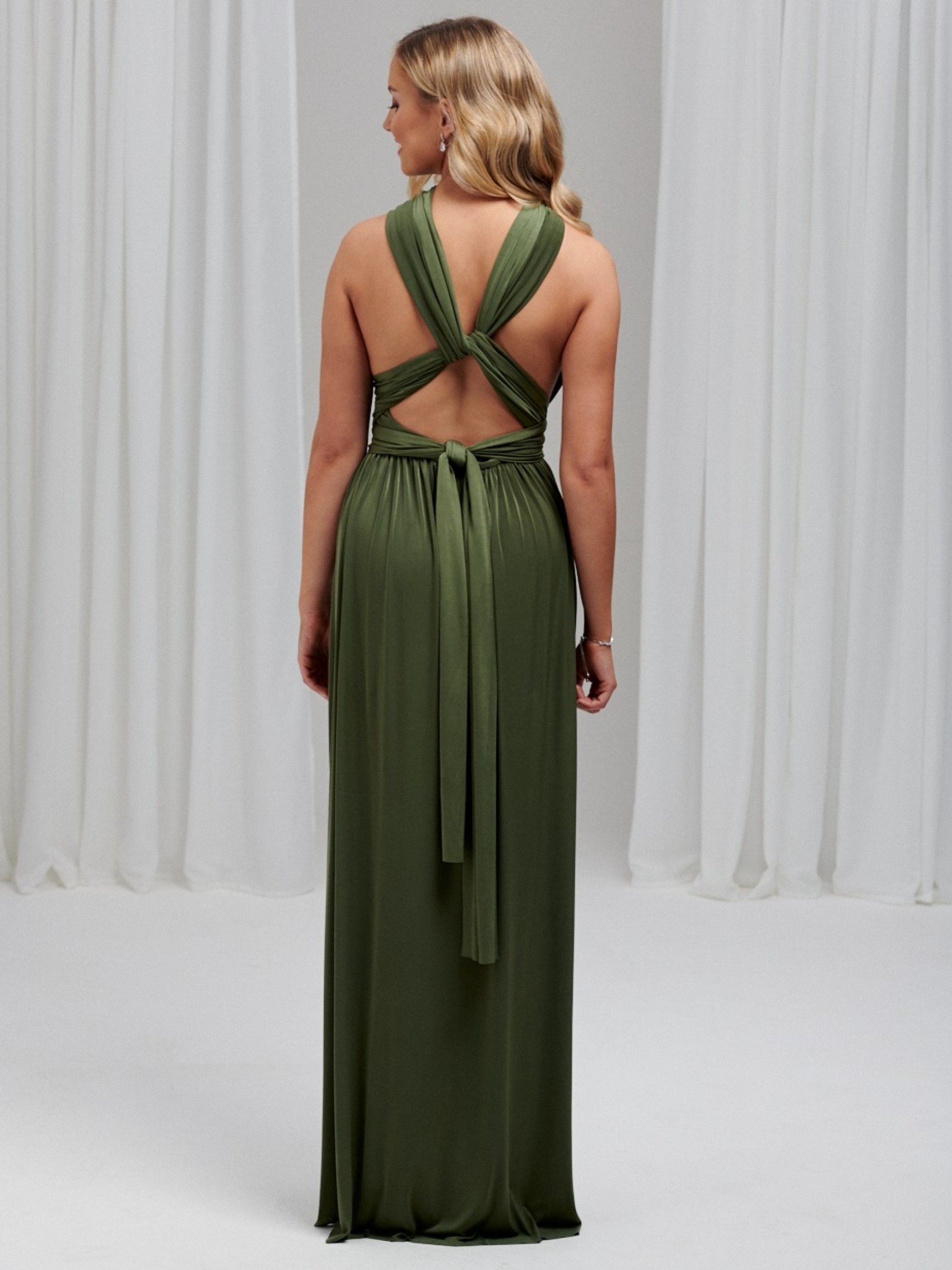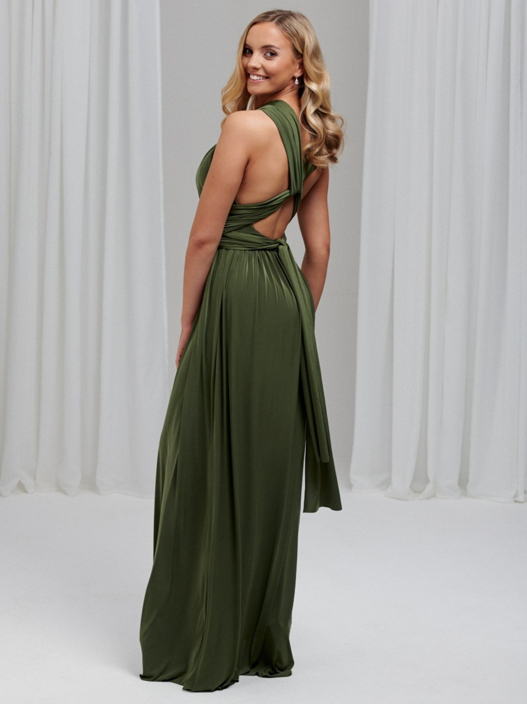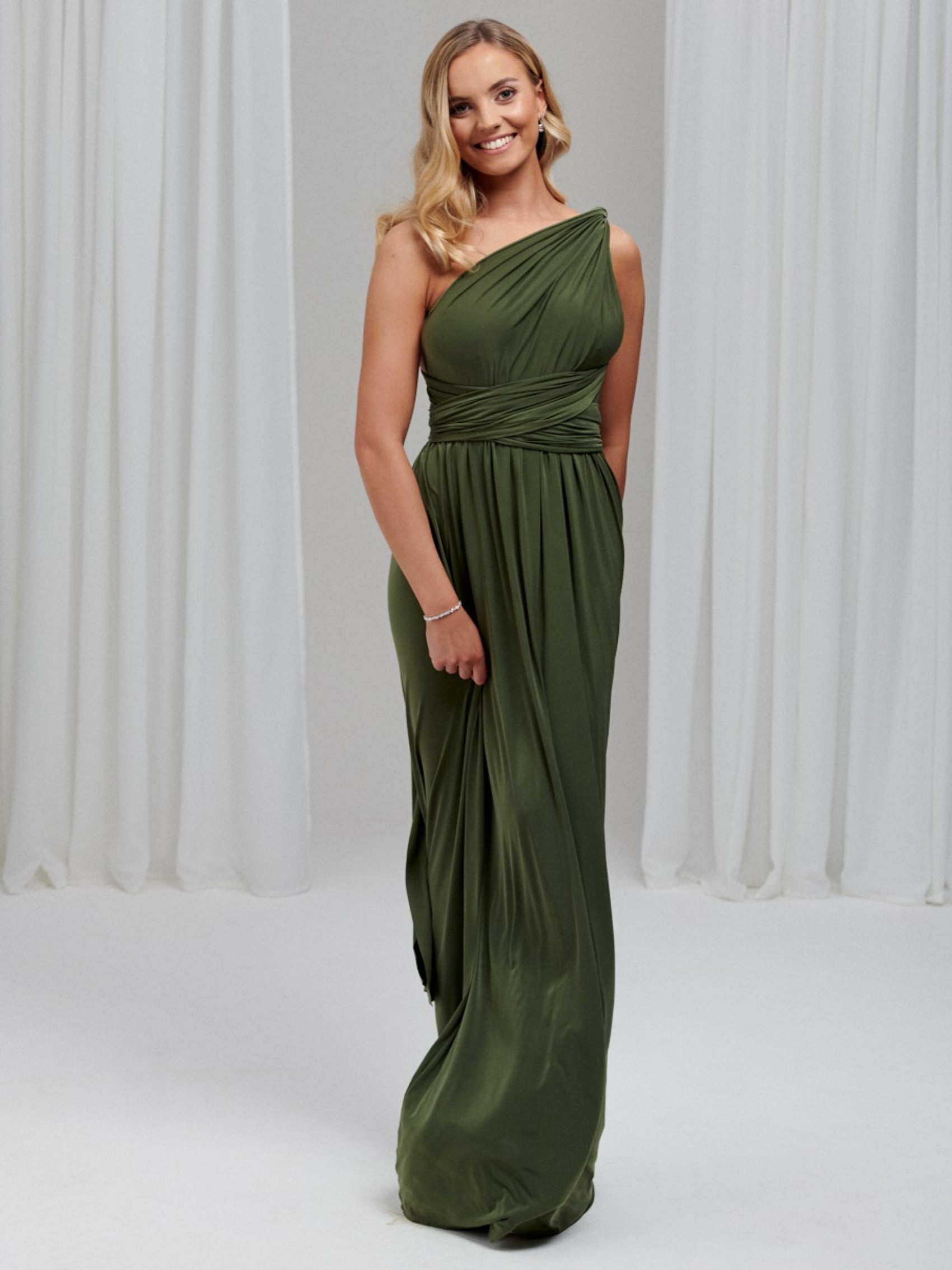 Notre luxueuse robe de demoiselle d'honneur multivoie vert olive en stock est la solution parfaite pour toutes vos demoiselles d'honneur. Fabriquée à la main à partir d'un tissu extensible très épais, cette robe maxi multi-couches taille unique est très douce au toucher et peut être portée d'innombrables façons différentes pour convenir à toutes les tailles et à toutes les silhouettes. Les robes de demoiselle d'honneur Infinity sont parfaites pour les mariées qui ne savent pas quel style de robe choisir (vous pouvez littéralement décider le matin du mariage !) Elles constituent également la robe de demoiselle d'honneur idéale pour les femmes enceintes, car la ceinture extensible peut être placée au-dessus du ventre