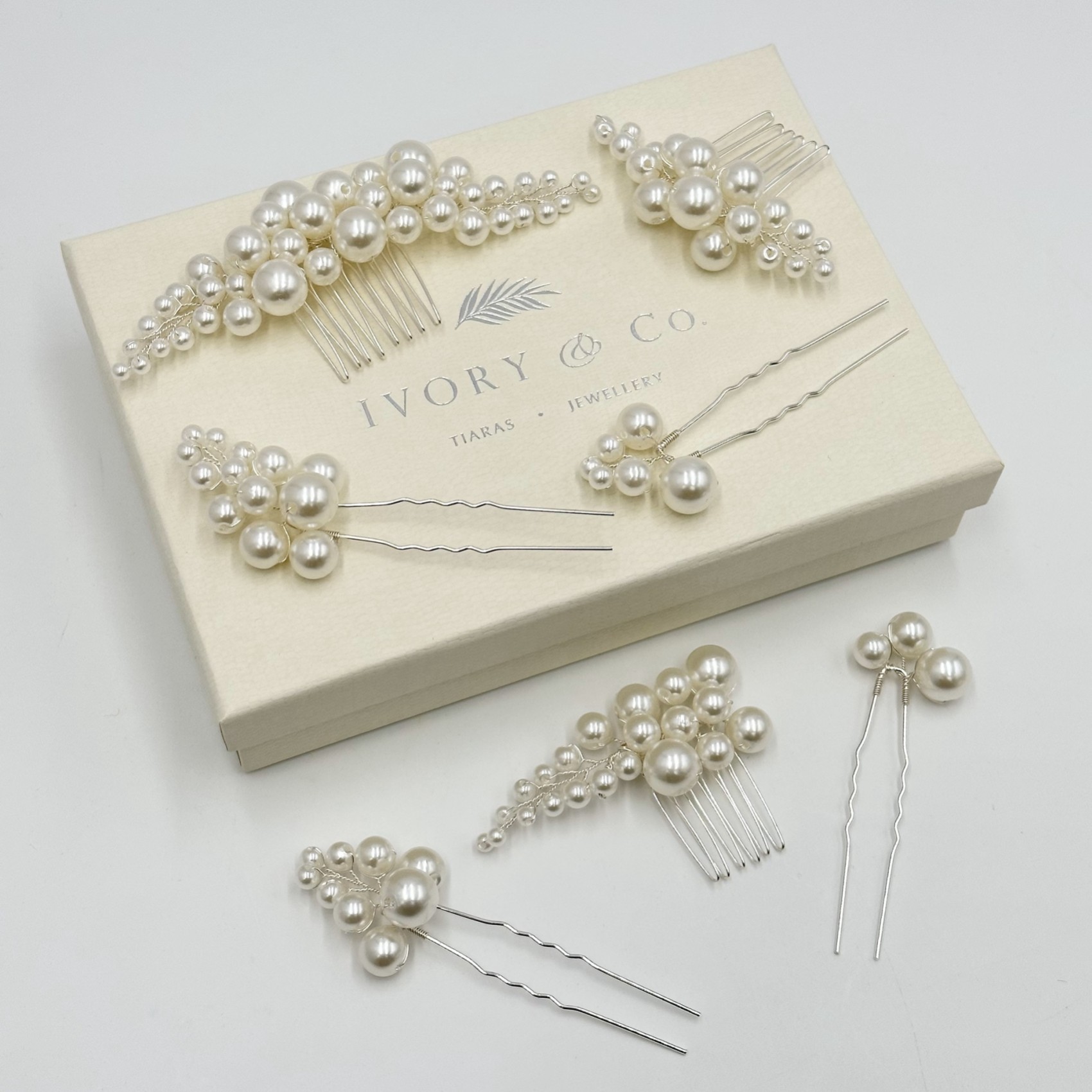 Un magnifique set de 7 peignes et épingles à cheveux en fausses perles ivoire. Parfait pour les mariées à la recherche d'un look frais et moderne, ce set est très polyvalent et peut être porté dans de nombreuses coiffures différentes. Avec tout ce qu'il contient, ce set est d'une valeur incroyable et peut être divisé en groupes de pièces pour une mariée et d'autres utilisées pour les demoiselles d'honneur !