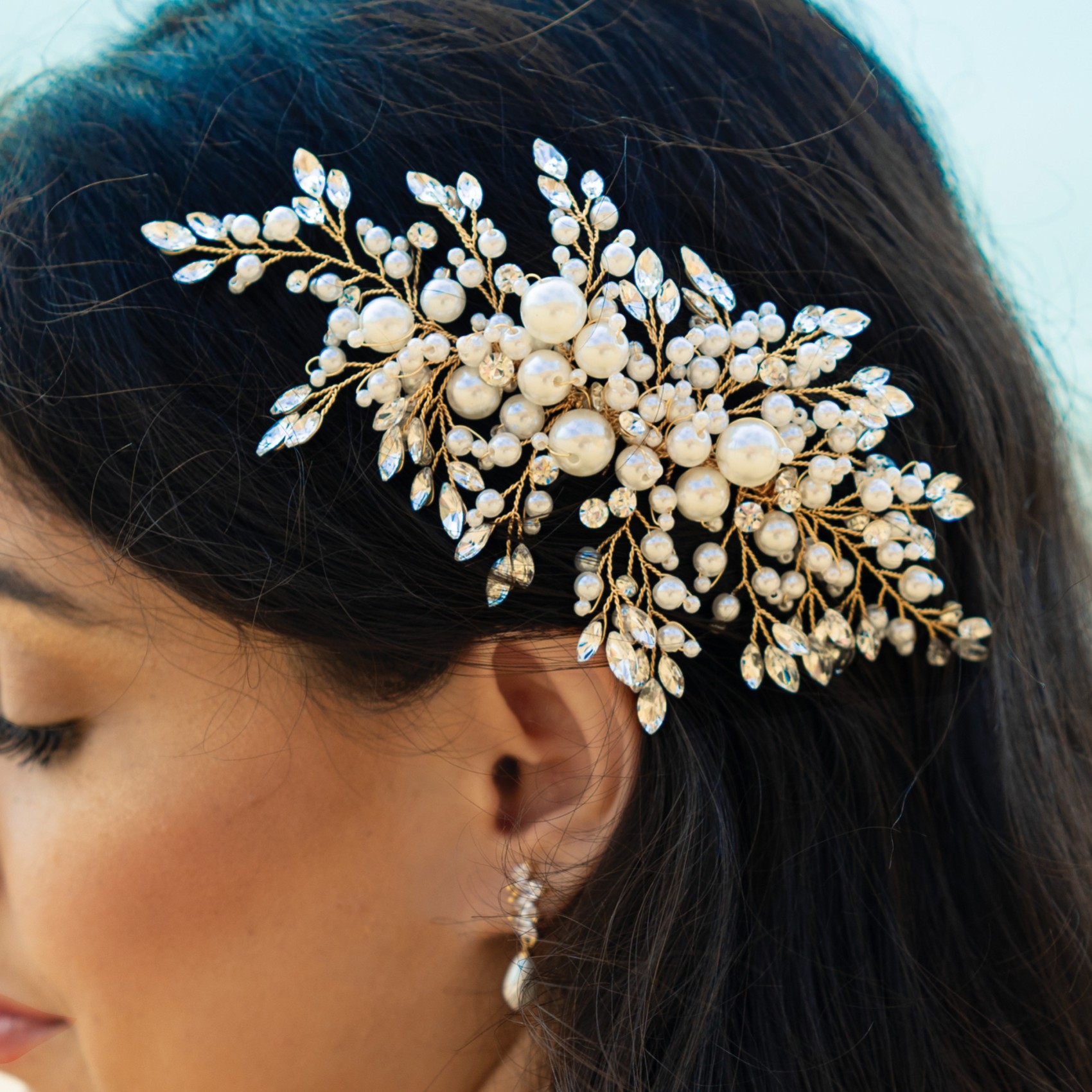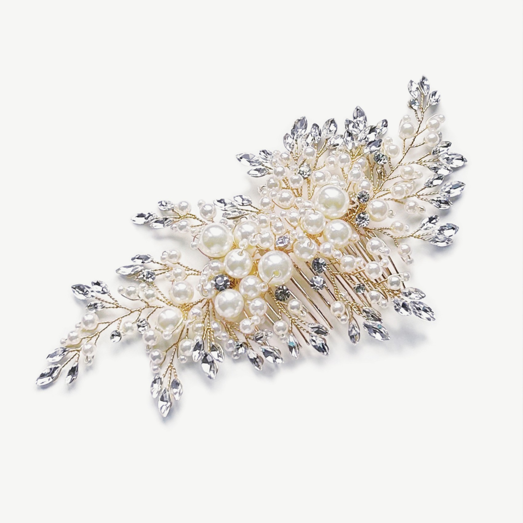 Un magnifique peigne à cheveux de mariage éblouissant en forme de grappe. Des cristaux marquises taillés entourent des perles artificielles ivoires pour créer une pièce au style moderne et frais. Ce peigne en or est magnifique sur l'arrière de la tête ou sur le côté d'une coiffure. Il est parfait pour les mariées qui recherchent un accessoire sophistiqué avec un peu de glamour.