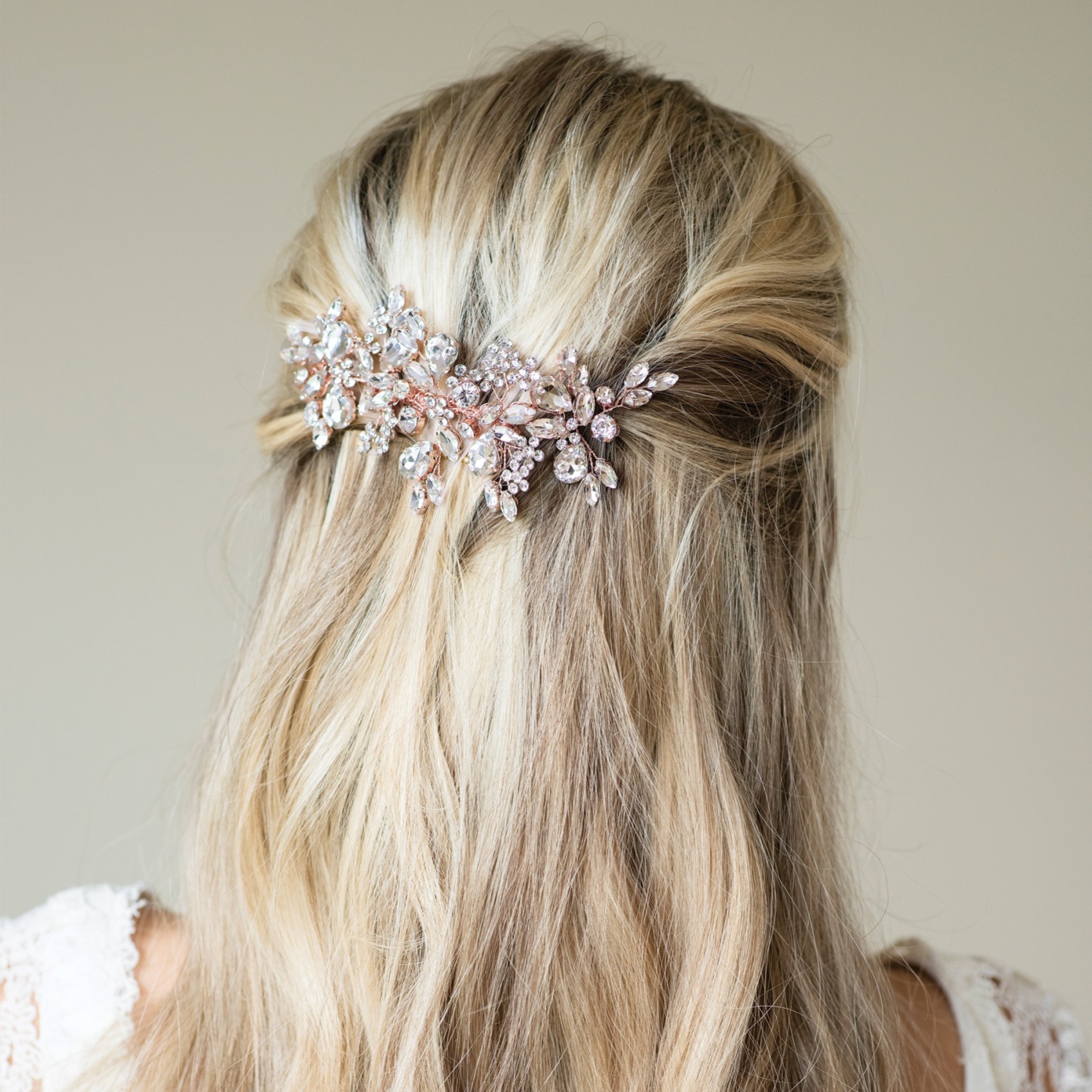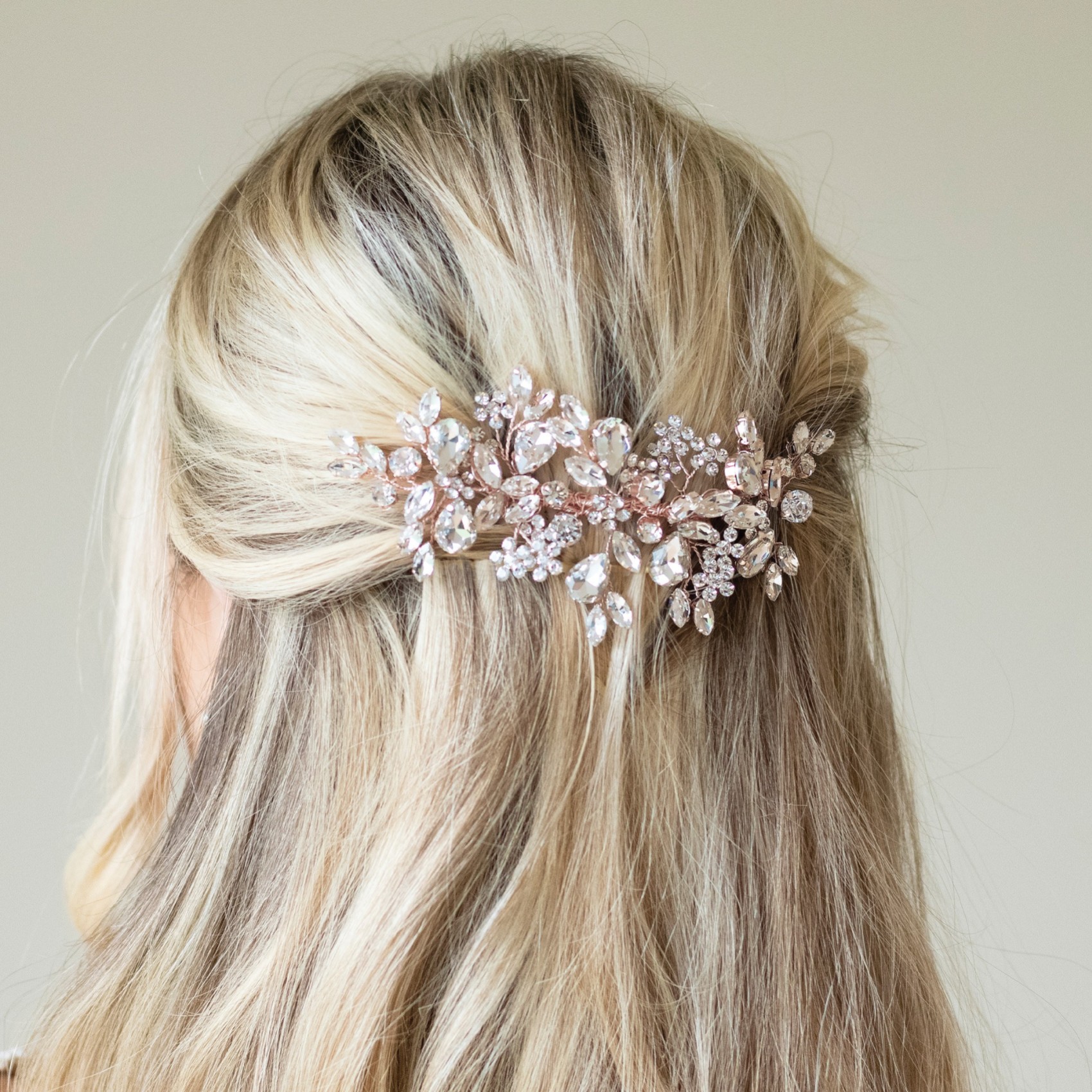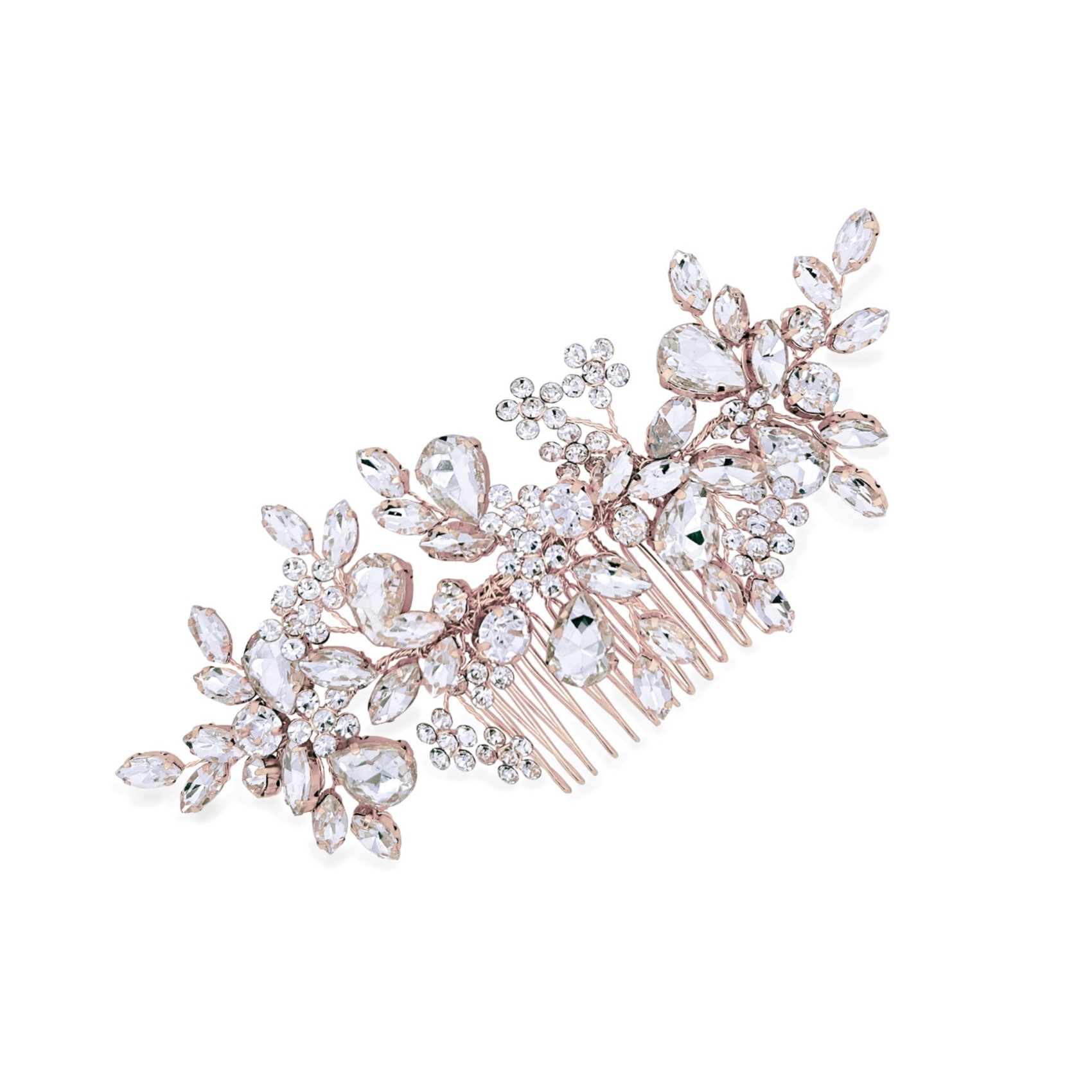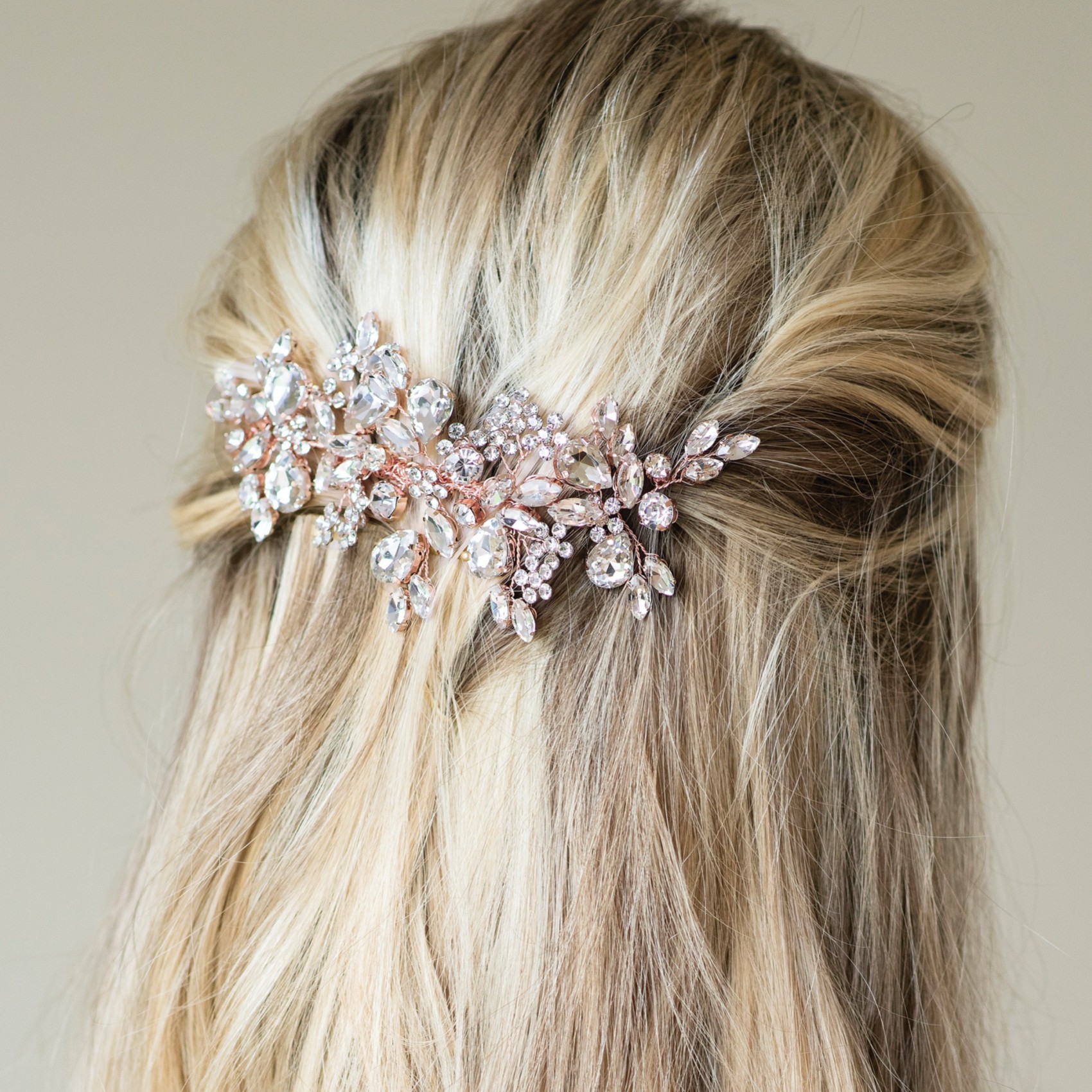 Un superbe peigne à cheveux de mariage en cristal d'or rose composé de pierres taillées en solitaire et de strass sertis dans un design étincelant d'inspiration vintage. Il est conçu pour être porté sur le côté ou à l'arrière de la tête, ce qui en fait un modèle très polyvalent. Il est idéal pour les mariées qui souhaitent une coiffure impressionnante avec un motif délicat et féminin. Il est particulièrement beau lorsqu'il est associé à une robe de mariée en dentelle !
