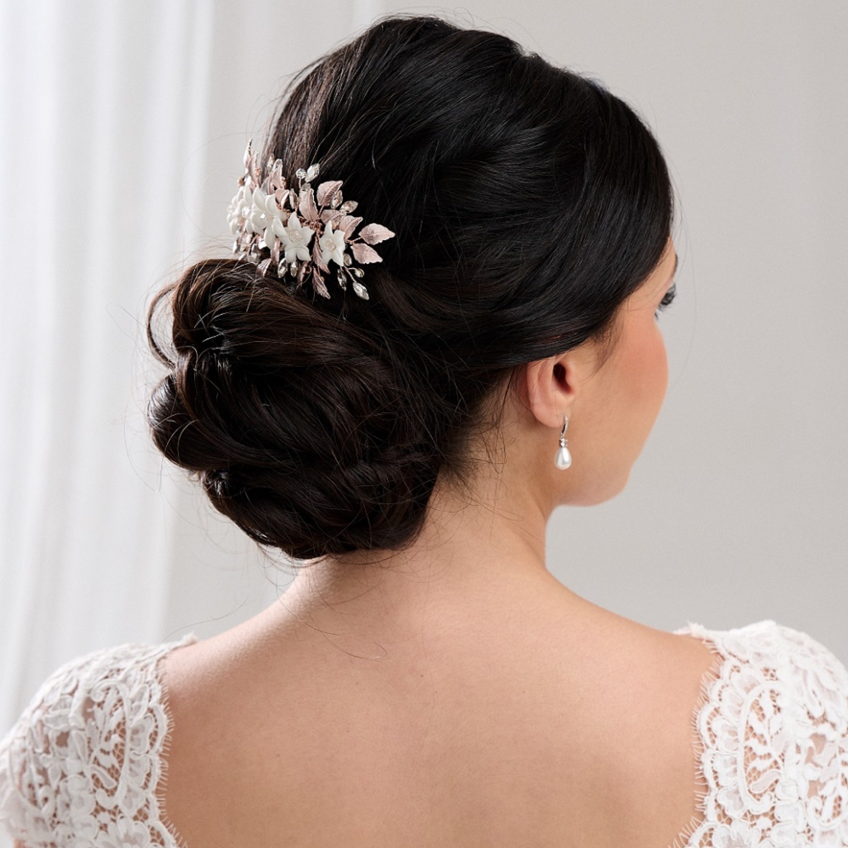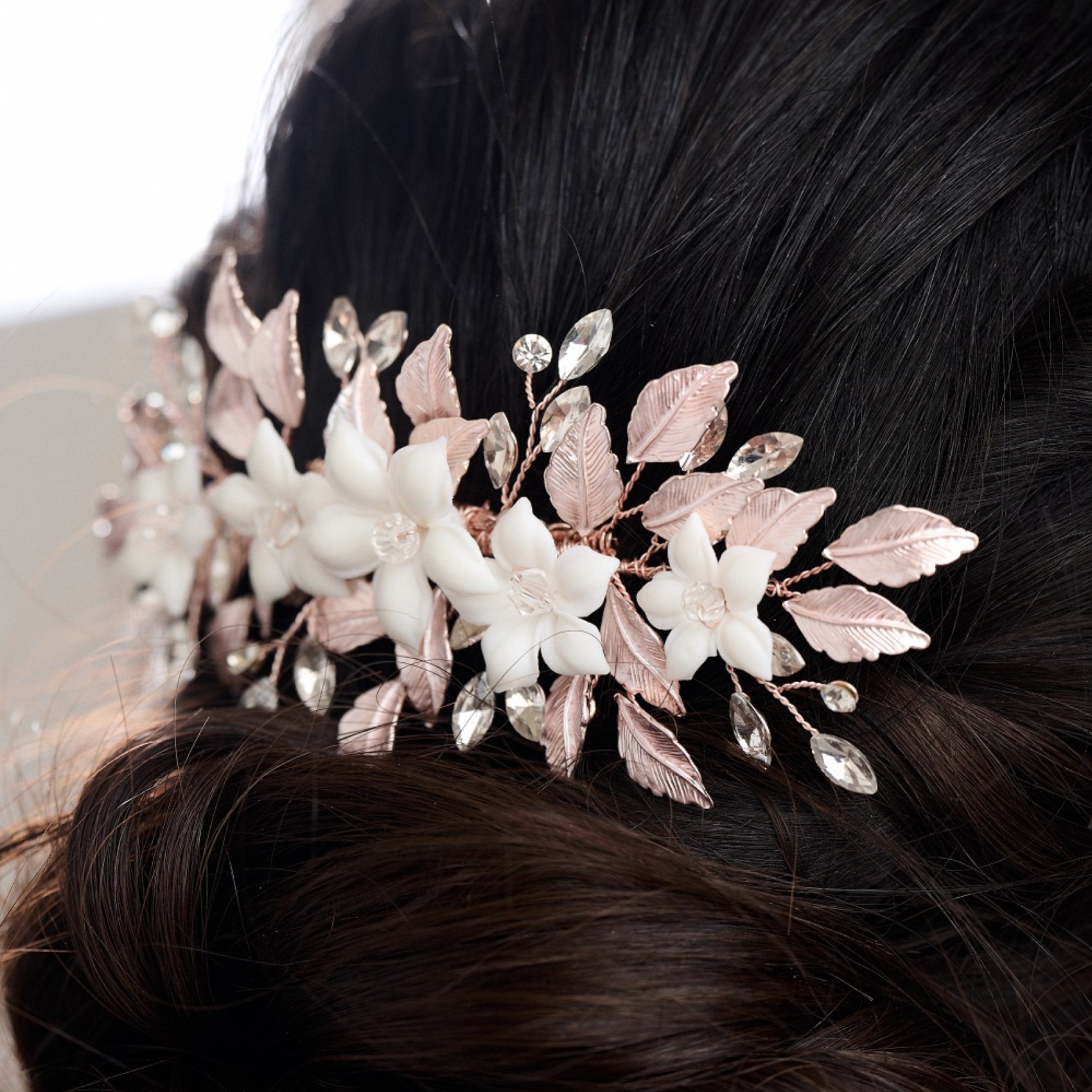 De superbes fleurs en céramique faites à la main sont nichées dans une gerbe de feuilles d'or rose scintillantes dans ce peigne à cheveux de mariage.