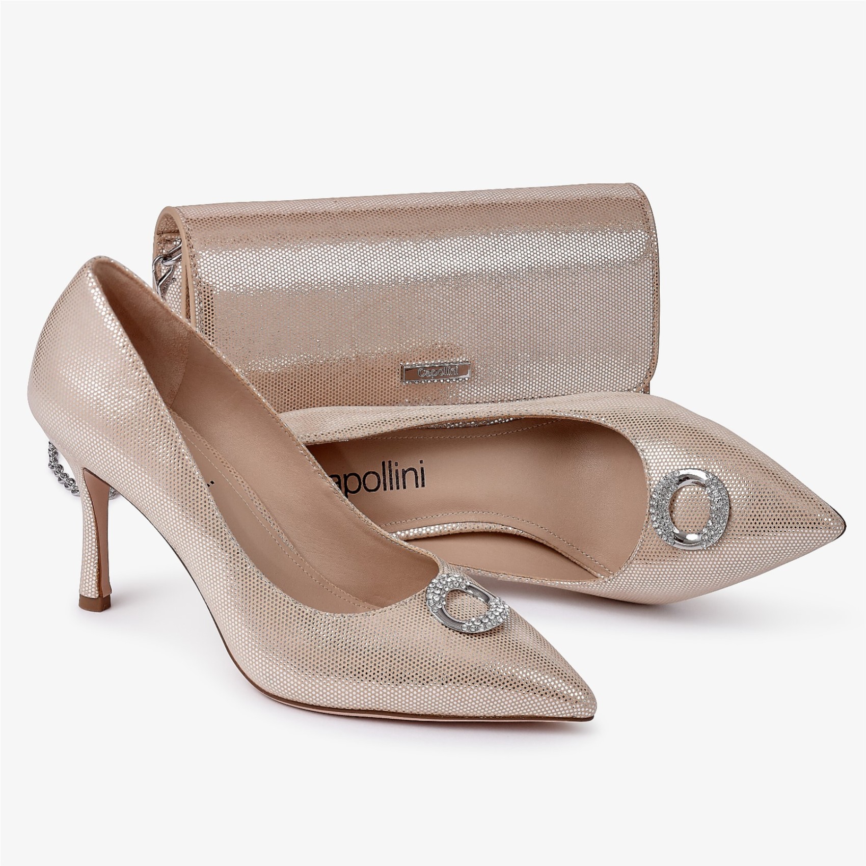 Fabriqué à la main en cuir nubuck or prosecco, ce sac à main élégant est doté d'une fermeture magnétique souple, d'une grande poche zippée et d'une poche ouverte à l'intérieur. Portez-le comme une pochette traditionnelle ou utilisez la longue chaîne d'épaule détachable pour avoir les mains libres ! Fini avec la marque d'approbation Capollini.