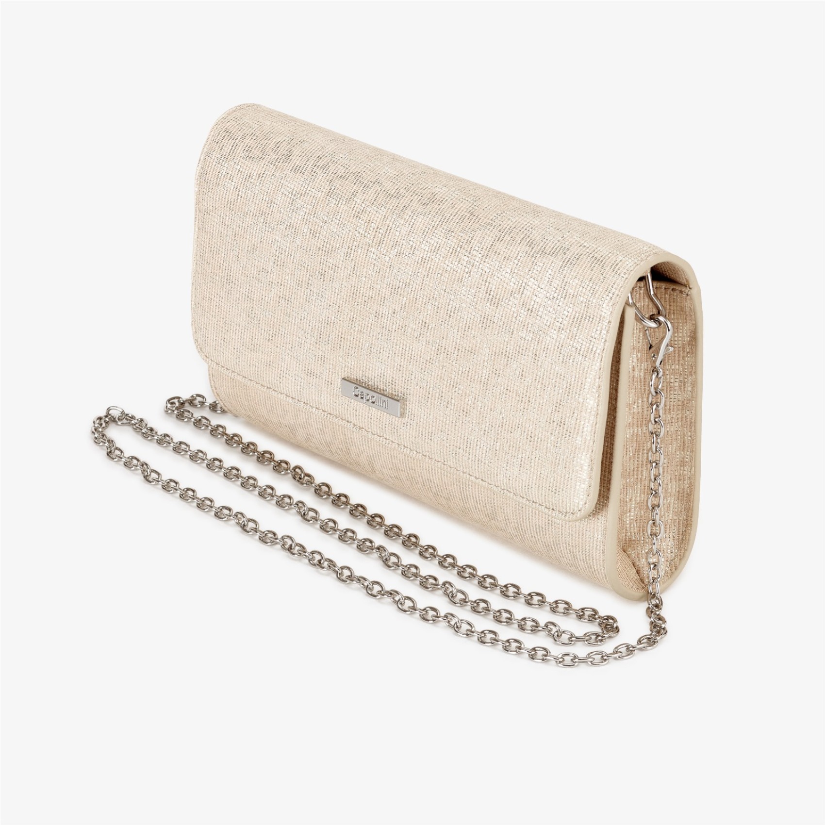 Fabriqué à la main en cuir nubuck champagne, ce sac à main intemporel est doté d'une fermeture magnétique souple, d'une grande poche zippée et d'une poche ouverte à l'intérieur. Il se porte comme une pochette traditionnelle ou à l'aide de la longue chaîne d'épaule détachable pour un portage mains libres, et porte le label de qualité Capollini.