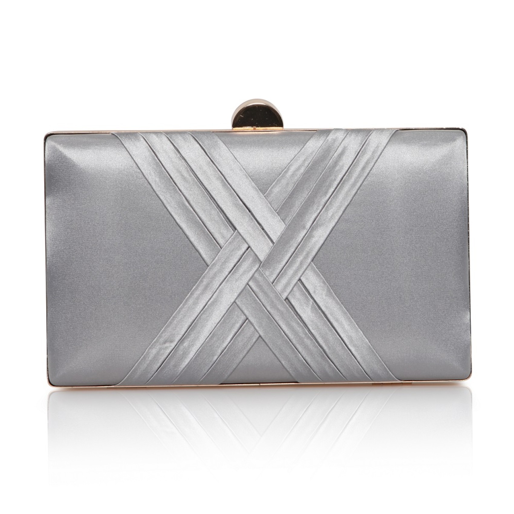 Ajoutez la touche finale parfaite à tout ensemble élégant. Cette magnifique pochette rectangulaire à étui rigide présente un profil élancé. Réalisée en satin soyeux argenté et décorée de bandes de satin croisées lustrées. Entièrement doublée de satin de couleur assortie, elle est dotée d'une petite poche intérieure, idéale pour garder tous vos essentiels à portée de main. Une chaîne longue et une chaîne courte sont incluses pour un port polyvalent. Parfaites pour les mariages, les bals de fin d'année, les fêtes, les courses, les soirées ou pour habiller un ensemble décontracté. Disponible en Champagne, Marine, Argent ou Taupe.