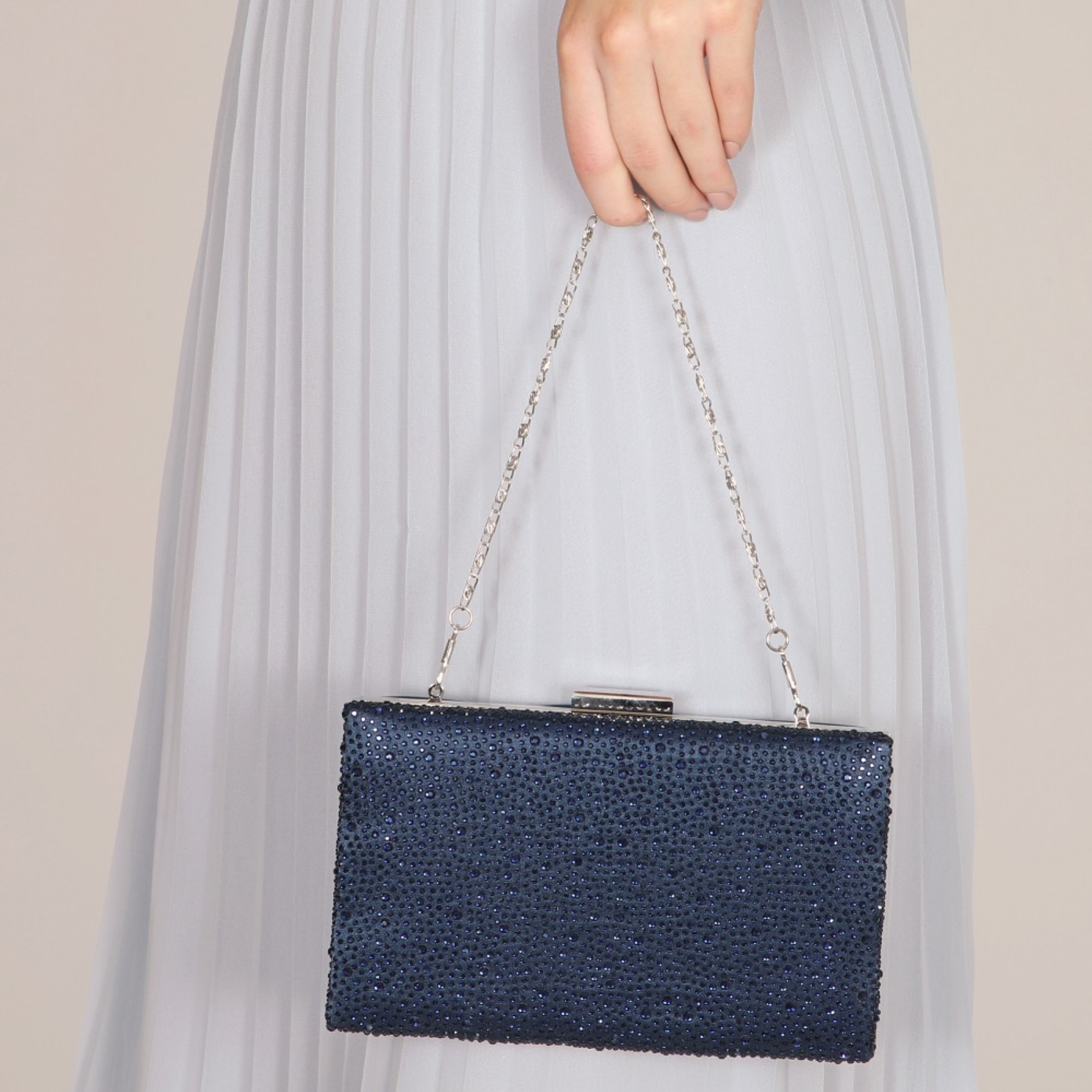 Super étincelante et parfaite pour les fêtes ! Notre pochette Sorrel navy crystal box est délicieusement fabriquée en satin lisse et ornée de cristaux thermoscellés de différentes tailles pour un effet éblouissant. L'étui rigide, le cadre métallique et le fermoir en haut gardent tous vos essentiels en sécurité, tout en créant un look moderne et pointu. Deux styles de chaînes détachables sont inclus pour une polyvalence totale. À la fois élégant et glamour, c'est l'accessoire idéal pour toute soirée ou événement formel. Disponible en marine, argent ou taupe.