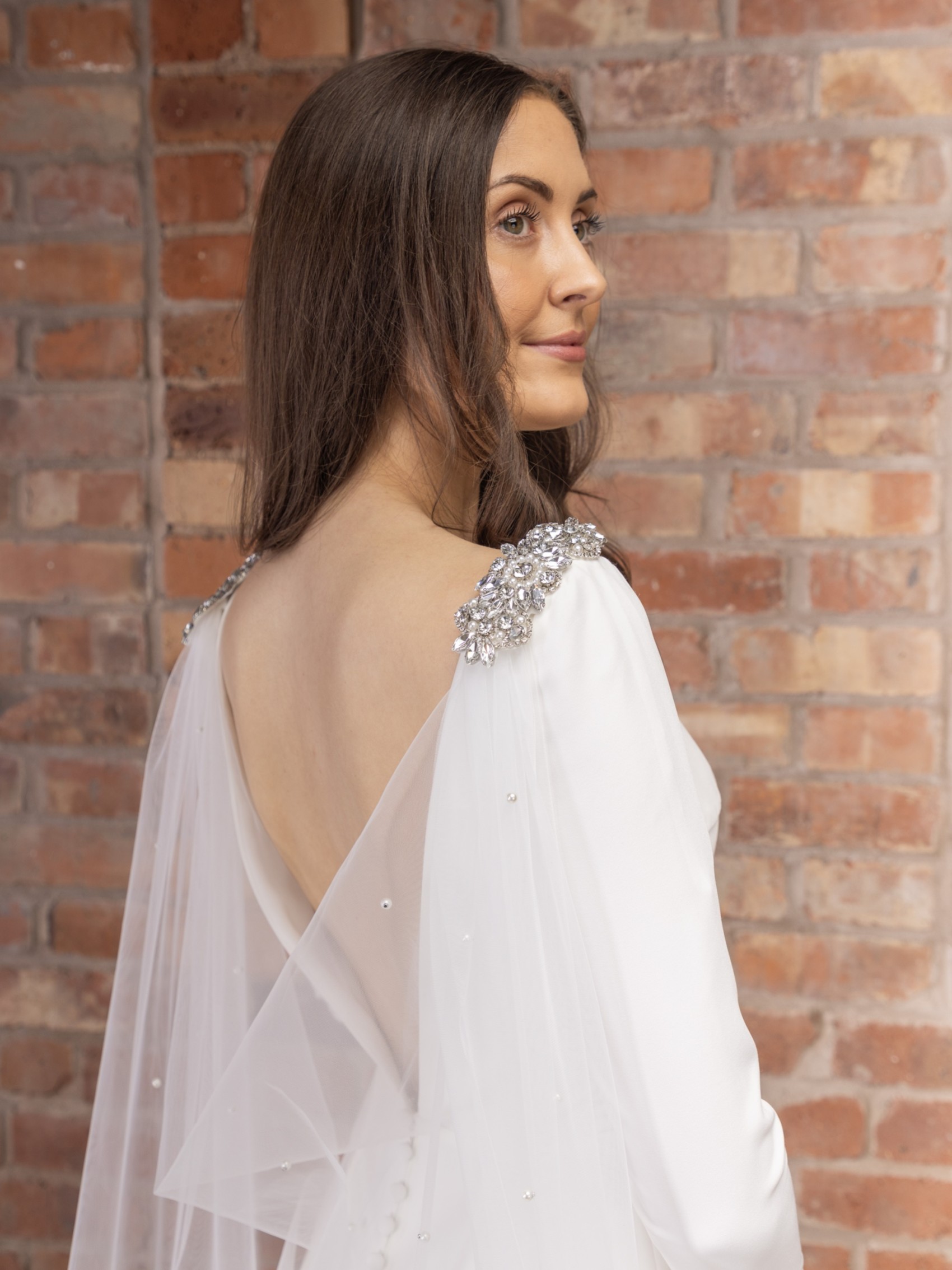 Ce magnifique voile cape de mariée est composé d'une seule pièce de tulle ivoire de longueur cathédrale qui se drape dans le dos en créant un doux effet de cagoule, avant de tomber en cascade jusqu'au sol. La cape est ornée d'une broche en diamants sur chaque épaule et parsemée de perles, ajoutant une touche d'éclat et d'élégance à votre look. Une alternative étonnante au voile de mariage traditionnel, à associer à une robe simple à dos bas pour mettre en valeur cette pièce !