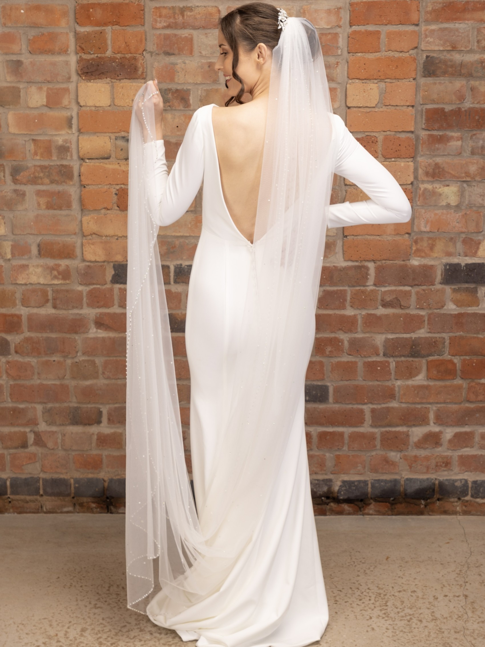 Un superbe voile cathédrale en tulle souple ivoire à un seul étage, orné d'une bordure glamour en perles et en diamants, et terminé par des cristaux et des perles scintillants. Un magnifique voile de mariage pour les mariées qui souhaitent ajouter des détails à leur look.