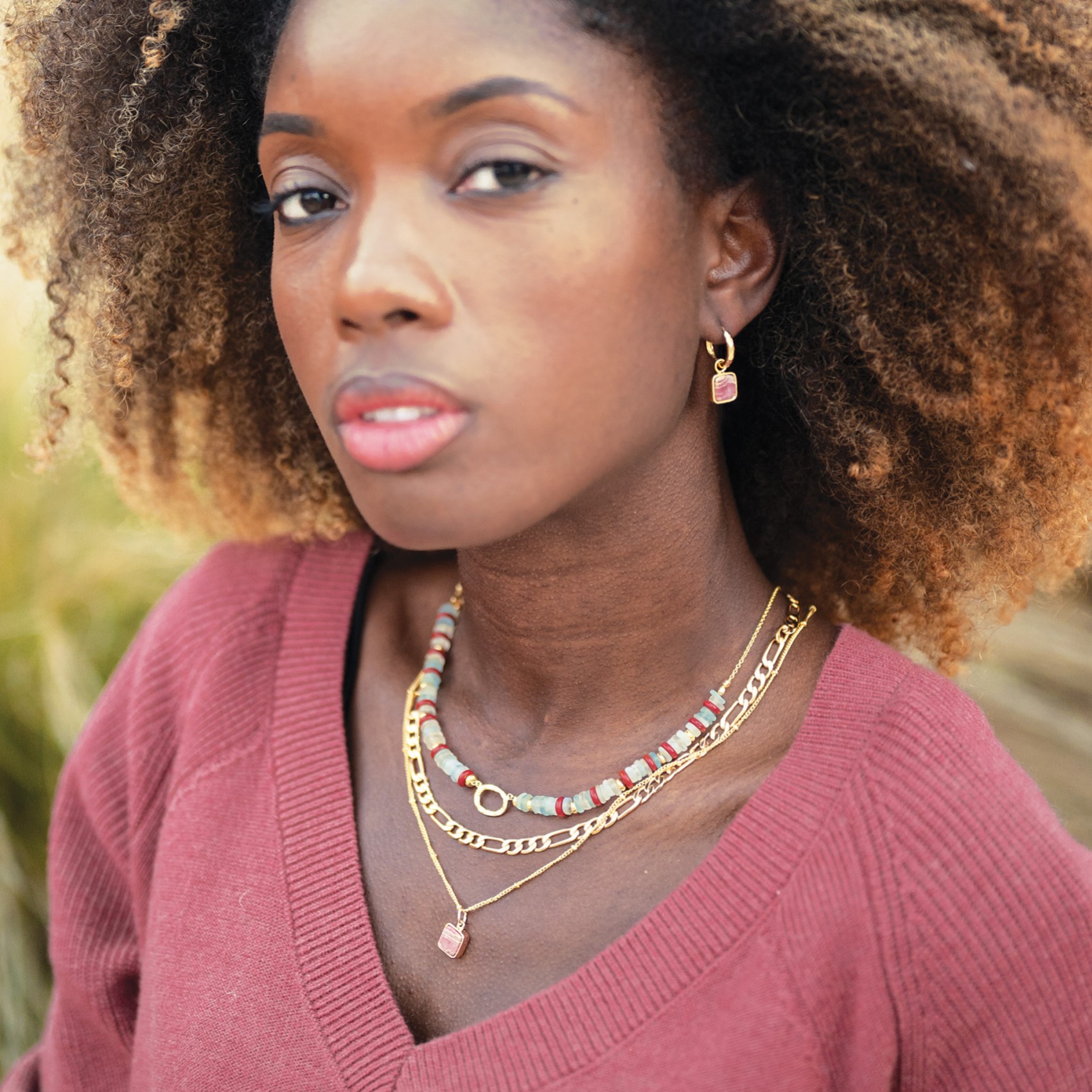 Get ready for jewellery envy. This chic design is the ultimate everyday necklace to wear solo or layer your way. Set with hand cut Rhodochrosite on a dainty gold bobble chain this piece brings extra sparkle and a splash of colour to your style. Pair with matching Aztec Earrings.