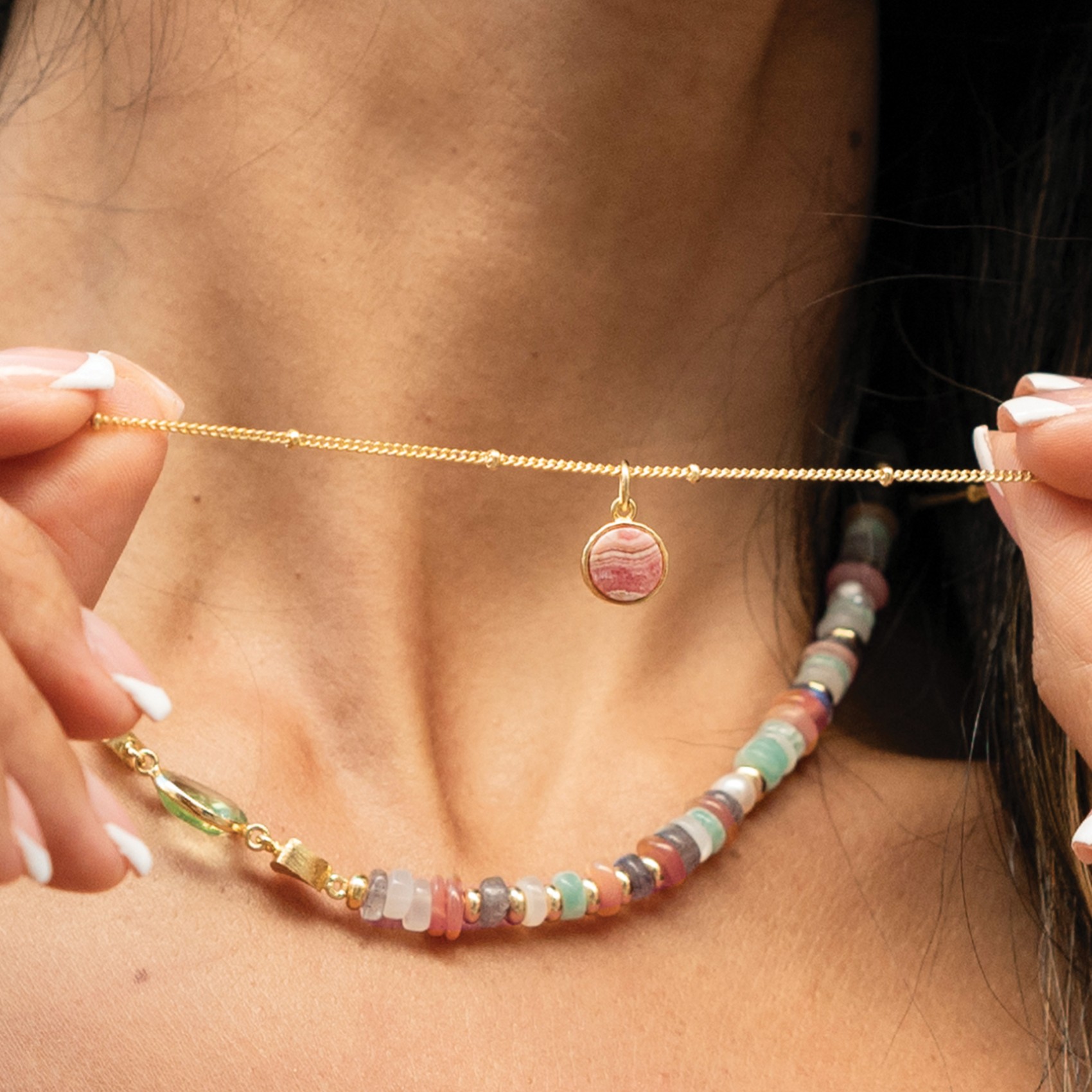 Meet your new must have necklace for the season. Set with hand cut Rhodochrosite on a dainty gold bobble chain this piece brings extra sparkle and a splash of colour to your layering game. Style solo or team with your faves for looks you’ll wear again and again. Pair with matching Rosa Earrings.