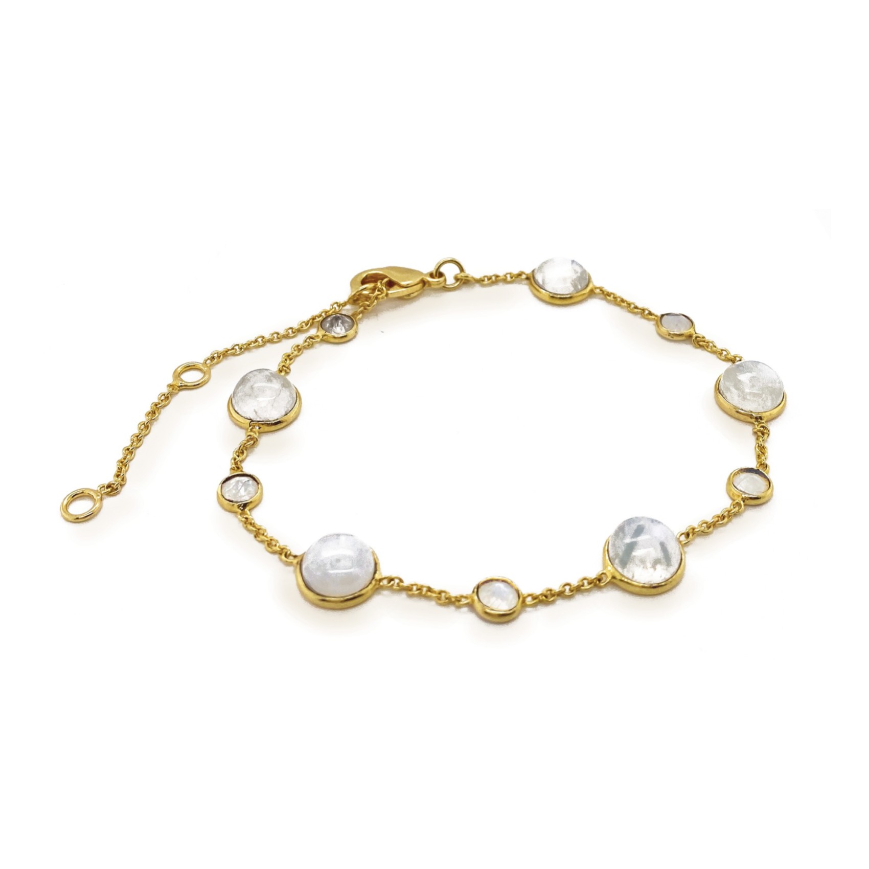 Relaxed boho style bracelet, perfect for weddings or everyday wear. Featuring a dainty 14ct gold plated chain, interspersed with Rainbow Moonstone semi precious cabochons, finished with a lobster clasp and extender chain to fit any wrist. This stylish bracelet make sthe most gorgeous gift for brides and bridesmaids alike.