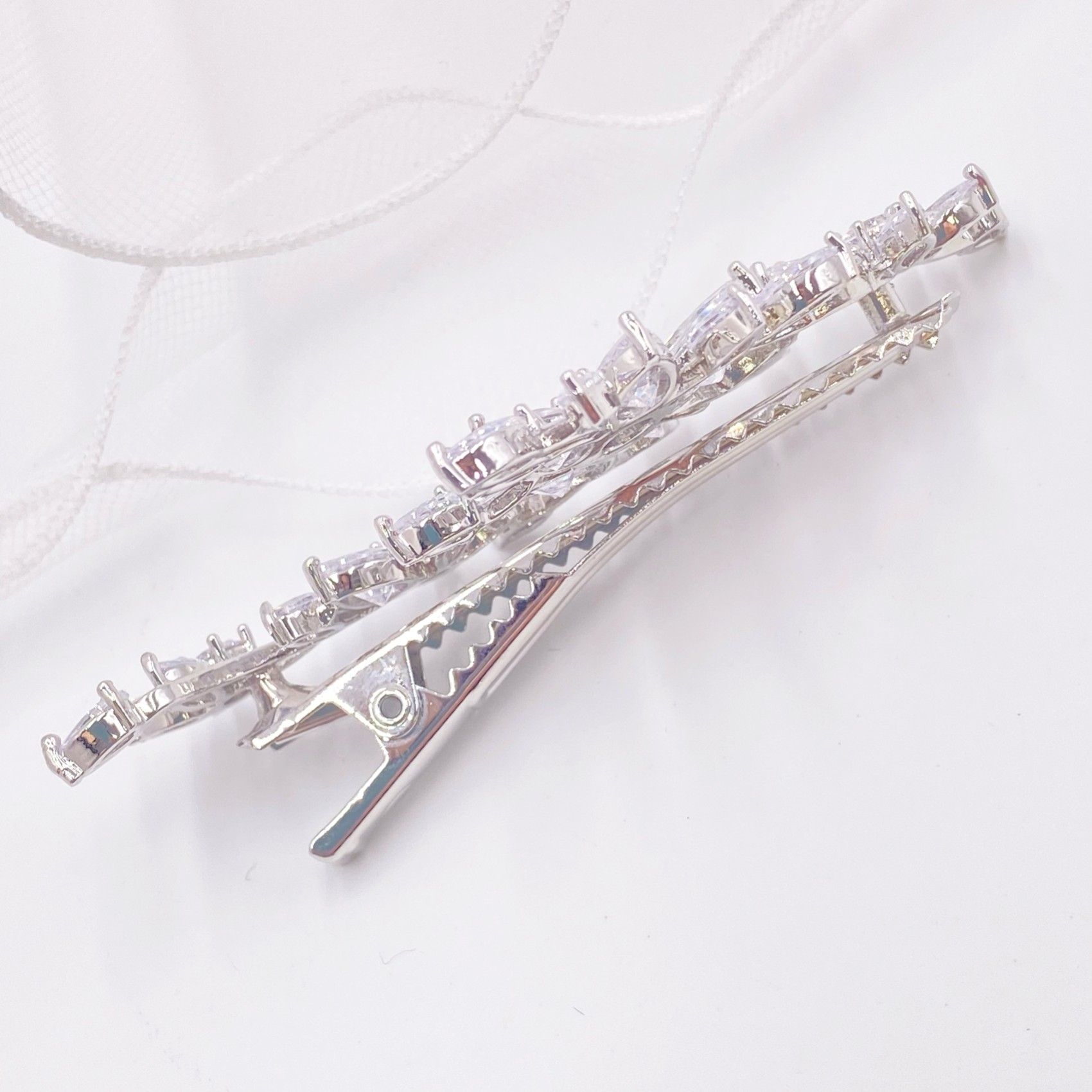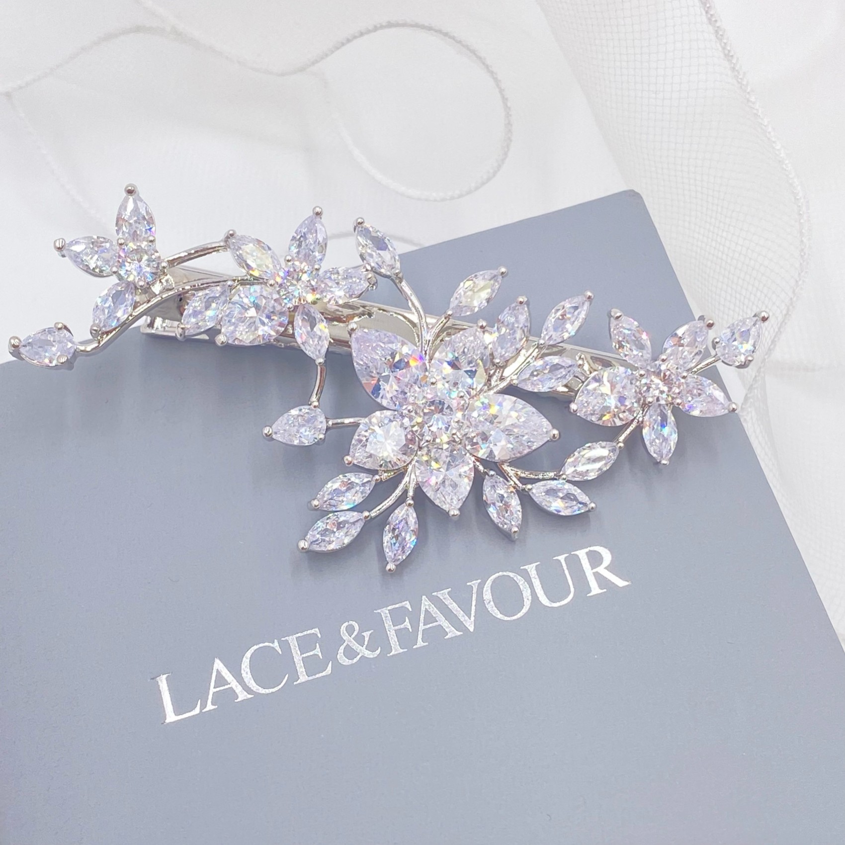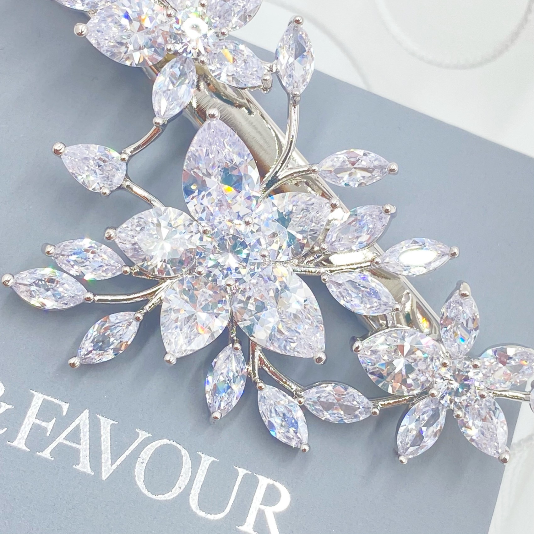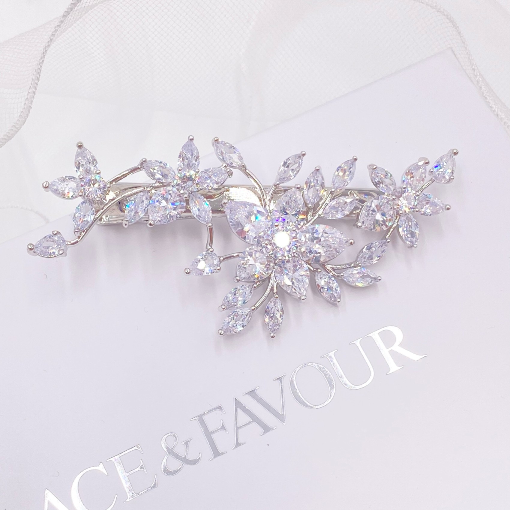Un fermaglio per capelli in cristallo splendidamente versatile, caratterizzato da scintillanti dettagli floreali in CZ su un delicato fermaglio in coccodrillo. Posizionatelo ovunque tra i capelli per aggiungere un sofisticato scintillio al vostro look. Un'ottima scelta per le spose e le damigelle d'onore, questo fermaglio si adatta bene sia alle acconciature che alle ciocche sciolte.