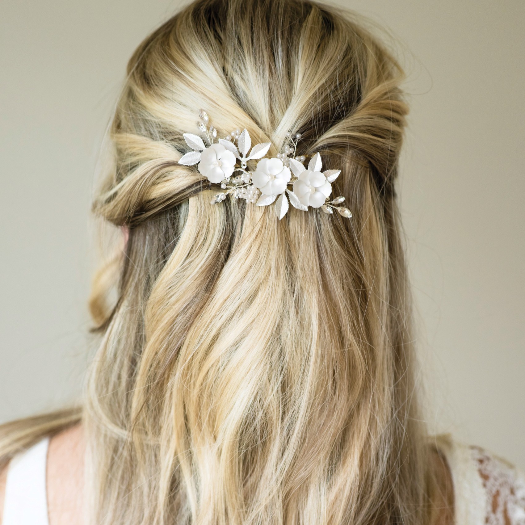 Scintillanti cristalli marquise e grappoli di delicate perle si intrecciano tra delicati fiori e foglie smaltati in argento. Fresco e informale per la primavera e l'estate e per i matrimoni all'estero, ideale anche per le damigelle.