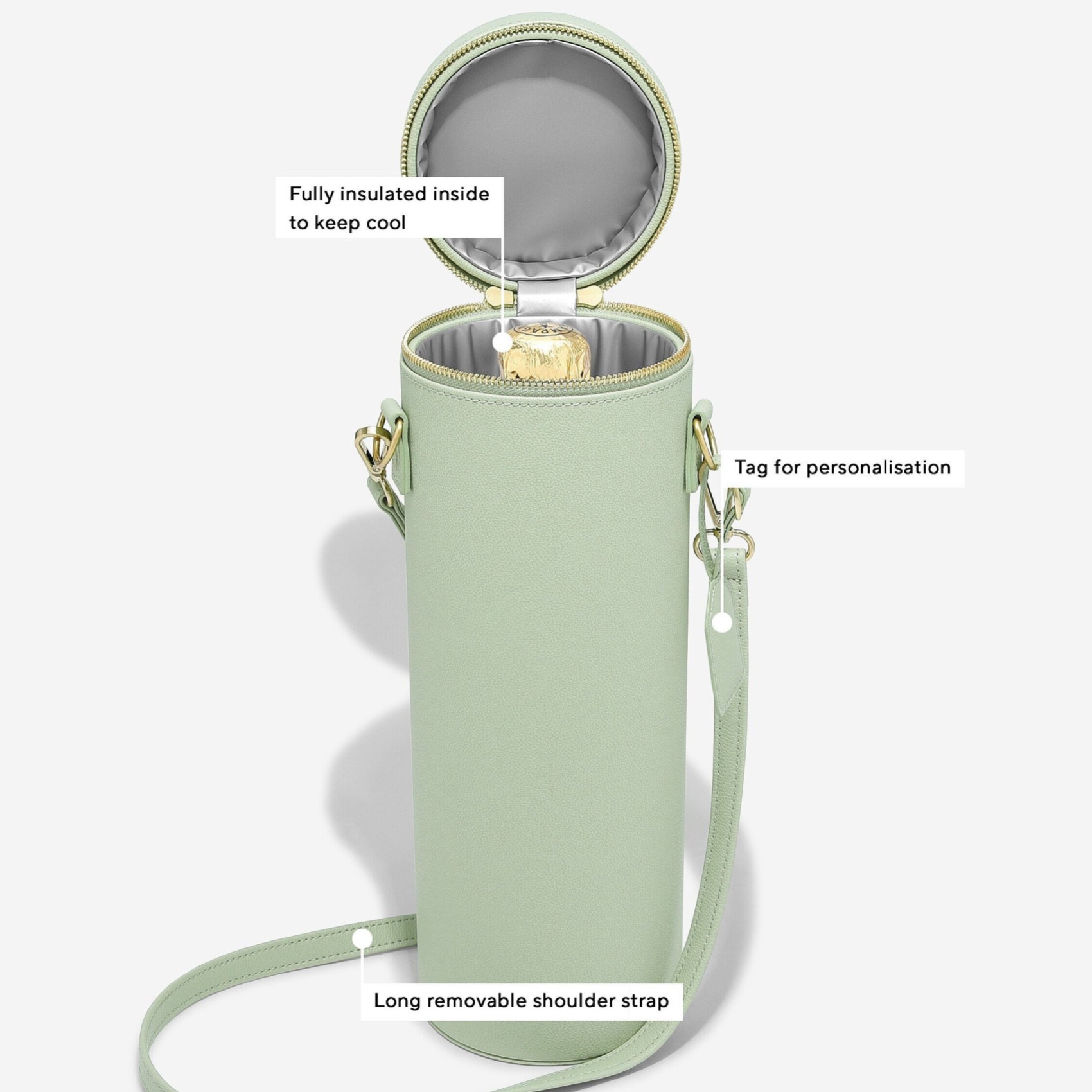 La borsa per champagne Stackers è il modo più elegante per regalare o trasportare una bottiglia di champagne. Progettata con un esterno in ecopelle verde salvia per una sensazione di lusso e rifinita con una fodera imbottita e rinfrescante per mantenere le bevande alla temperatura perfetta. Ideale per trasportare una bottiglia a un picnic o a un evento all'aperto, è dotata di una lunga tracolla e di una maniglia superiore. La Champagne Bag è un bel regalo di nozze o di compleanno per chi ama le cose belle della vita.