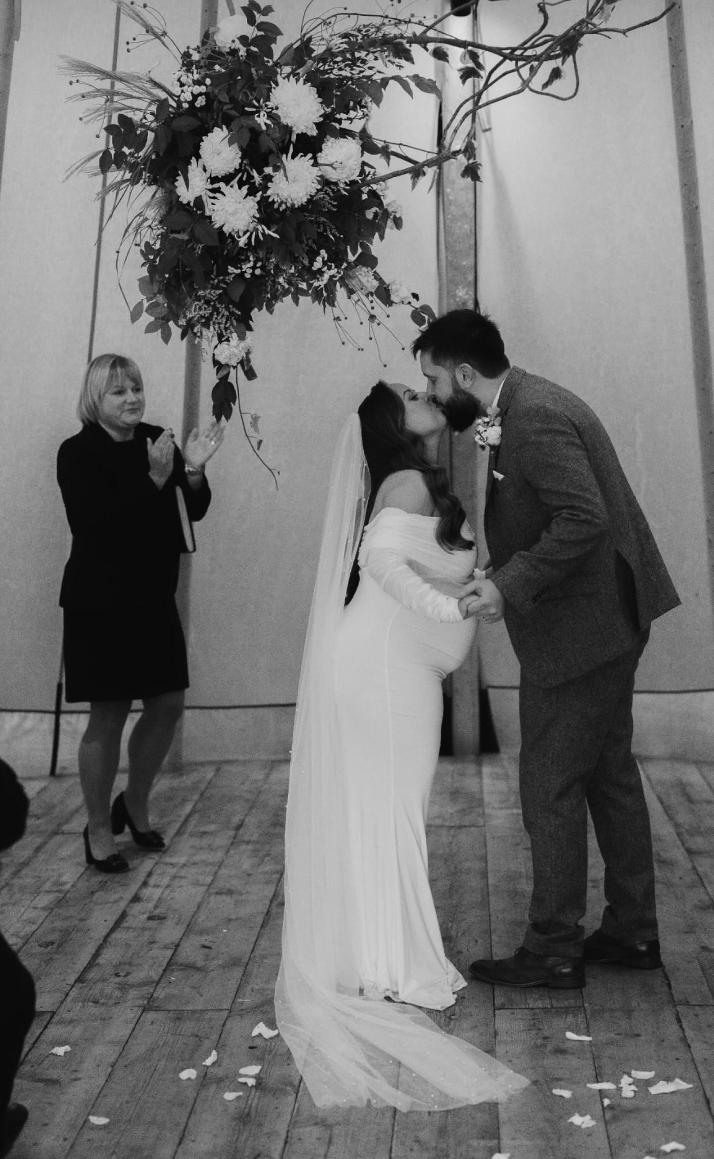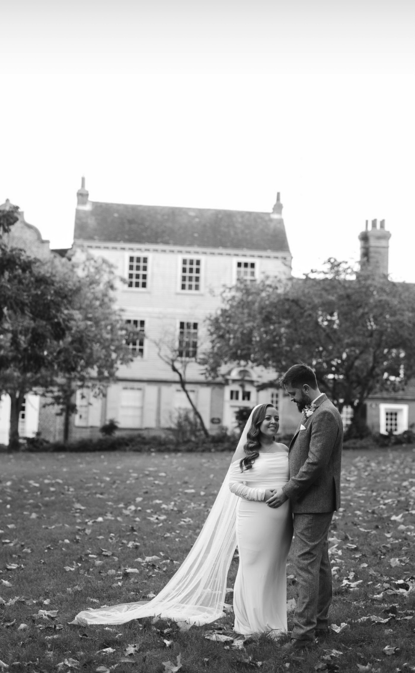 Claire ha indossato il nostro velo da cappella con perle sparse PBV9011 per completare il suo splendido look da sposa. Oh, per apparire così affascinante a 7 mesi di gravidanza 😍