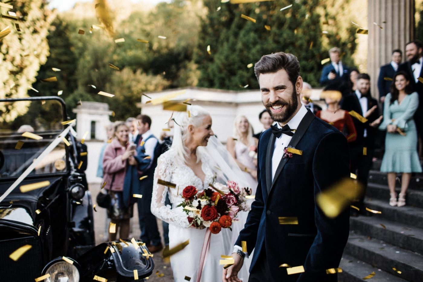 Come dovrebbe essere felice ogni sposa nel giorno del suo matrimonio! La vera sposa Charlotte ha indossato il nostro bellissimo velo Kensington per completare il suo splendido abito Suzanne Neville.