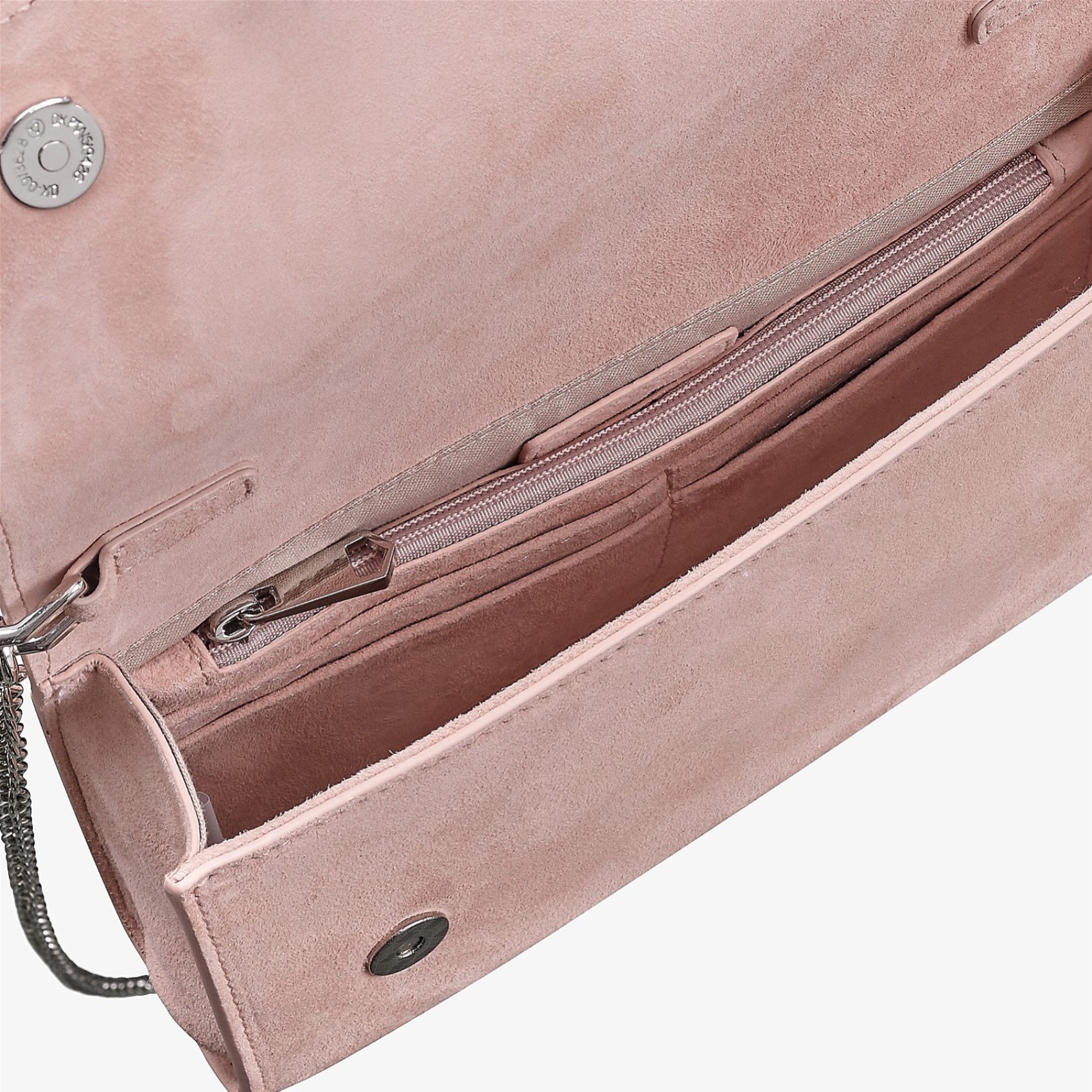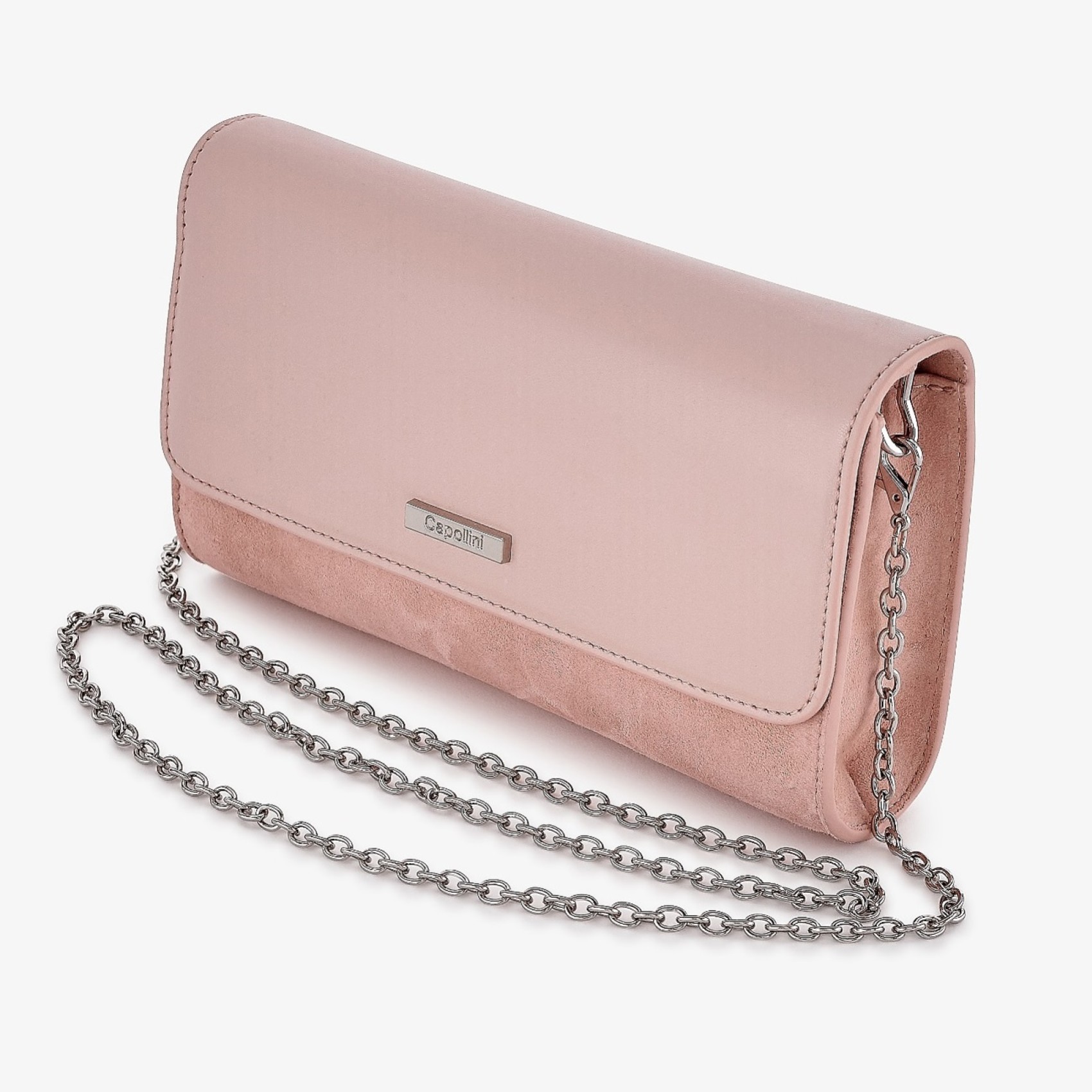 Realizzata a mano in morbido camoscio rosa e pelle di capretto, questa borsa senza tempo è dotata di una morbida chiusura magnetica, splendidamente foderata con un'ampia tasca a marsupio con zip e una tasca aperta all'interno. Da portare come una tradizionale pochette o da utilizzare con la lunga catena a tracolla staccabile per indossarla a mani libere. Rifinita con il marchio di approvazione Capollini.