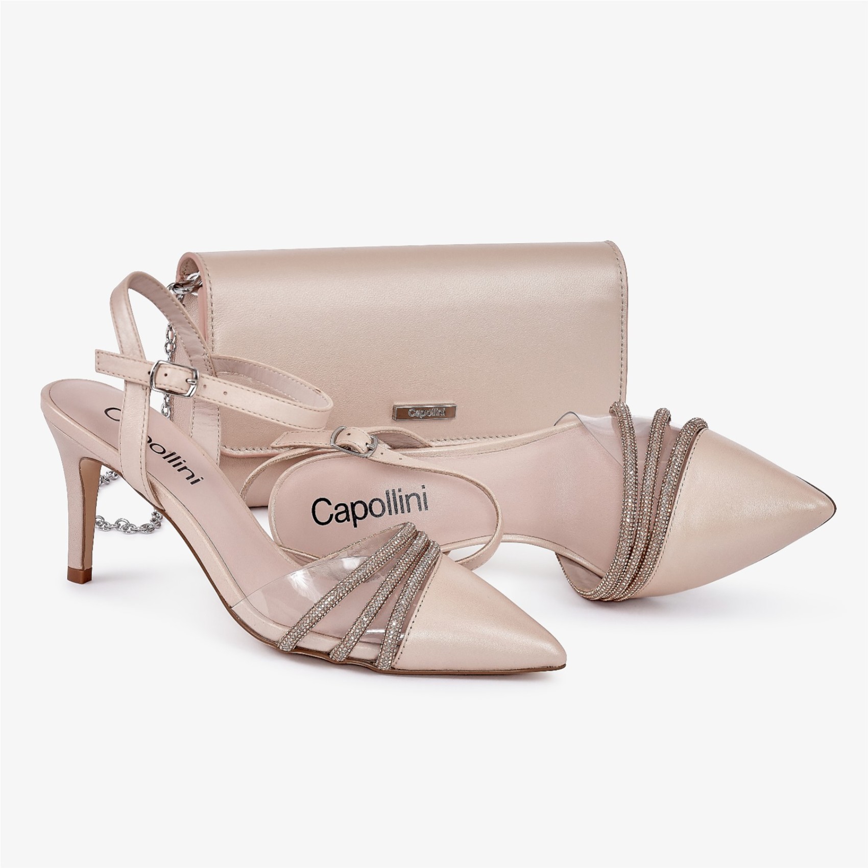 Realizzata a mano in pelle di mandorla perlata, questa borsa senza tempo è dotata di una morbida chiusura magnetica, splendidamente foderata con un'ampia tasca a marsupio con zip e una tasca aperta all'interno. Da portare come una tradizionale pochette o da utilizzare con la lunga catena a tracolla staccabile per indossarla a mani libere. Rifinita con il marchio di approvazione Capollini.