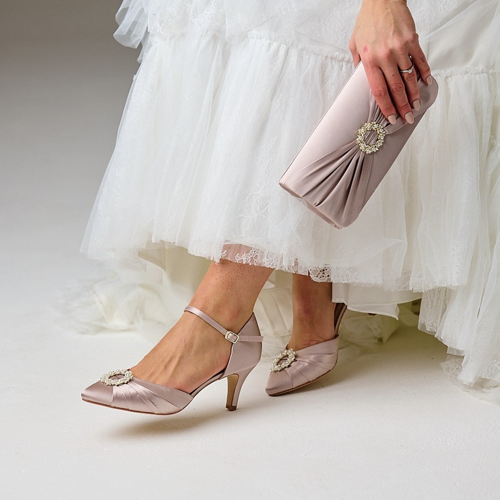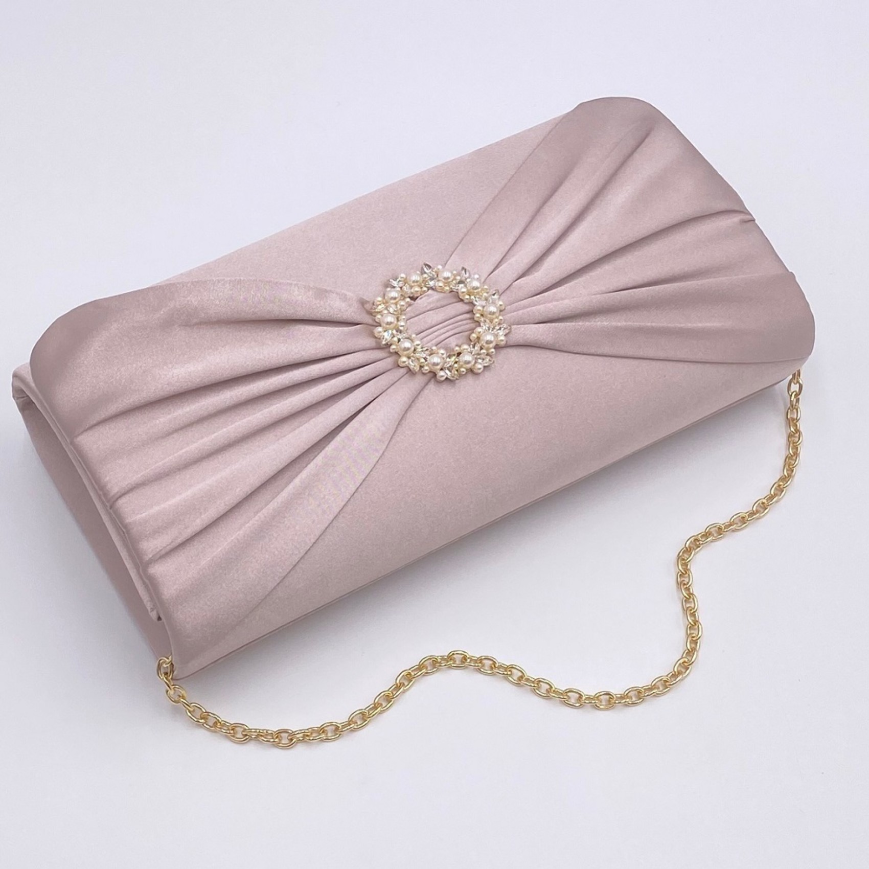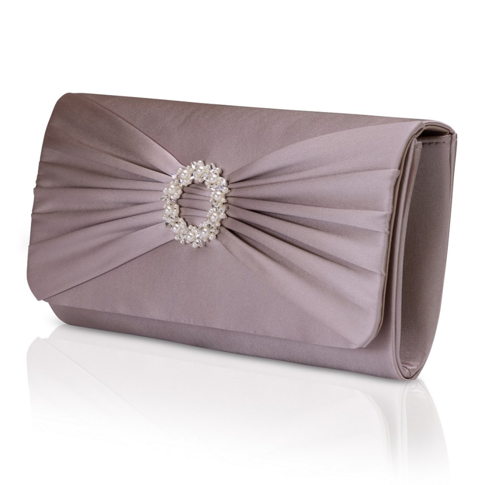 Realizzata in un intramontabile raso color taupe e impreziosita da una splendida spilla circolare di perle e cristalli, questa pochette è un accessorio elegante per le invitate al matrimonio, per la madre della sposa o dello sposo o semplicemente per una serata in città! Le attraenti pieghe aggiungono un delizioso tocco finale a questa sofisticata borsetta color taupe. Completa di una tracolla a catena che consente di indossarla a mani libere, questa pochette è pratica per ogni occasione speciale. Harlow è l'abbinamento perfetto con i nostri tacchi Kitty.