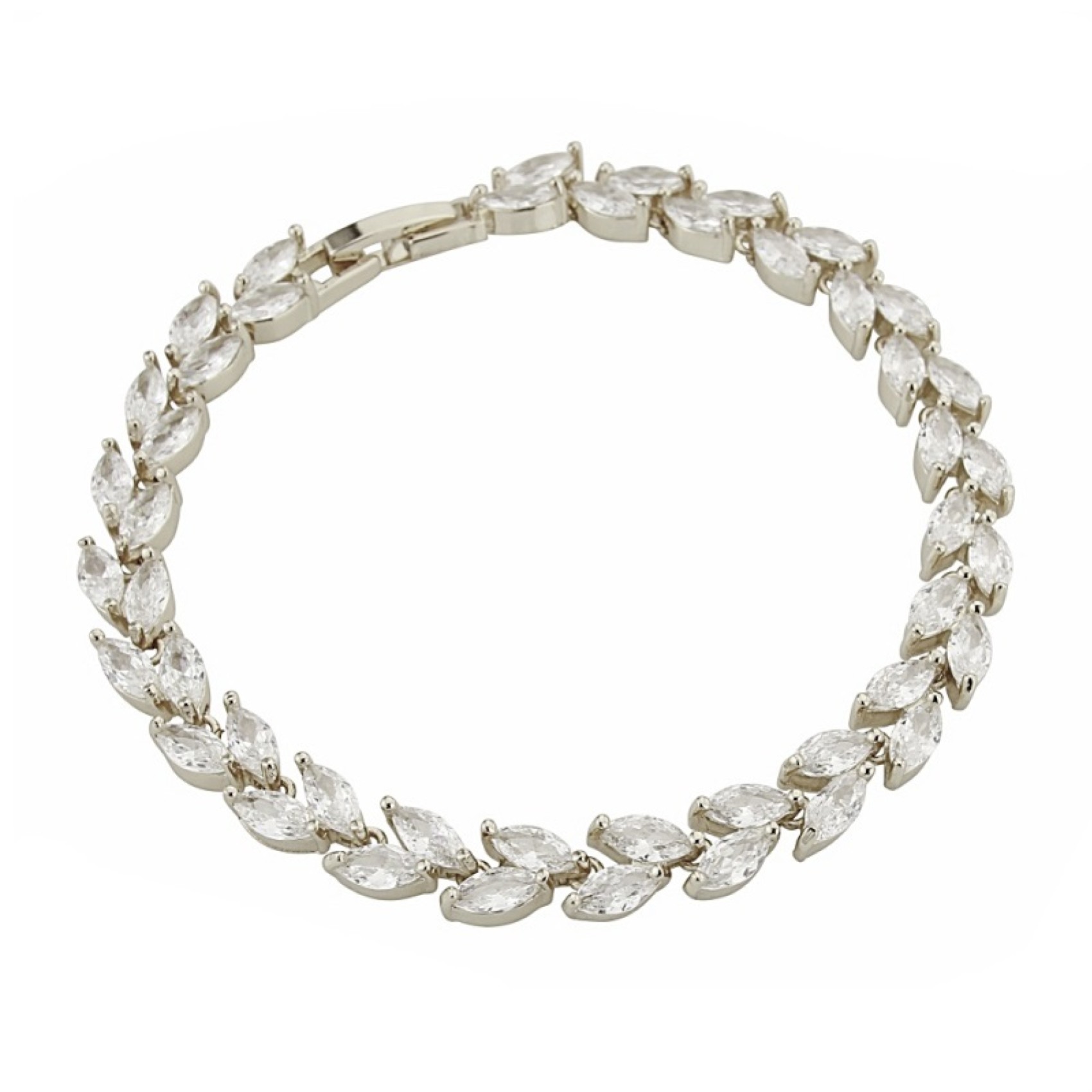 Un bellissimo braccialetto nuziale in cristallo, ornato da cristalli cubici marquise con incastonatura in argento, che formano una scintillante fila di foglie. Si chiude con una fibbia pieghevole. Una scelta versatile per completare abiti classici, vintage o bohémien.