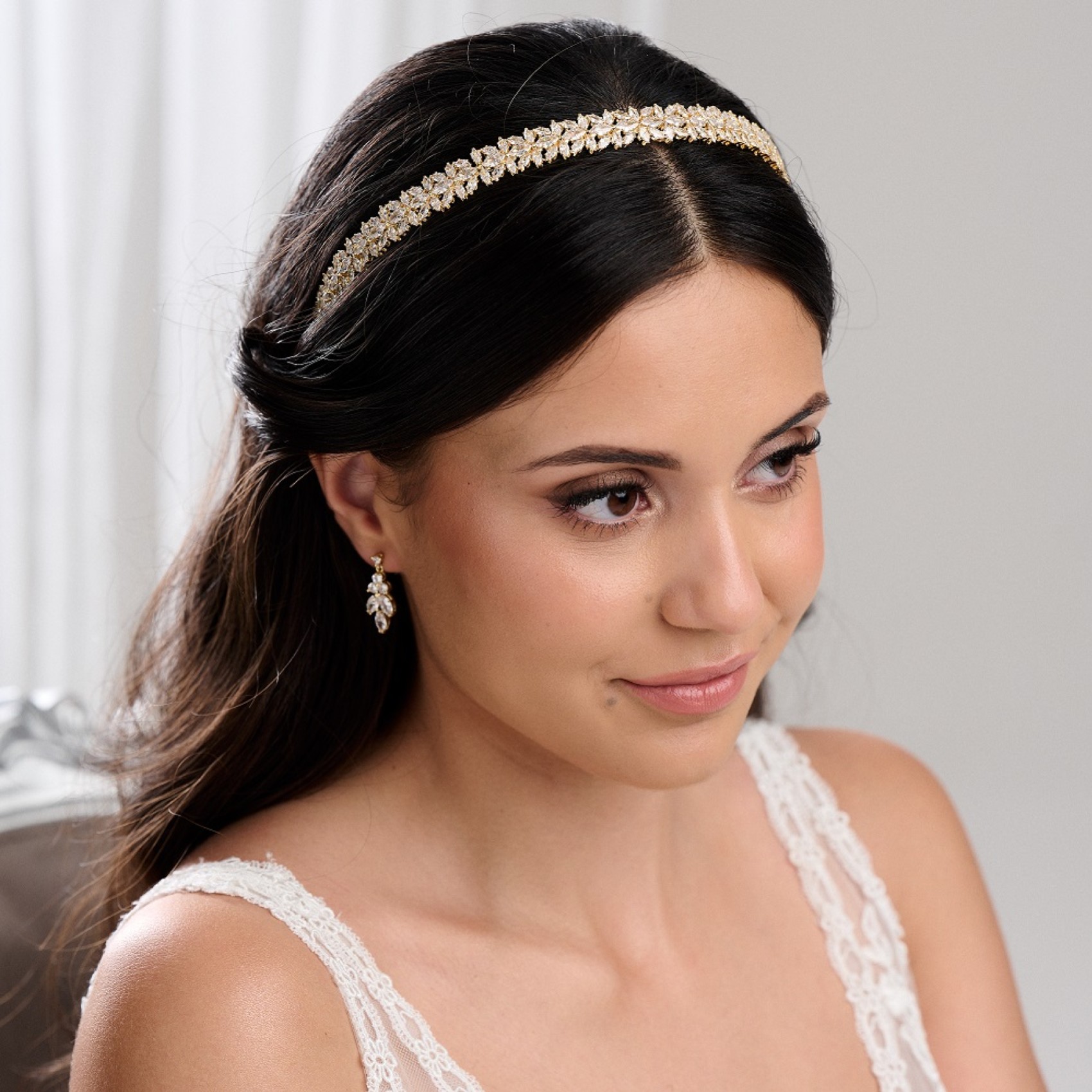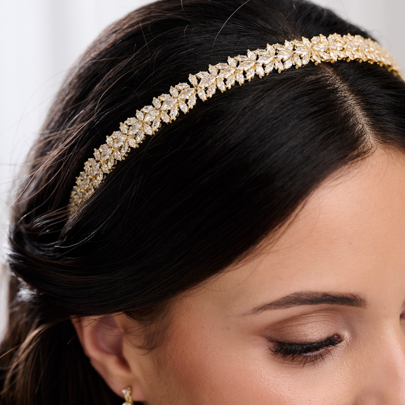 Un bellissimo cerchietto da sposa classico in oro, ornato da decine di cristalli cubici zirconia marquise in un design simmetrico semplice e accattivante. Il copricapo perfetto per le spose che cercano un accessorio per capelli d'oro senza tempo, con tanto di scintillio di diamanti.