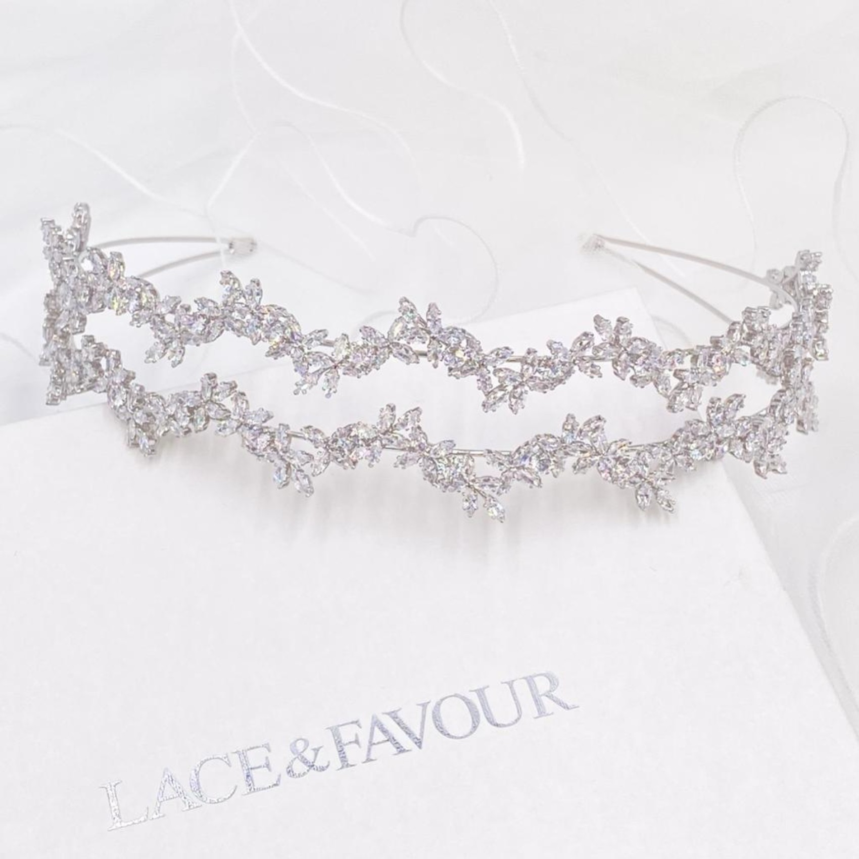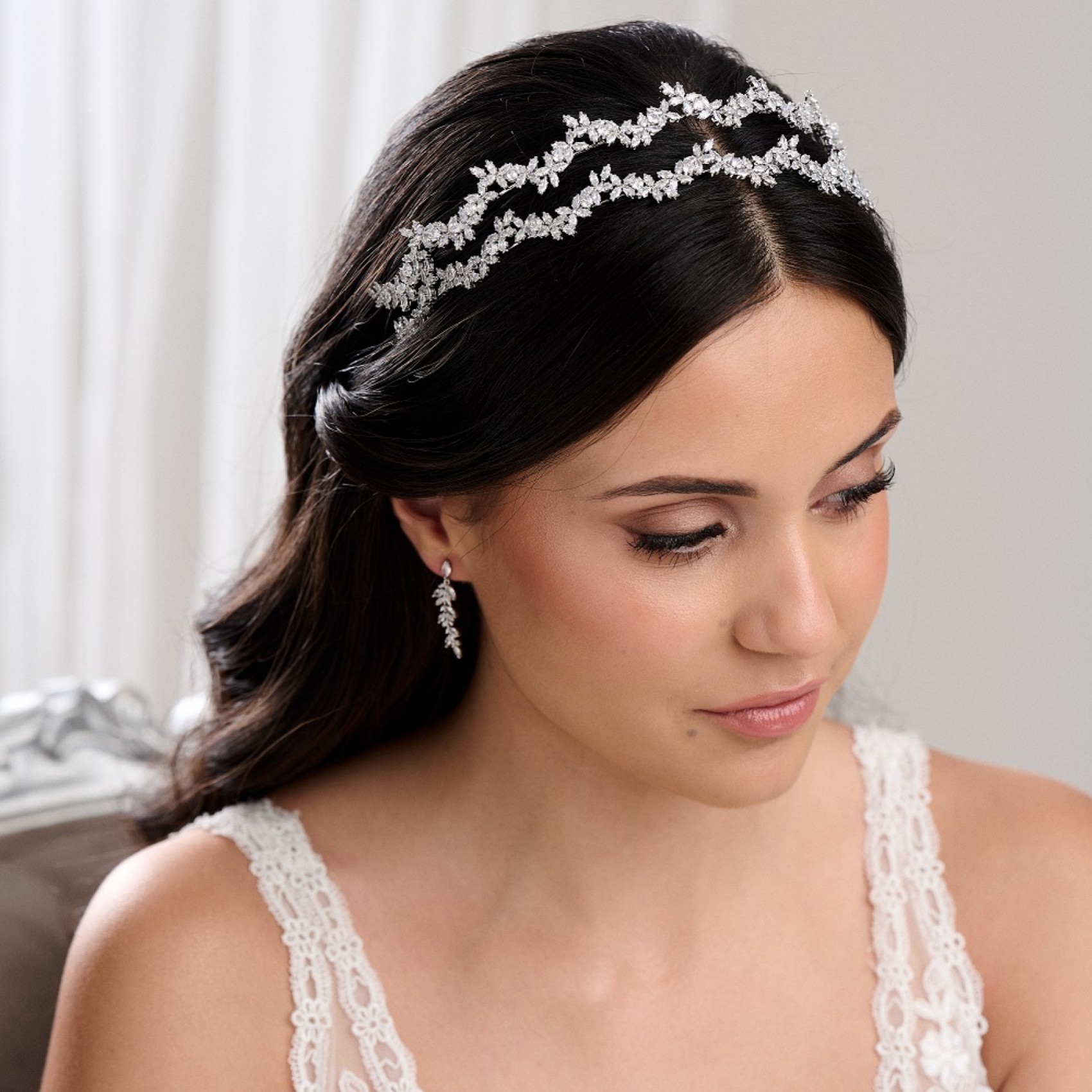 Due file di scintillanti pietre CZ marquise compongono questo splendido cerchietto da sposa. Un delizioso copricapo di cristallo per una sposa che desidera un'abbondante scintilla di diamanti, ma non vuole un diadema tradizionale.