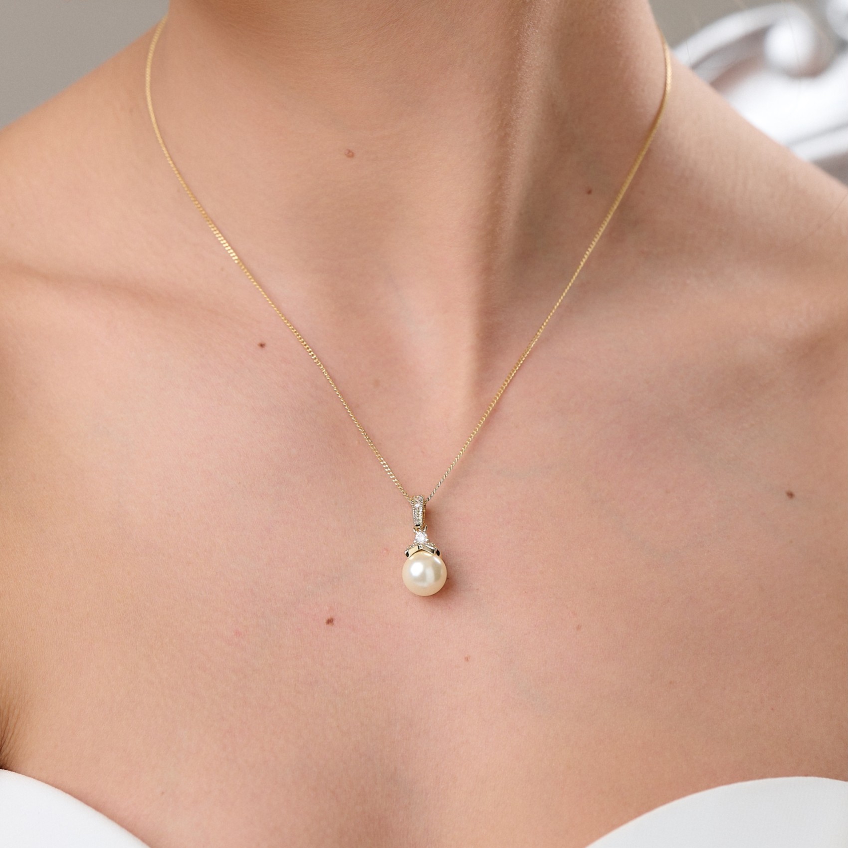 Una classica collana di perle con un intricato disegno di zirconi micropallinati in oro 14K, che sospende una perla scintillante color avorio. Un tocco finale elegante per spose e damigelle, da abbinare agli orecchini di perle abbinati per completare il look.