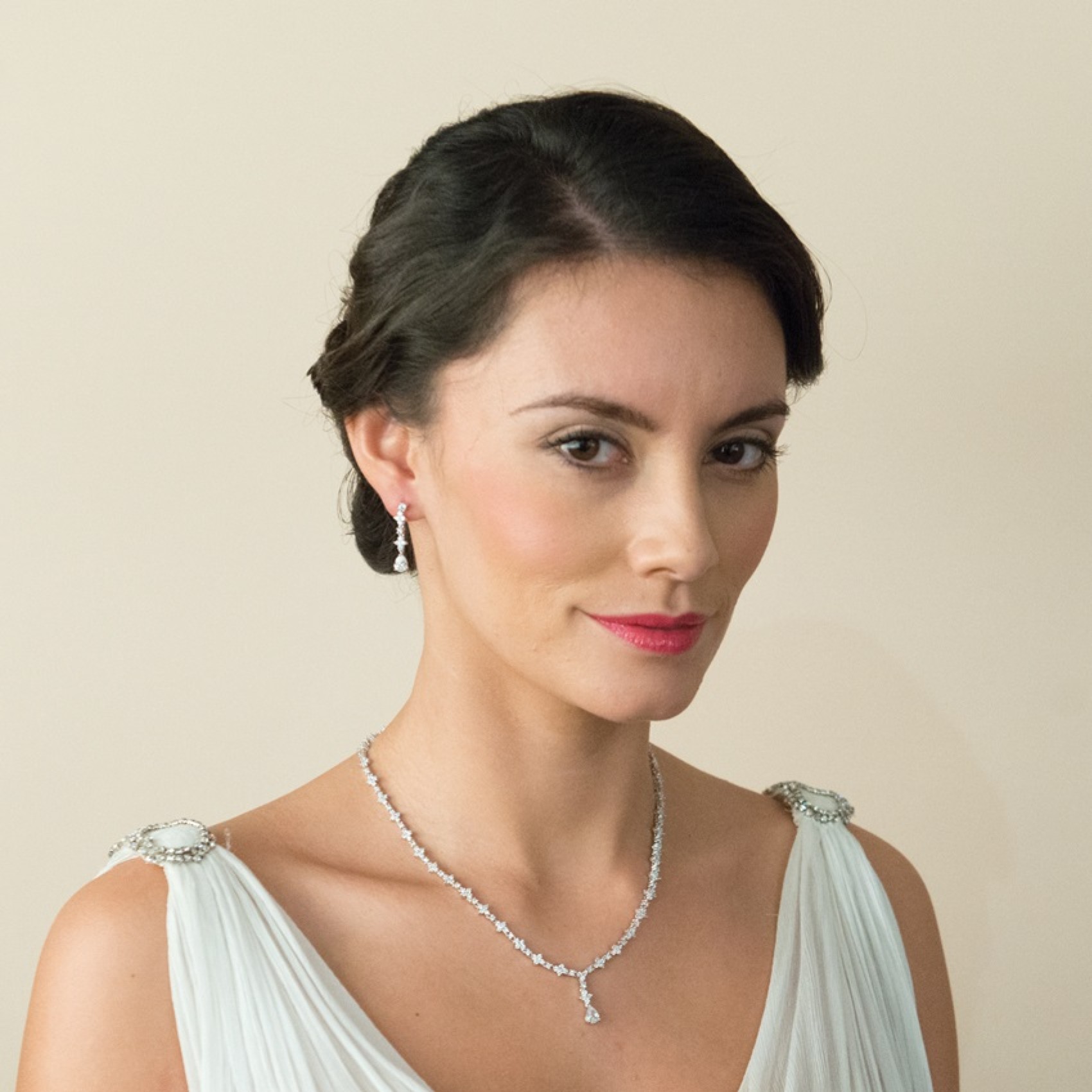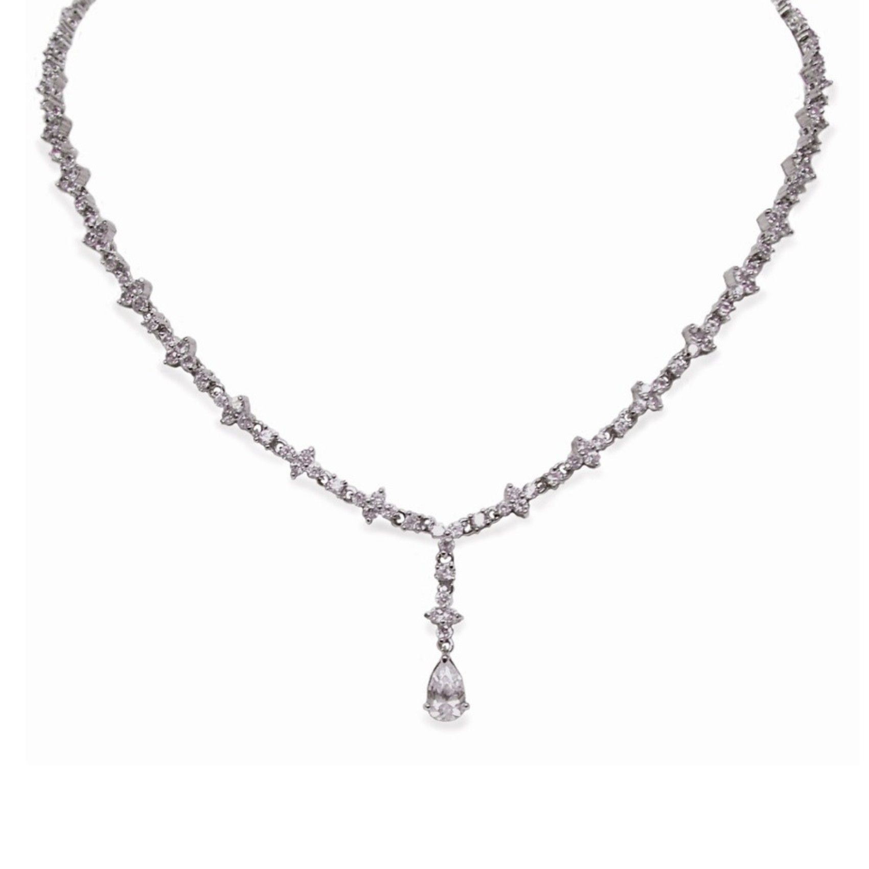 Una delicata serie di scintillanti pietre CZ sospende una radiosa pietra a goccia in questa sobria collana da sposa in cristallo. La disposizione dei cristalli ha influenze Art Déco, che si abbina alla perfezione a un abito in stile anni Venti. Una scelta bella e classica per ogni sposa.