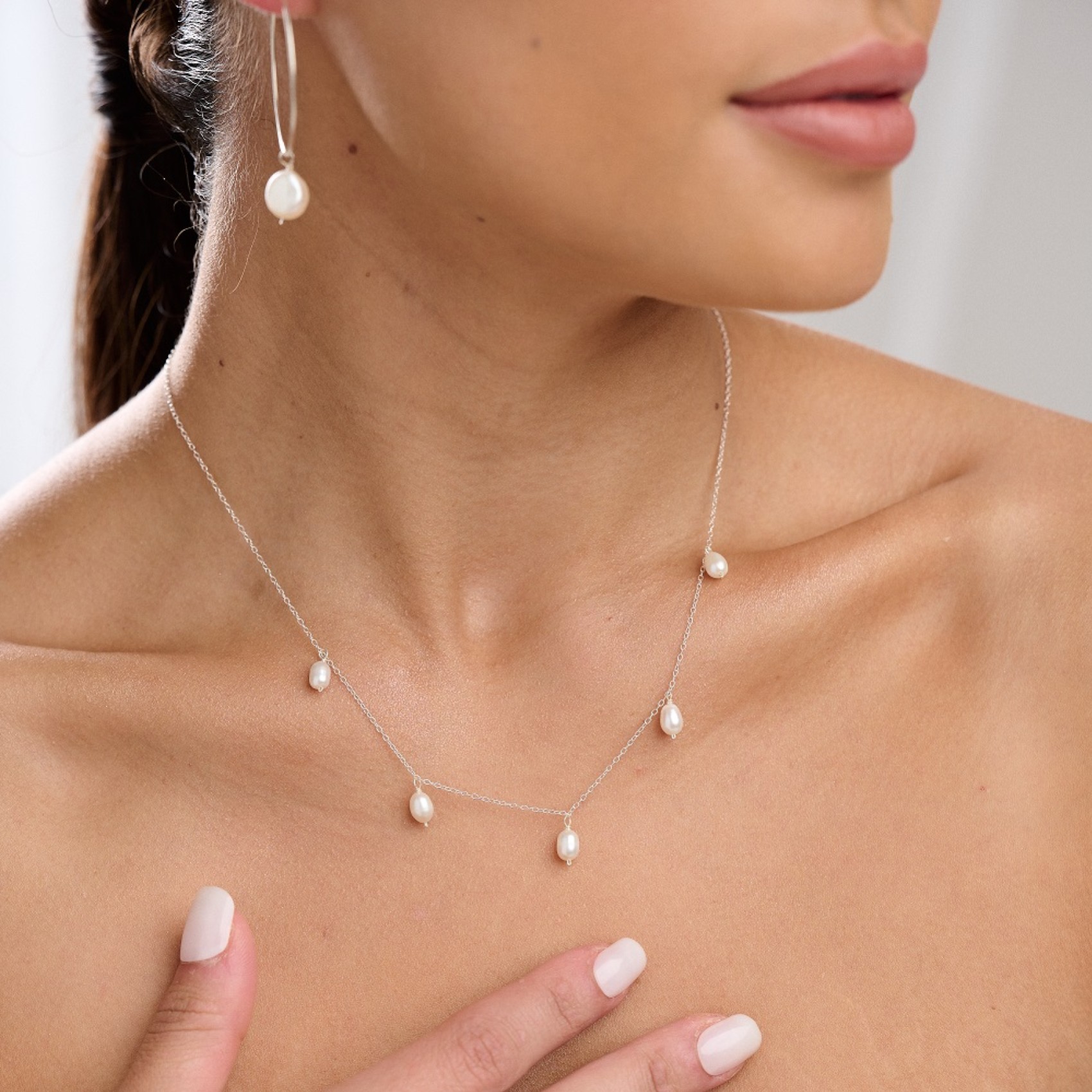 Una splendida e delicata collana da sposa realizzata a mano con una sottile catena in argento sterling che sospende cinque splendide gocce di perle d'acqua dolce. Da abbinare a uno splendido paio di orecchini di perle per un look da sposa elegante e senza tempo.