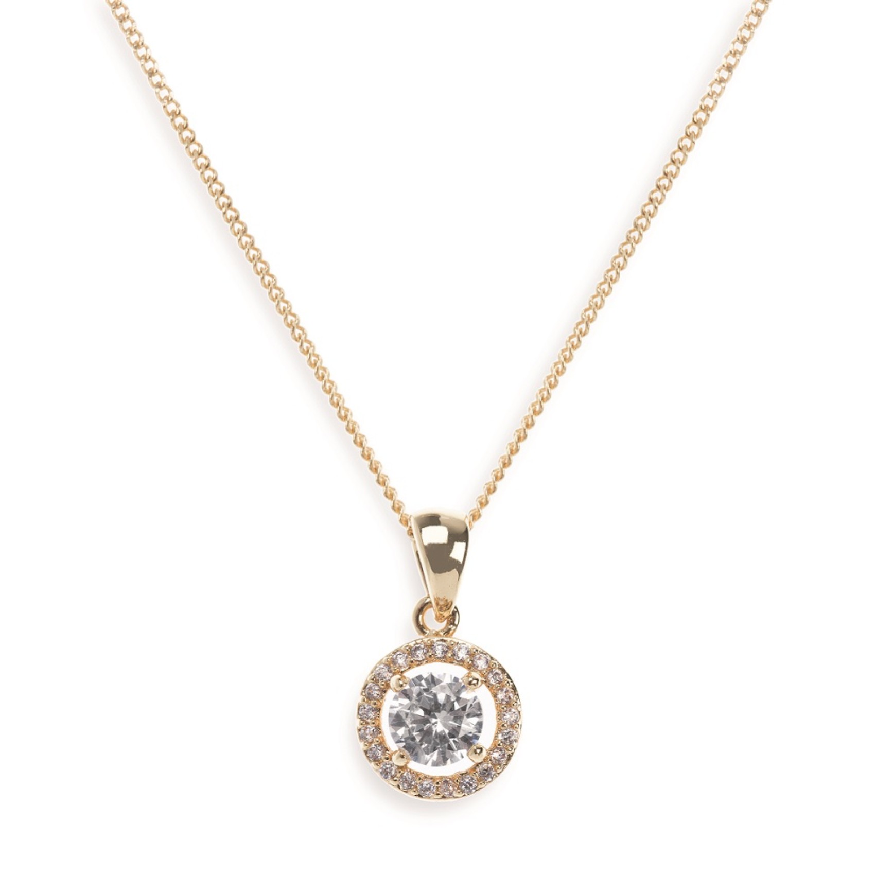 Una classica collana con ciondolo in cristallo d'oro con uno scintillio senza tempo. Questo delicato design presenta una pietra solitaria centrale ingabbiata in un cerchio di piccoli cristalli incastonati. Una collana con ciondolo, perfetta sia per le spose che per le damigelle d'onore.
