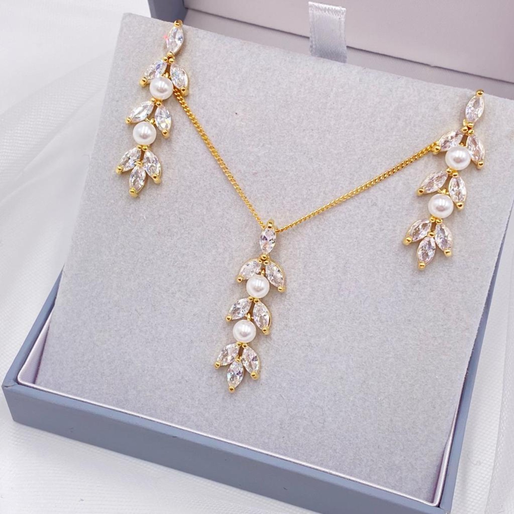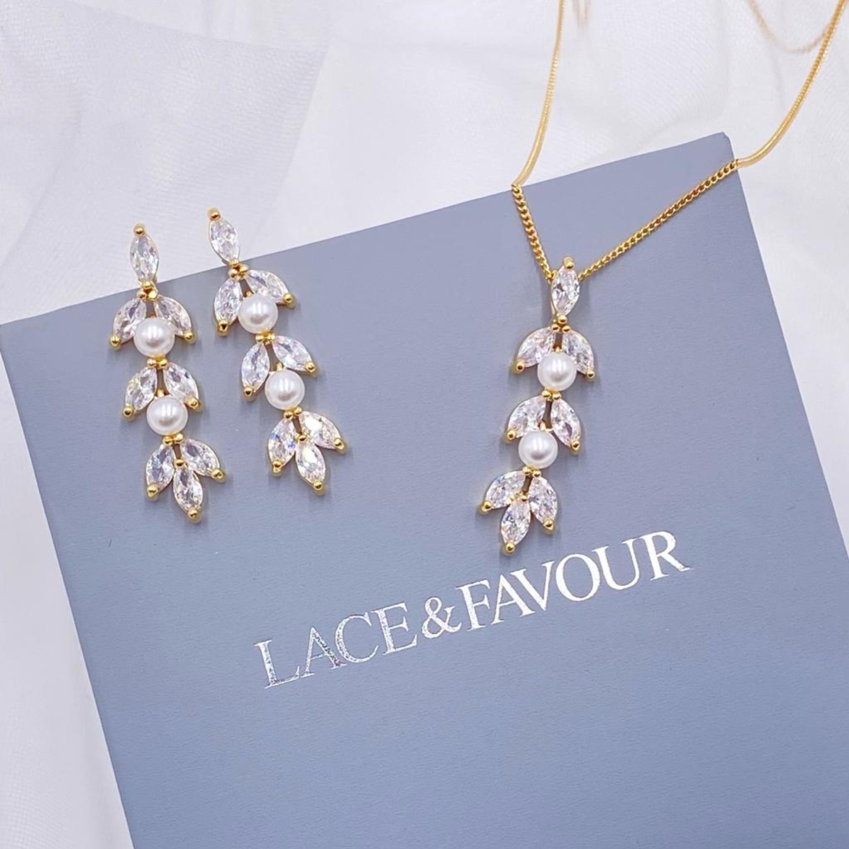 Siamo totalmente innamorati di questa delicata parure di perle e cristalli. Amalia presenta cristalli cubici di zirconia simili a foglie d'oro, intervallati da perle avorio scintillanti in un elegante design a goccia. Perfetta sia per le spose che per le damigelle.