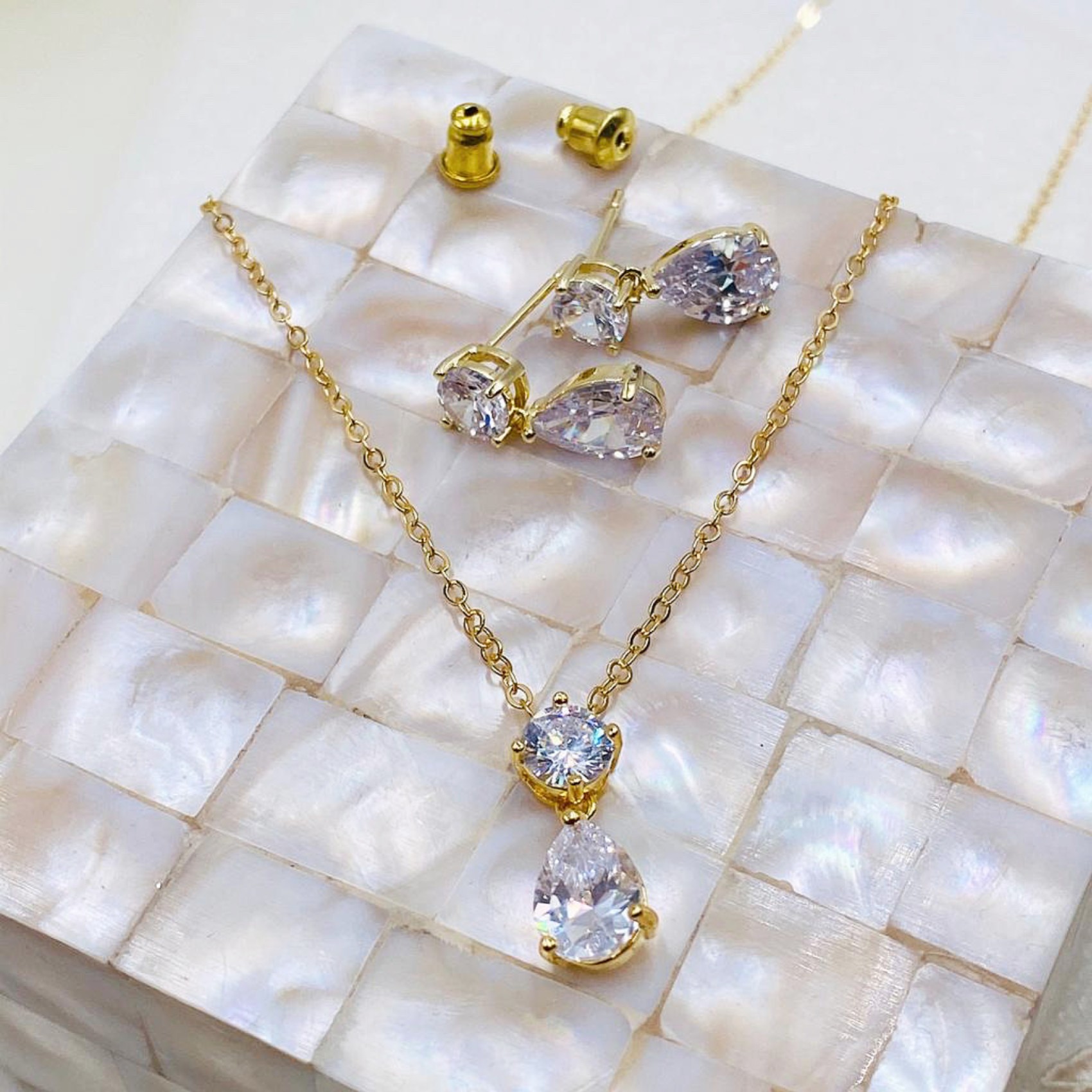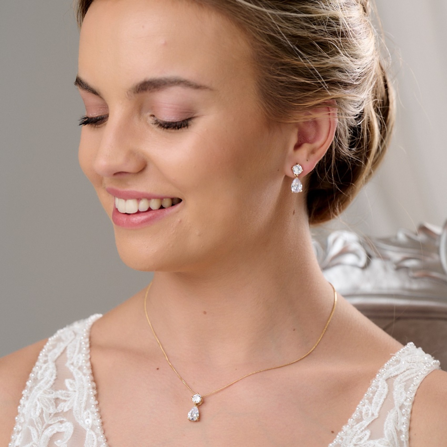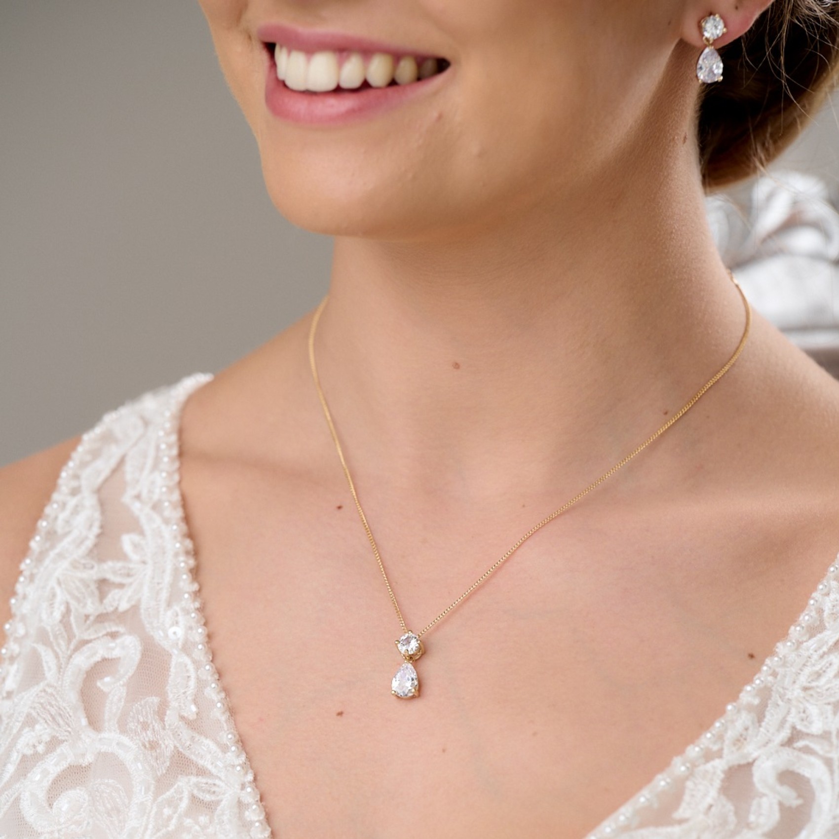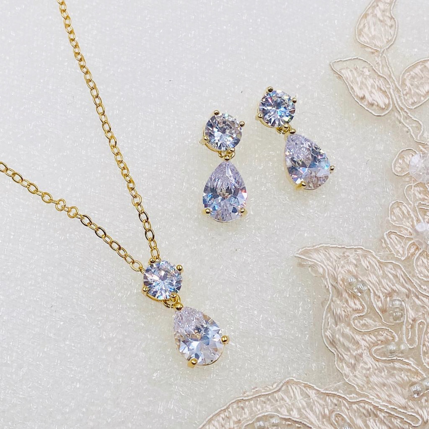 Un'intramontabile parure di gioielli da sposa in oro con orecchini a goccia in cristallo e un ciondolo abbinato. Impreziosita da scintillanti cristalli di zirconia cubica, questa parure di gioielli da sposa è perfetta per un look da sposa classico. Questo grazioso gioiello d'oro è anche uno splendido regalo per le damigelle d'onore.