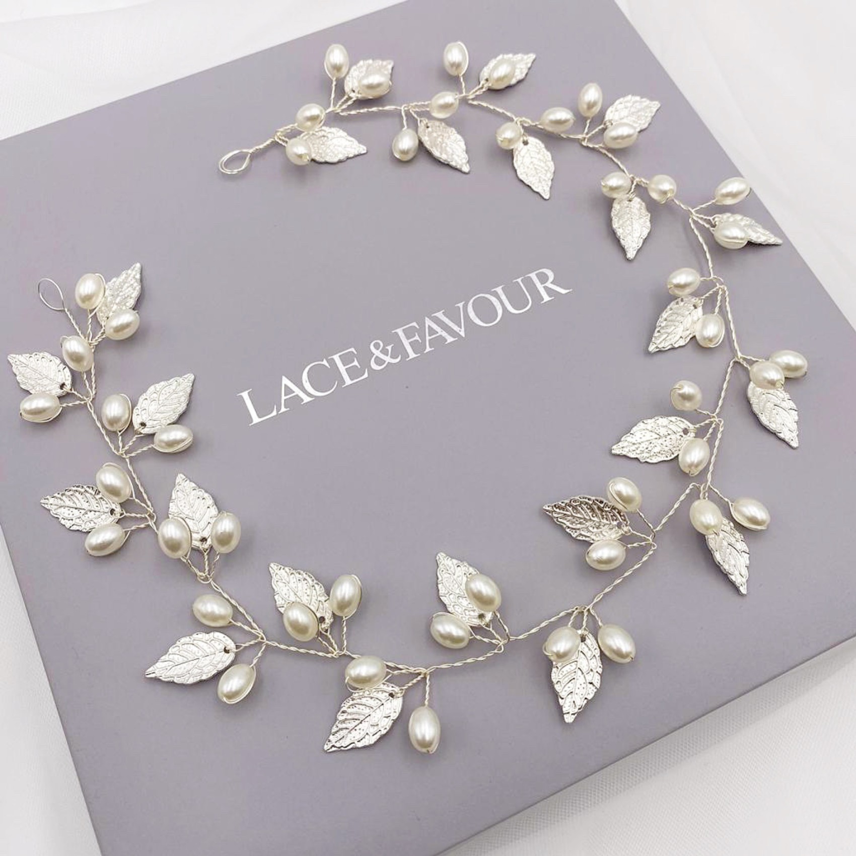 Ornato da delicate foglie argentate e luminose perle avorio, questo lungo filo floreale aggiunge un tocco di bellezza bohémien alle acconciature da sposa. Da indossare come aureola da sposa, intrecciato in una treccia o avvolto intorno a uno chignon. Si fissa tra i capelli con delle forcine utilizzando i piccoli occhielli di filo a ciascuna estremità. Un bellissimo copricapo da sposa per un matrimonio autunnale o in un bosco, questa piantina per capelli è perfetta per le spose che cercano un accessorio d'effetto ma delicato.