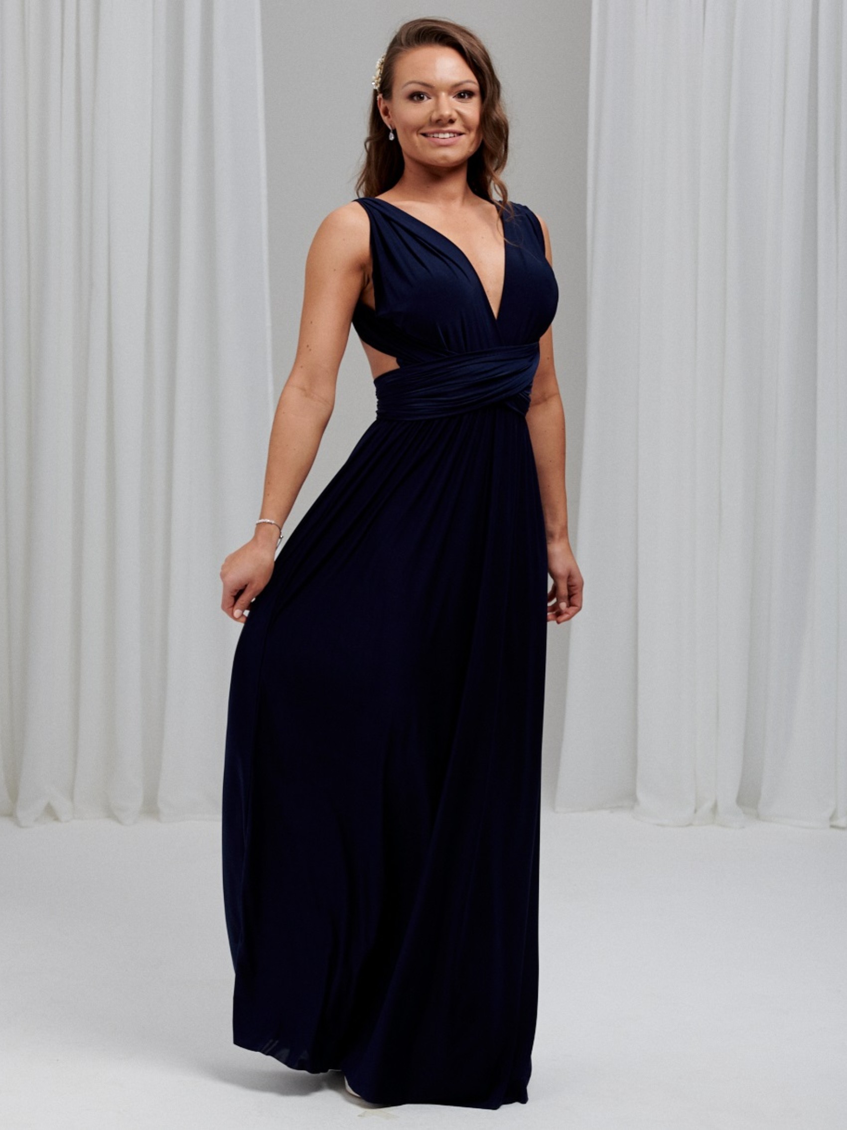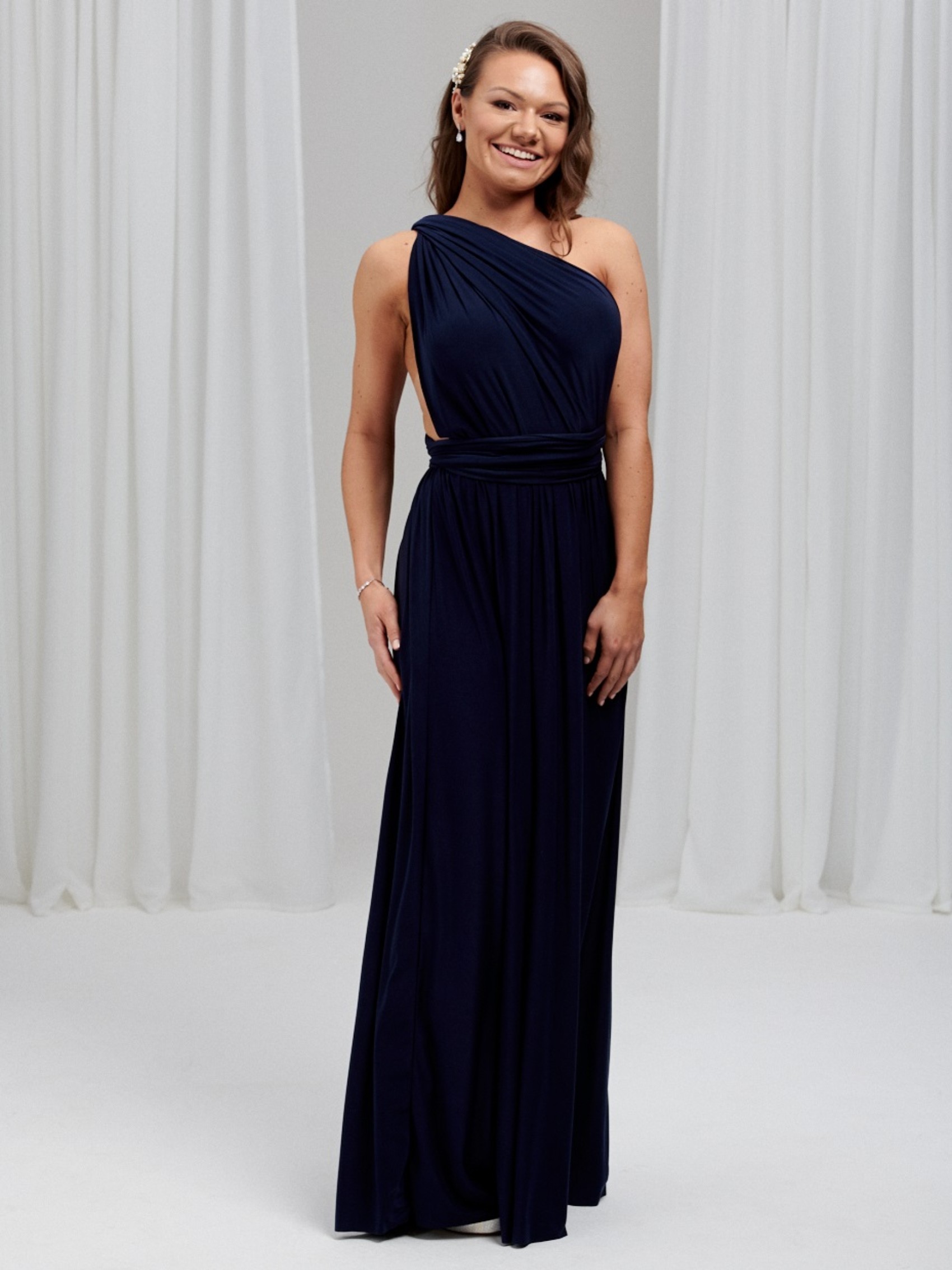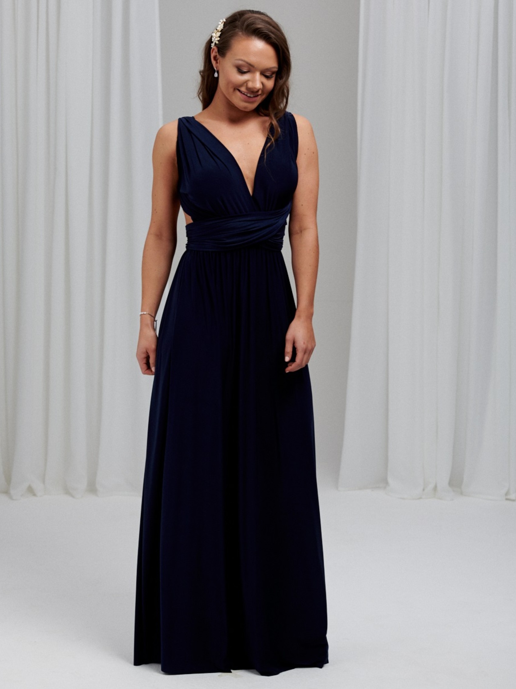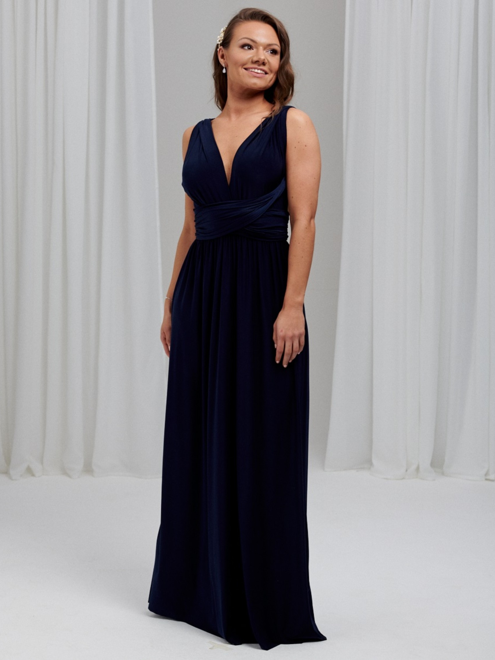Il nostro lussuoso abito da damigella multiway blu navy in stock è la soluzione perfetta per tutte le vostre damigelle. Realizzato a mano in tessuto elasticizzato e pesante per garantire il massimo comfort, questo maxi abito multidirezionale in taglia unica ha una sensazione di estrema morbidezza e può essere indossato in innumerevoli modi diversi per adattarsi a qualsiasi taglia e forma. Gli abiti da damigella Infinity sono perfetti per le spose che non sanno quale stile scegliere (si può letteralmente decidere la mattina del matrimonio!) Sono anche l'abito da damigella ideale per la maternità, poiché la fascia elastica in vita può essere posizionata sopra il pancione. Un colore classico e sofisticato per le damigelle.