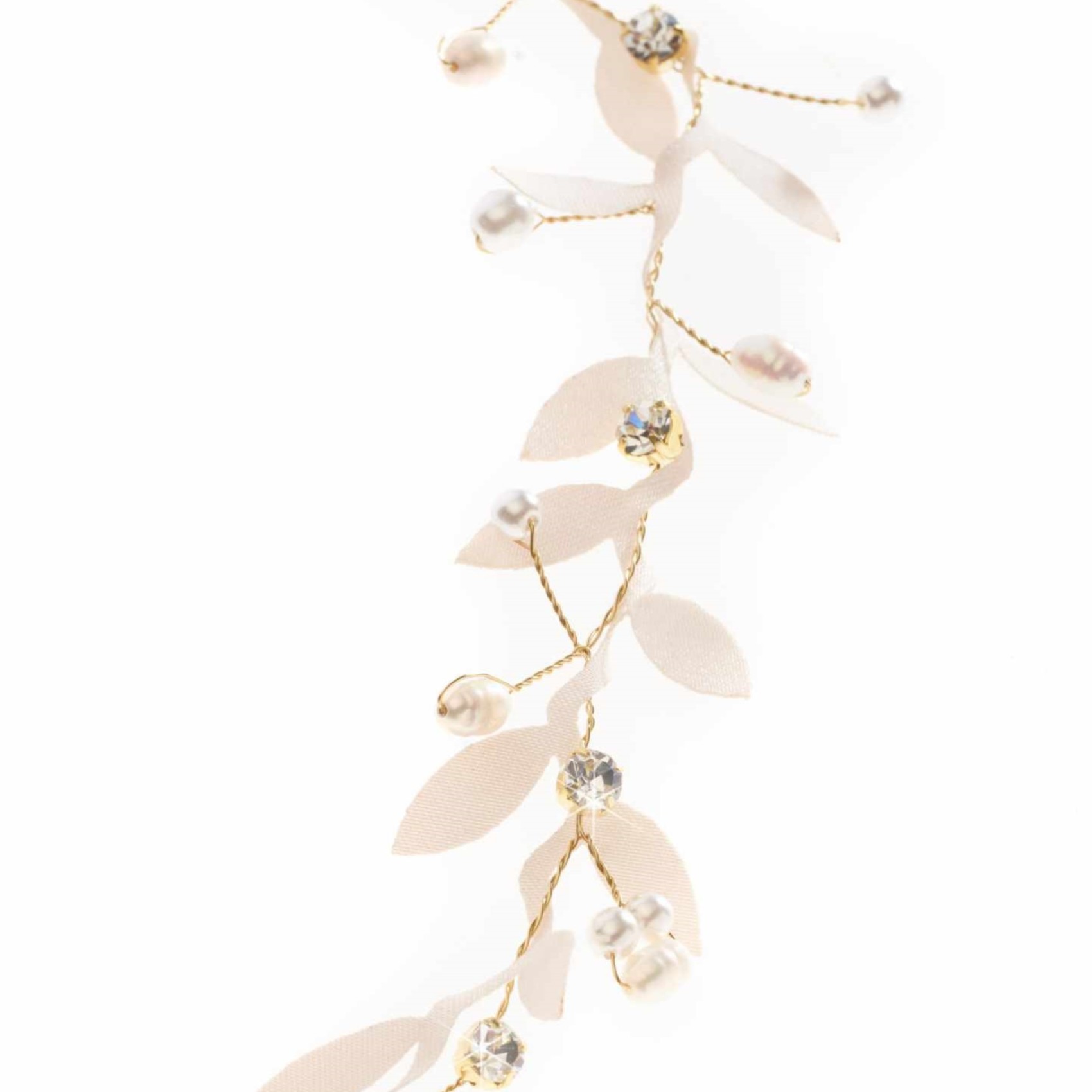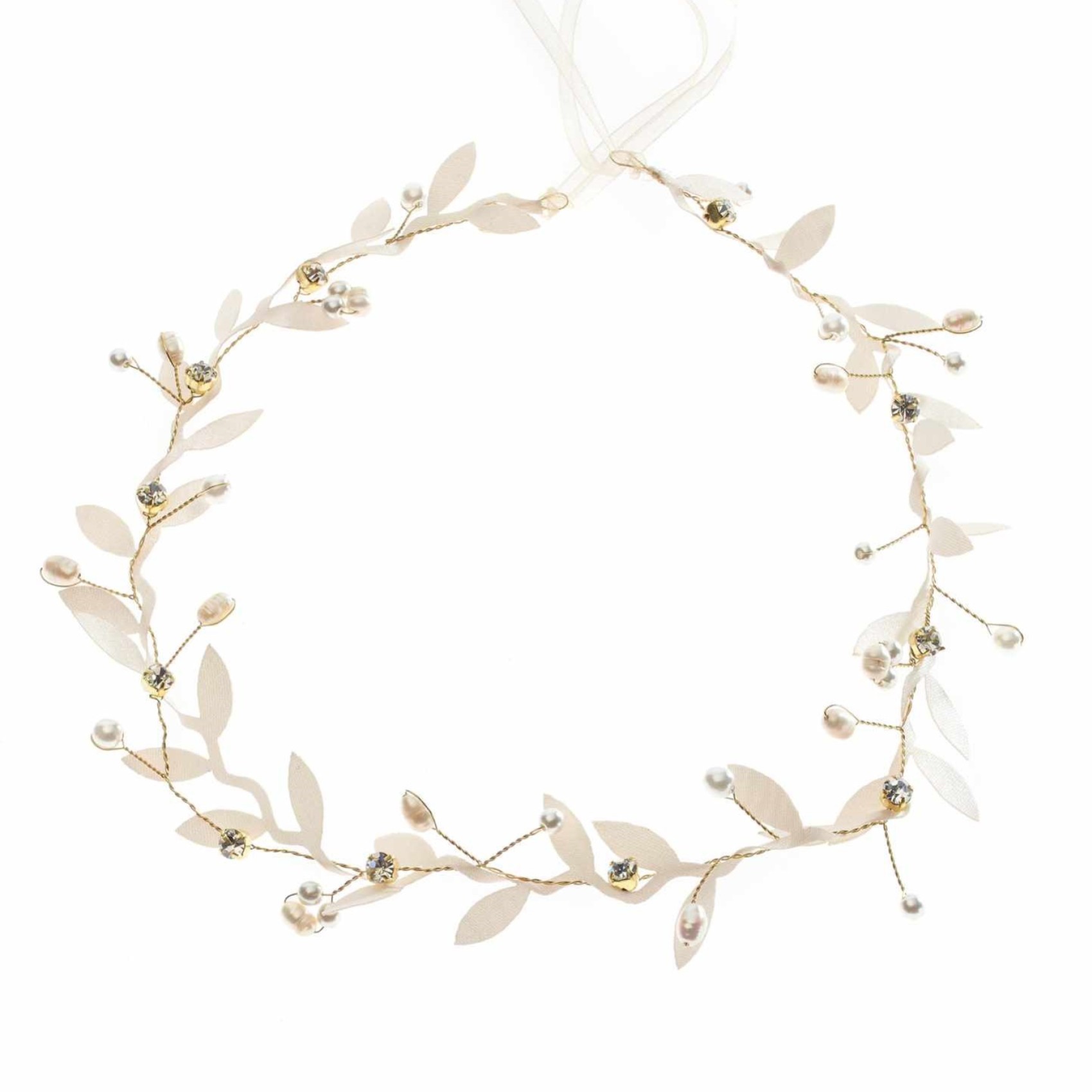 Realizzate uno splendido look da sposa boho con questo cerchietto con foglie d'oro. Realizzato con foglie di tessuto intrecciate con un filo dorato di perle e cristalli, rifinito con lacci di organza color avorio per fissare il copricapo. Perfetto per un matrimonio in stile bohémien in giardino, questo nastro può essere posizionato sulla fronte o leggermente più indietro come fascia per abbracciare la dea greca che è in voi nel grande giorno.