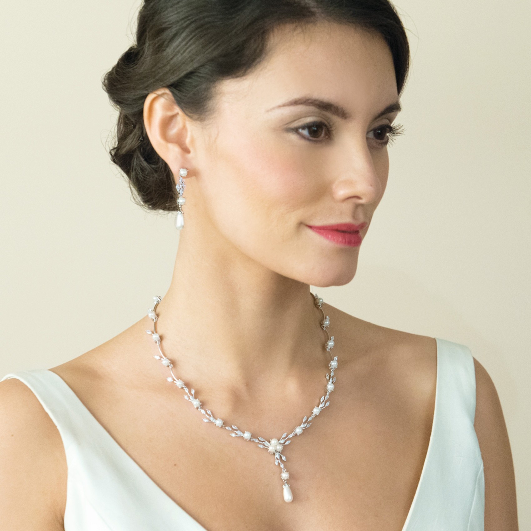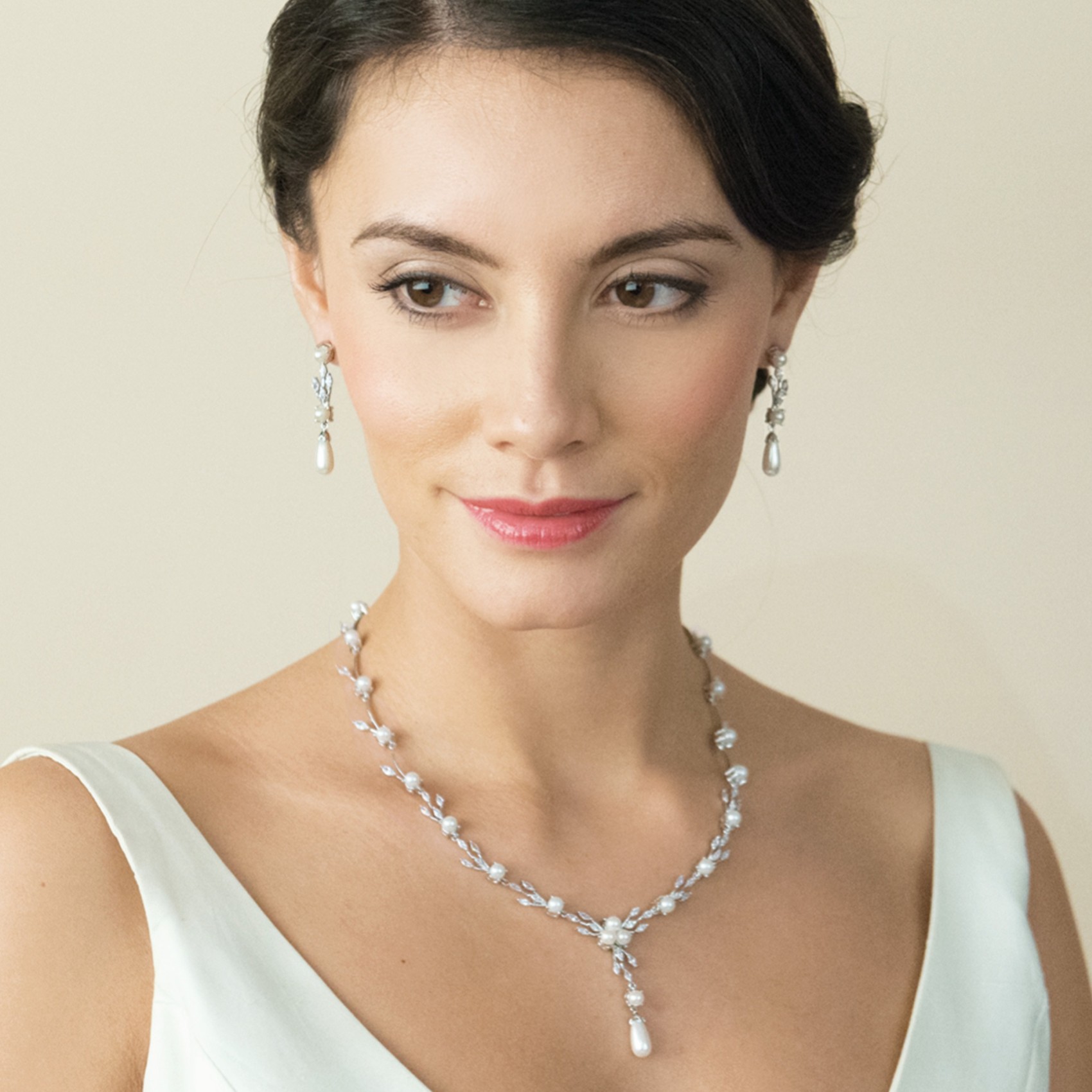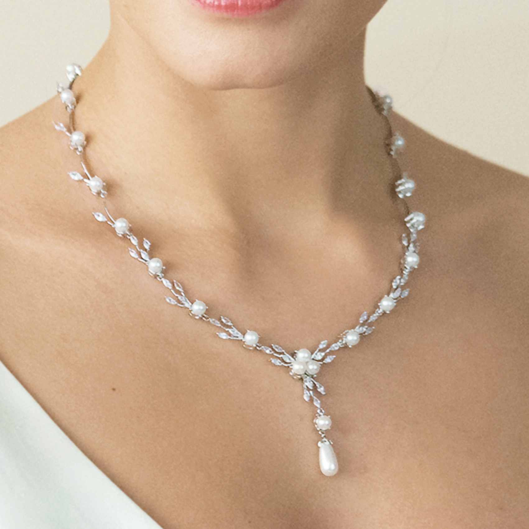 Ivory and Cola collana Belgravia è un complemento sofisticato per un look da sposa classico o vintage. Caratterizzata da perle finte color avorio e cristalli CZ marquise in una graziosa composizione a vite, rifinita con una splendida goccia centrale. Il design di questa collana da sposa valorizza magnificamente una scollatura a cuore o a V.