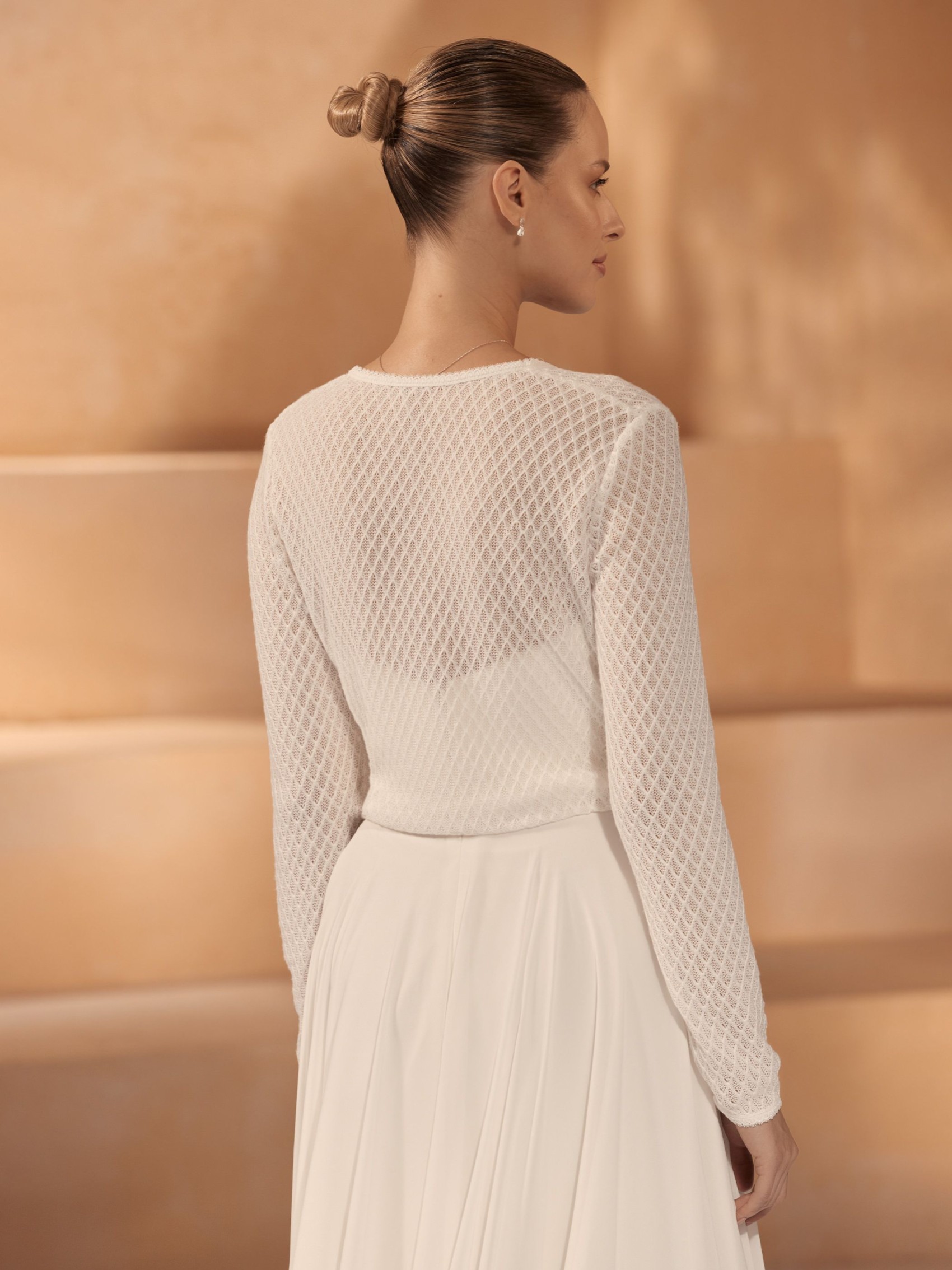 Splendido cardigan da sposa con scollo a V aperto, maniche lunghe e laccetti sul davanti. Realizzato in un delizioso tessuto a maglia fine con un attraente motivo a rombi, questo elegante copricostume è perfetto per un matrimonio autunnale o invernale.