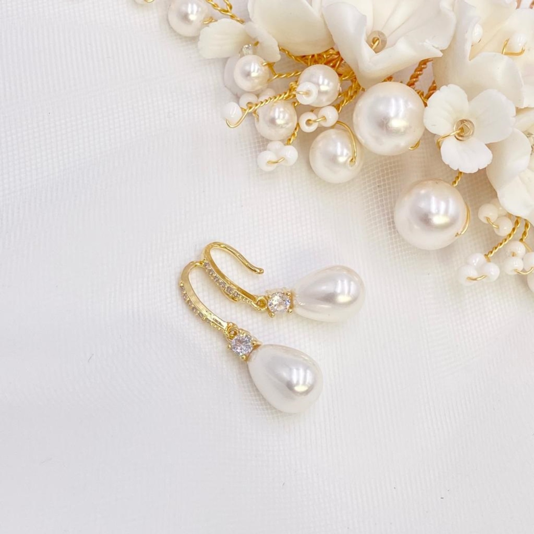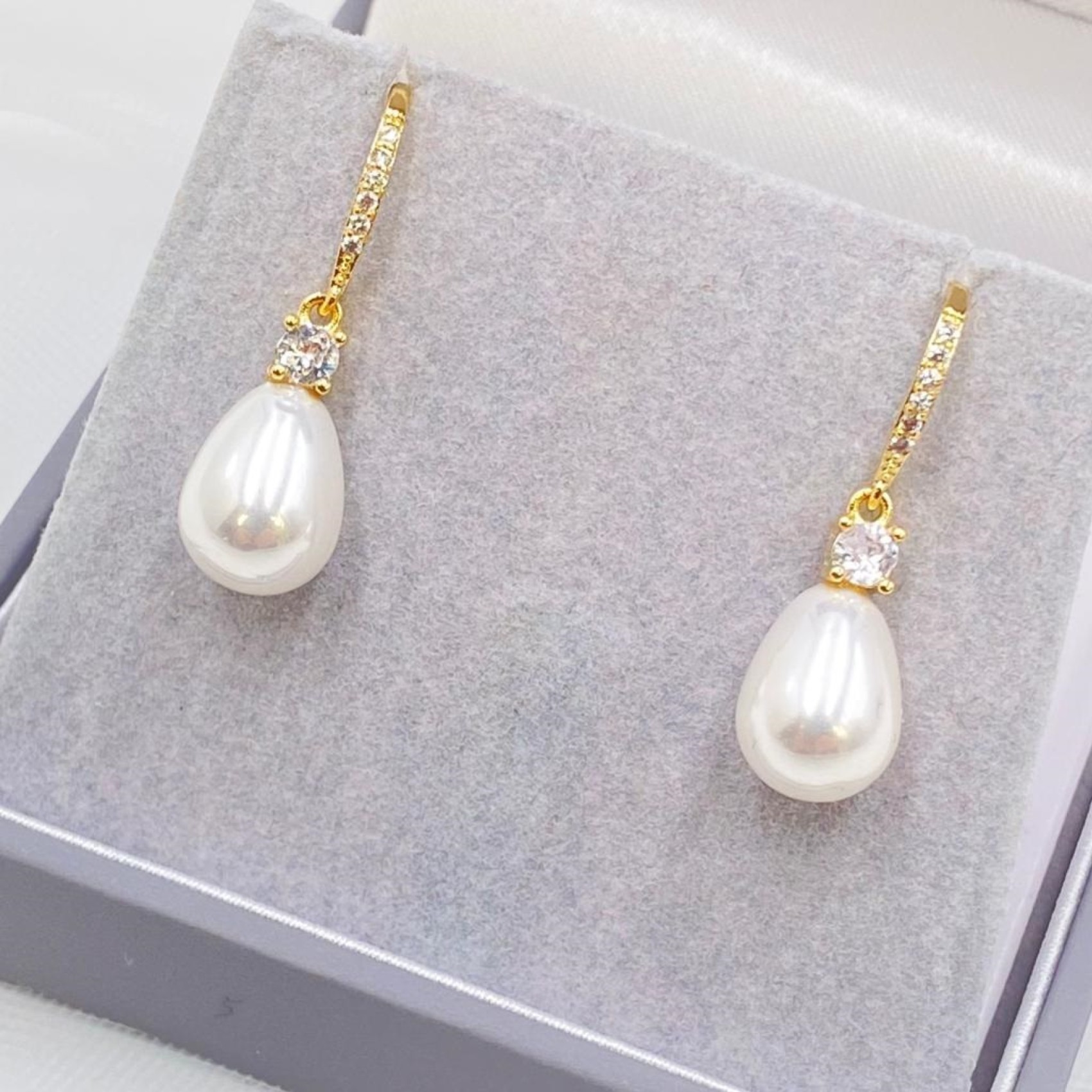 Perle a goccia e cristalli scintillanti sono sospesi da supporti a leva placcati oro impreziositi da cristalli in questo delicato paio di orecchini da sposa. Una bella scelta per spose e damigelle.